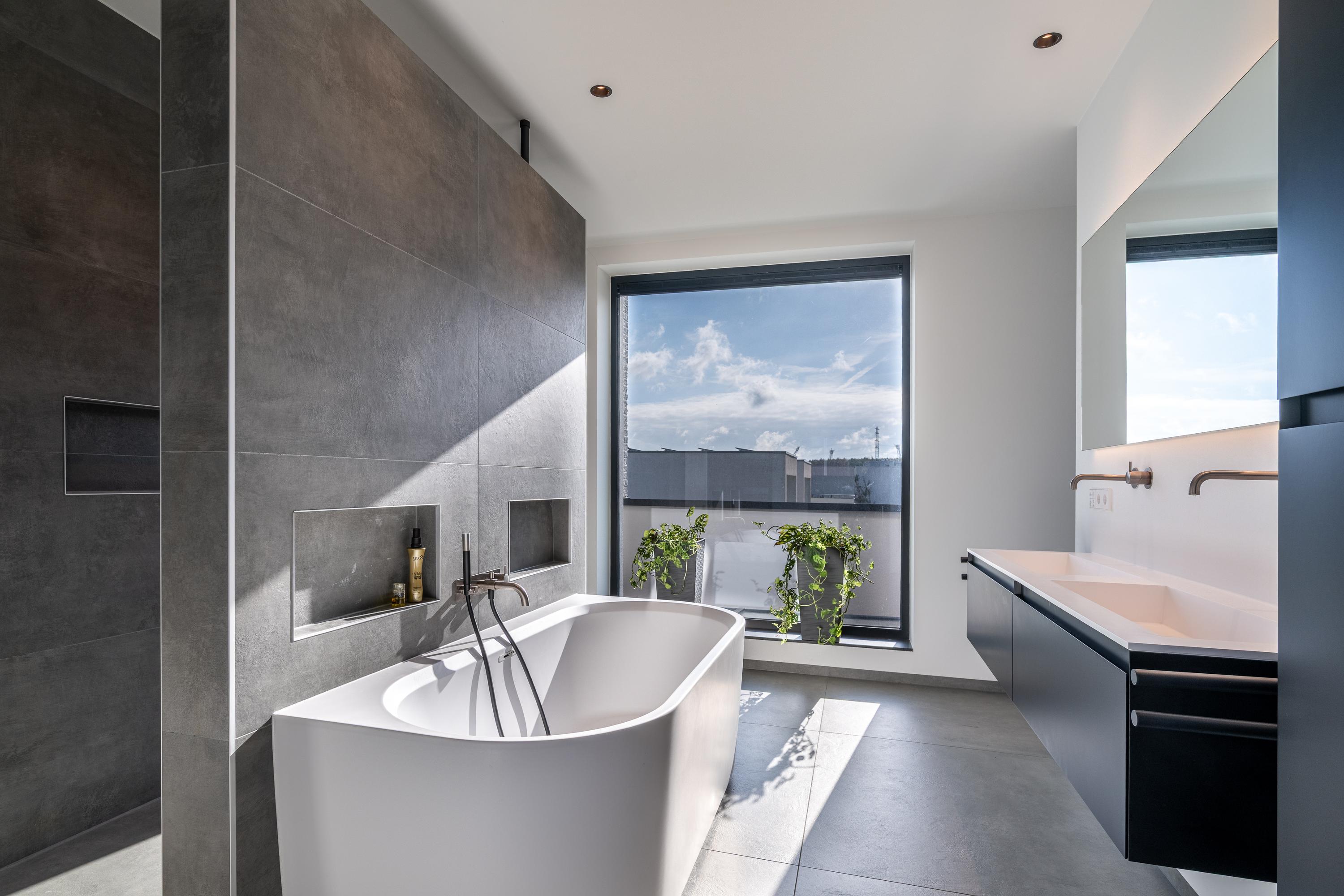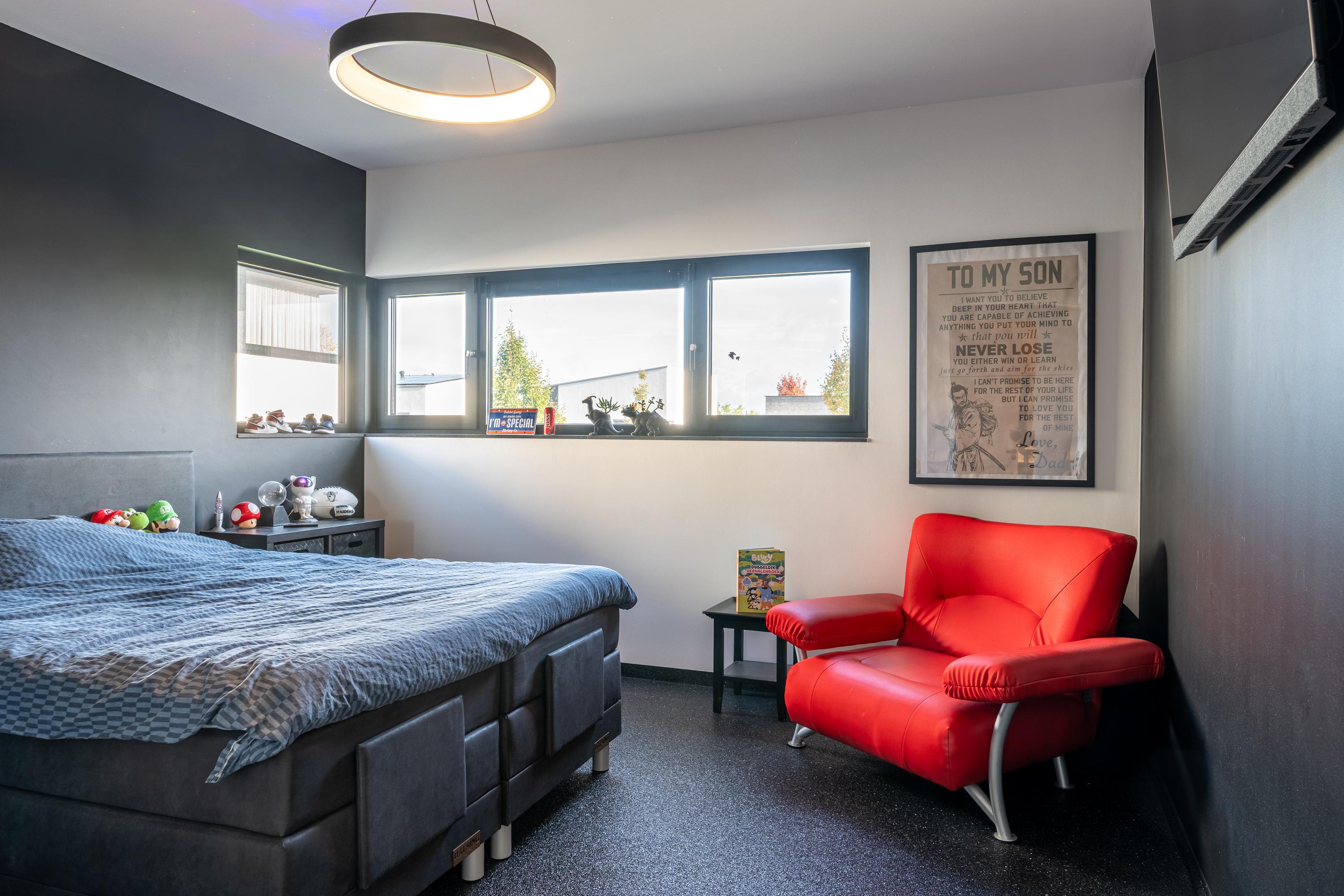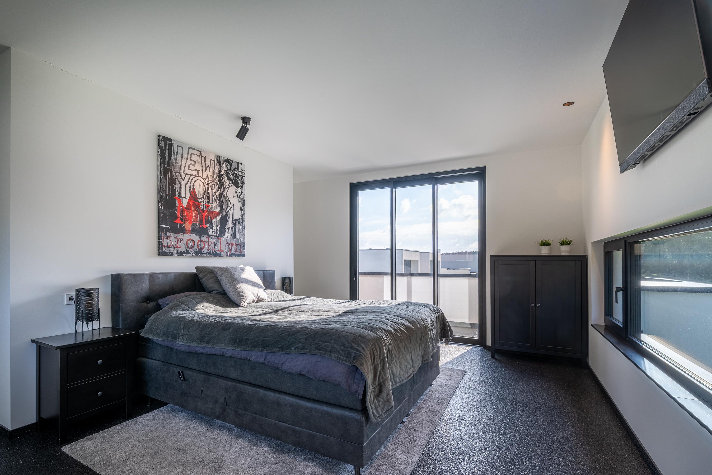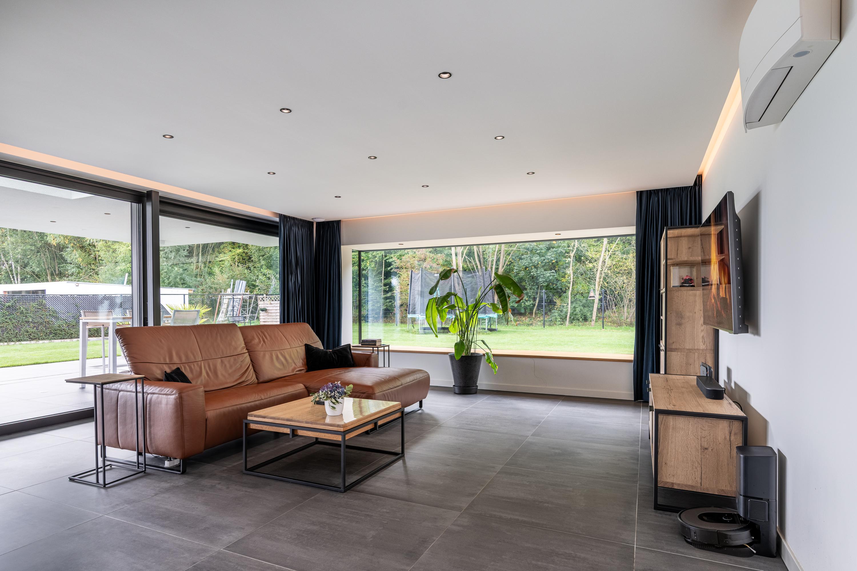 A special detail is the large flower window, which provides a playful view of the garden and the edge of the forest. In combination with the large sliding doors to the covered terrace, this creates a spacious and open whole, in which inside and outside flow harmoniously into each other. The living room and kitchen are both equipped with an air conditioning unit.