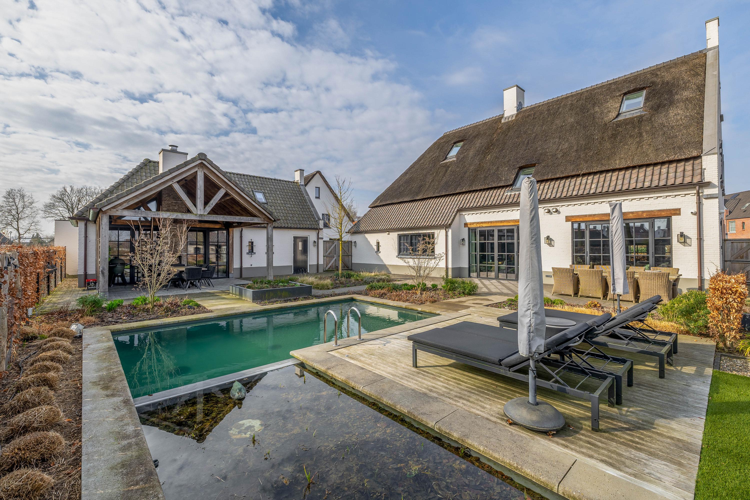 This farmhouse offers you a rare opportunity to live in an oasis of luxury, comfort, and privacy. With attention to detail, high-quality materials, and a thoughtful layout, every floor showcases a cohesive design where ceramic tiles, an oak herringbone floor, and meticulously applied stucco unite to form a warm and elegant whole. The seamlessly coordinated materials and finishes give every space a refined, consistent look.