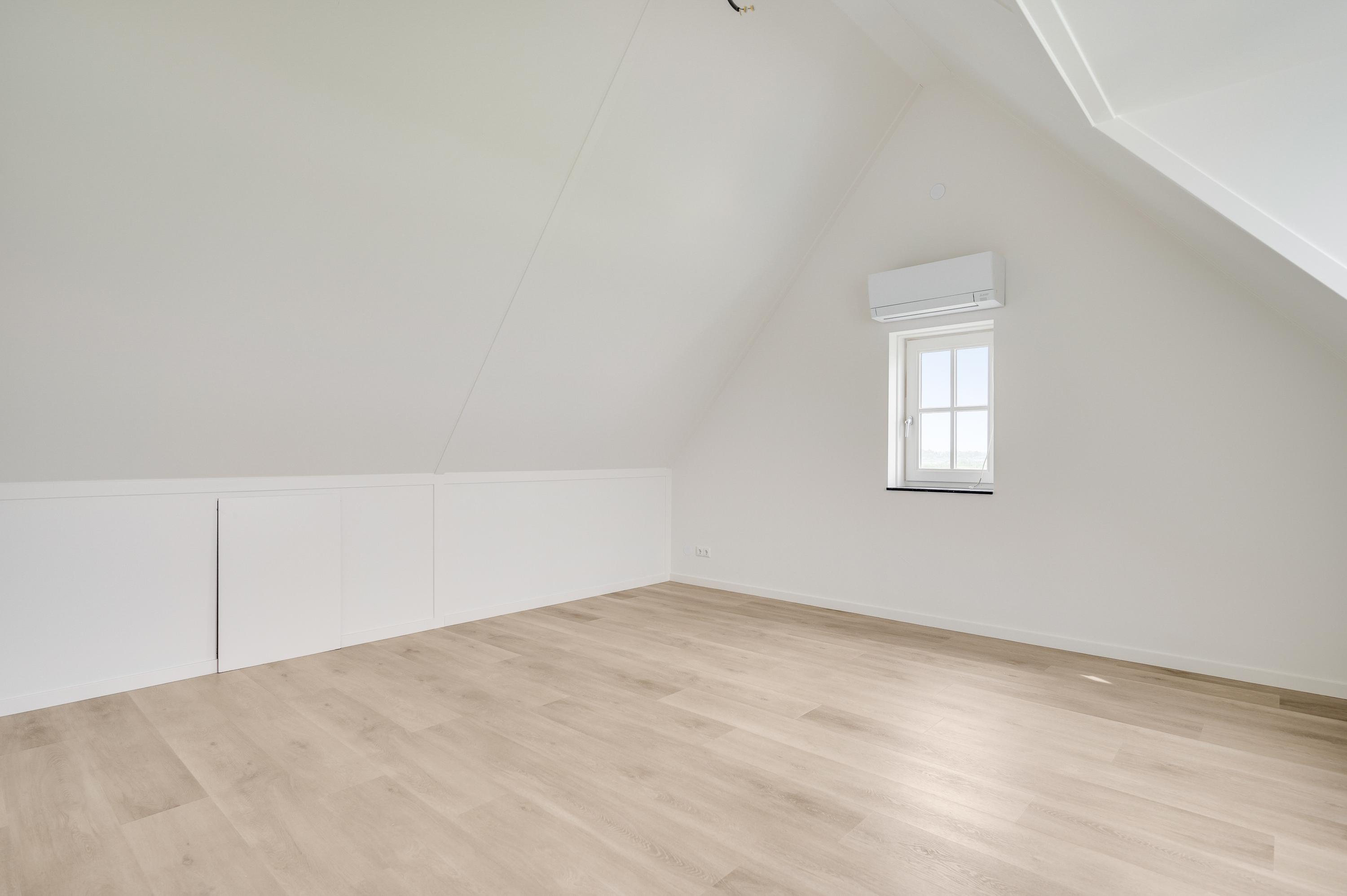 On the L-shaped second floor with high ceilings and a dormer window you will find bedroom 3 and 4. Both rooms are spacious and overlook the water. The third bathroom is also located here, which has a walk-in shower, sink and toilet. Finally, you will find the technical room here, where you will also find white goods connections.