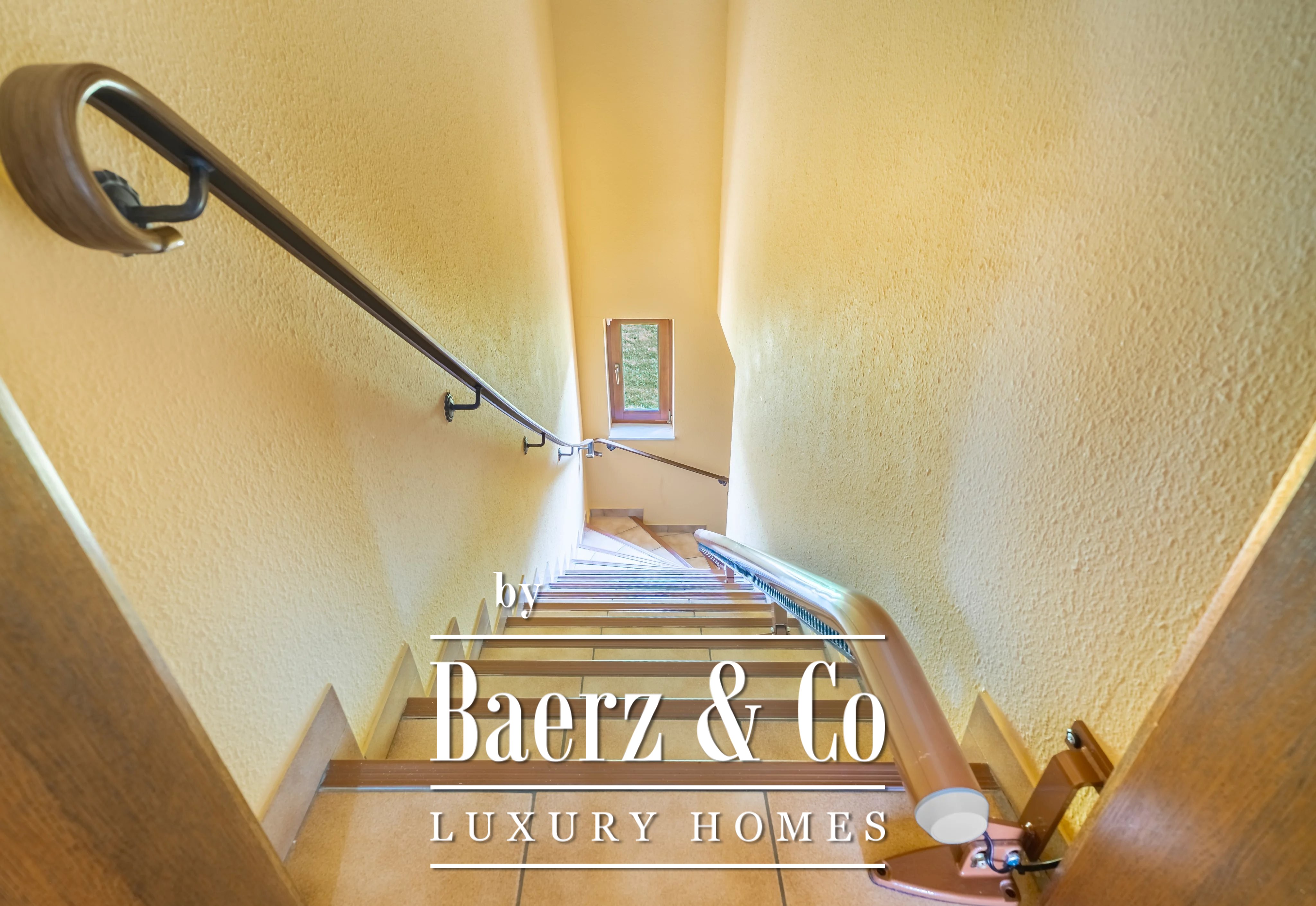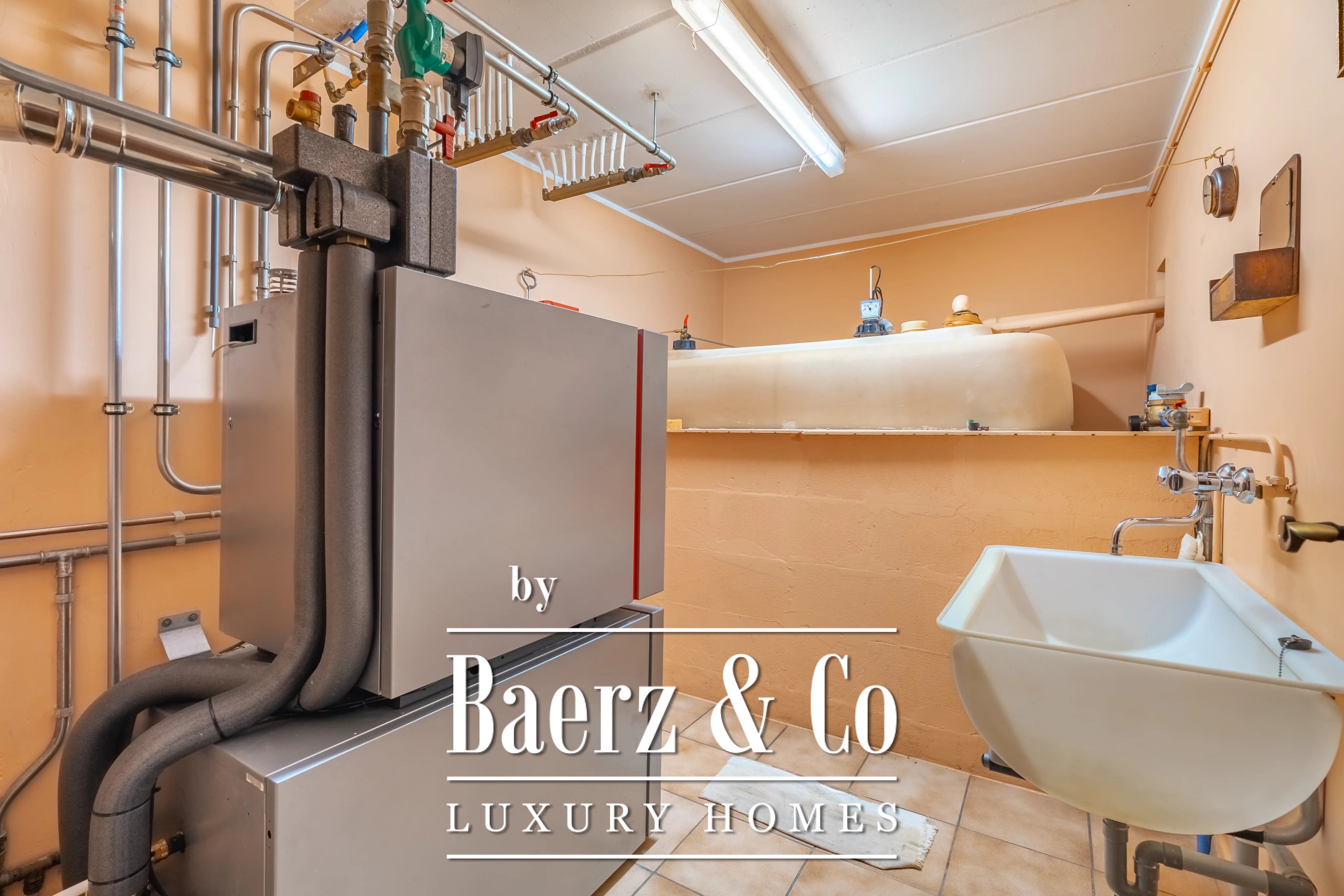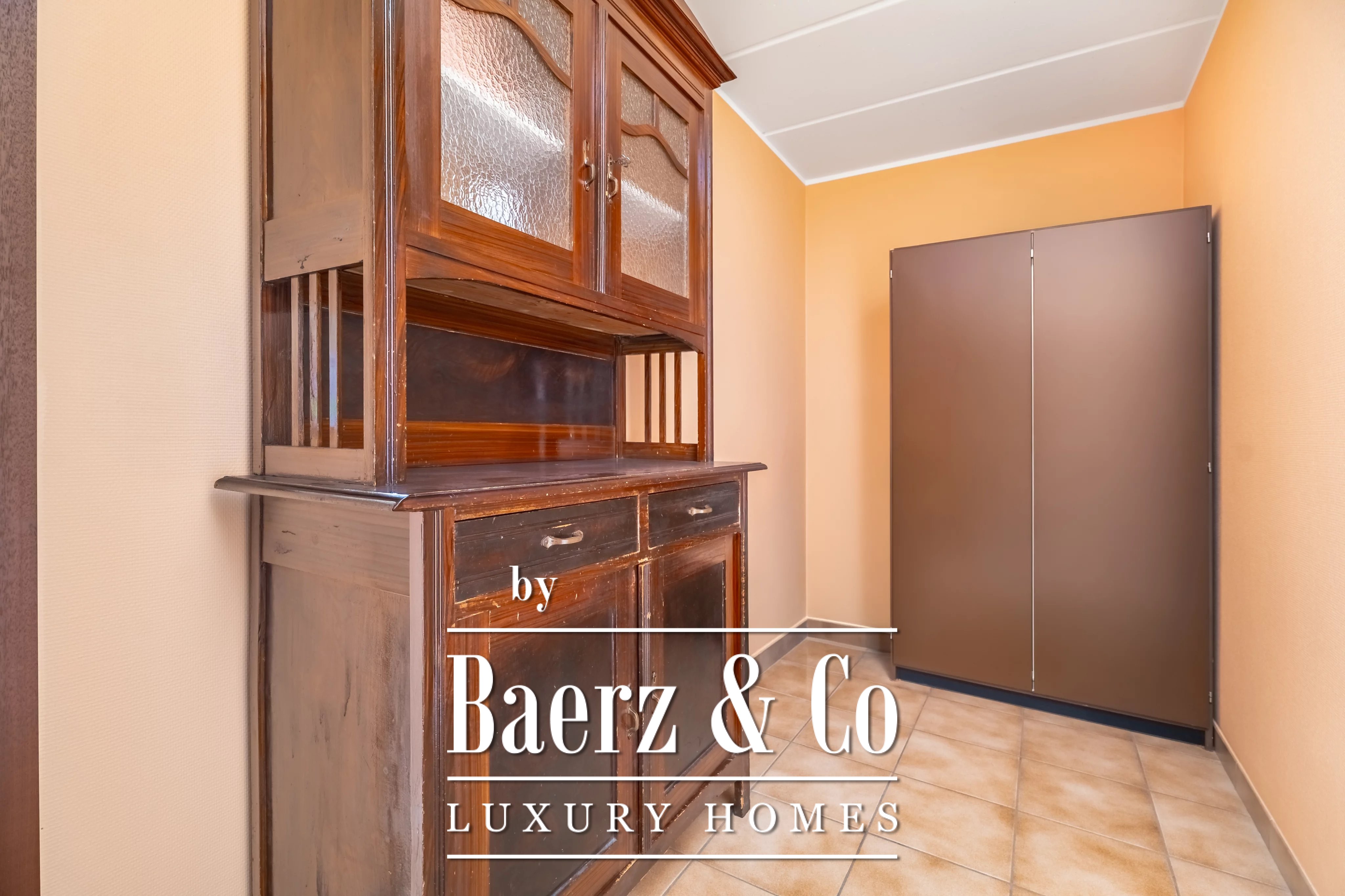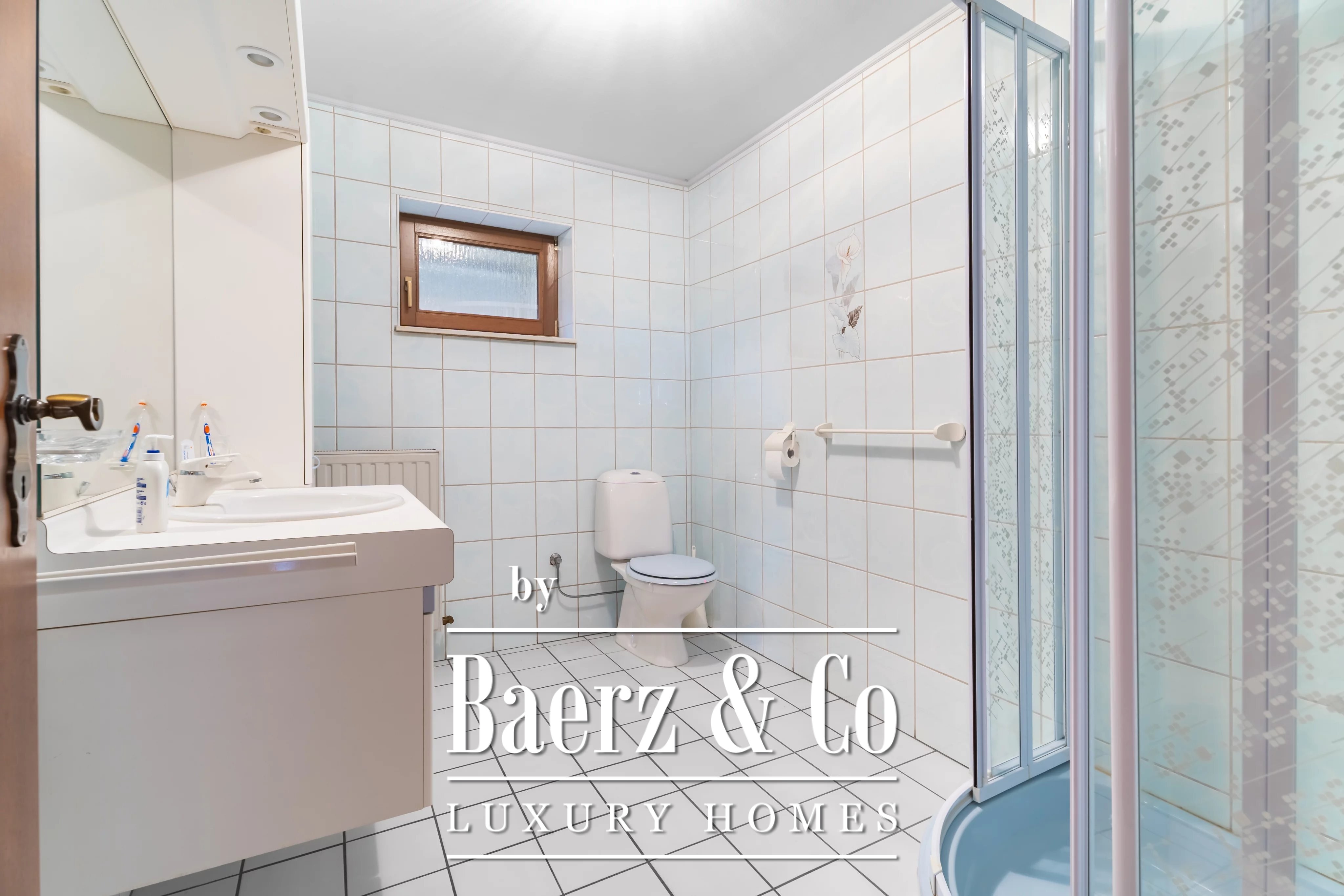 Arranged across multiple levels, the property features five bedrooms and two bathrooms. The basement accommodates a 34.80 m² garage, multiple storage spaces, and three bedrooms, ensuring flexibility and convenience. The first floor unfolds into a 16.70 m² entrance hall that leads to a light-filled living and dining space of 30.87 m², accompanied by a fitted kitchen of 18.35 m², utility room, and two further bedrooms. A separate WC and bathroom reflect thoughtful planning. The attic provides an additional 30 m² of unfinished space, inviting future adaptation.