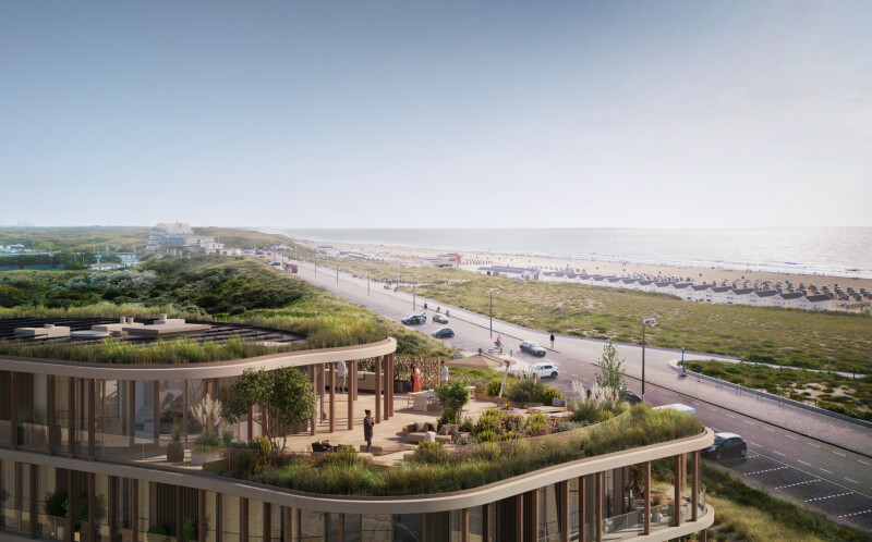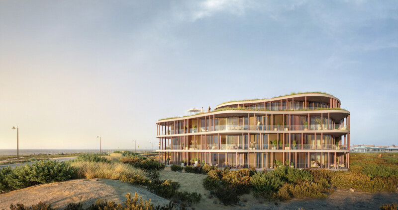 The penthouse is part of Het Duinpaviljoen, a high-quality residential building with 14 luxury flats, all with orientation to the sea, beach and dunes.The use of natural materials, the swaying shape of the building and the large, individual terraces on which the dune landscape seems to run through, brings the special design of Duinpaviljoen into serene harmony with its surroundings.