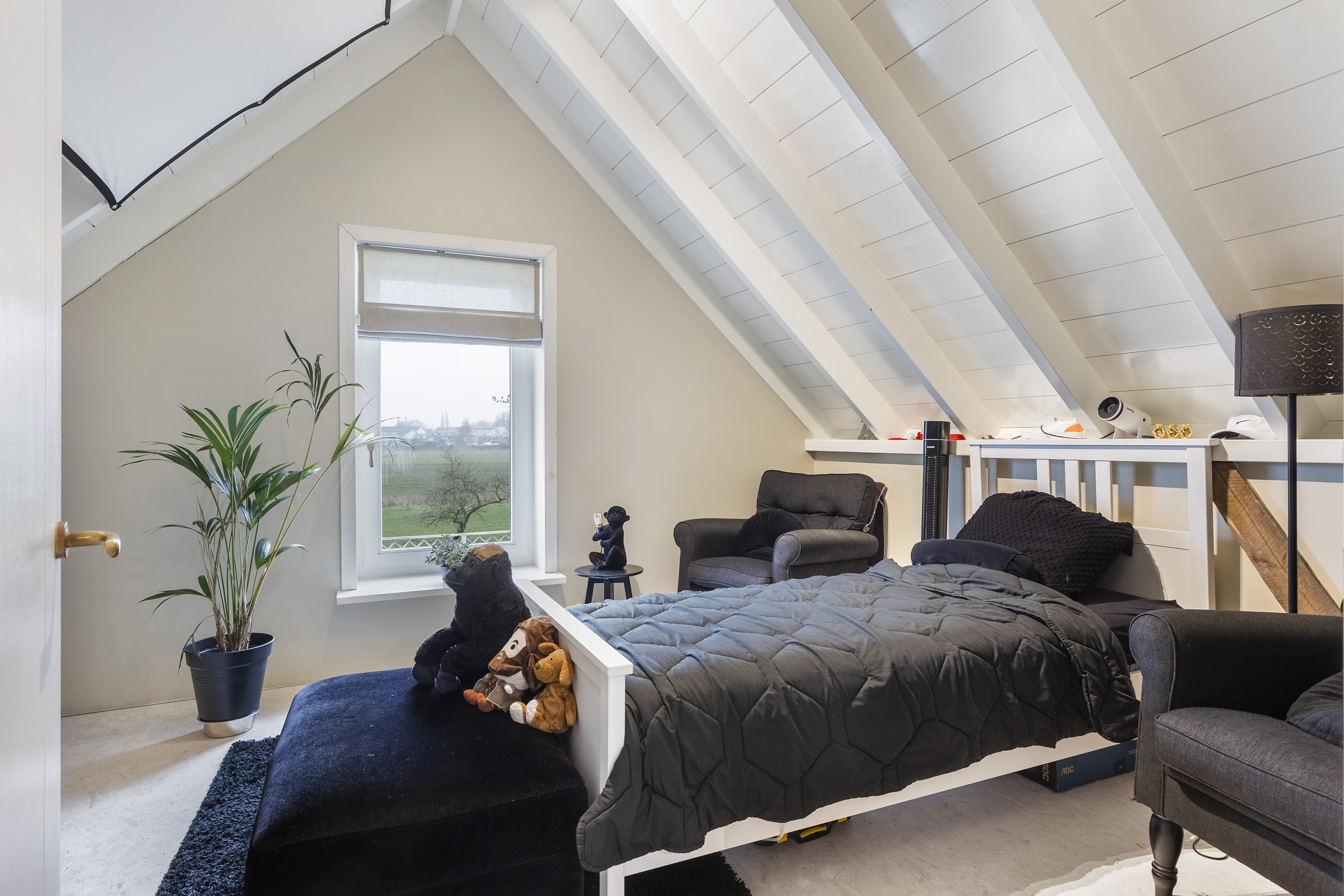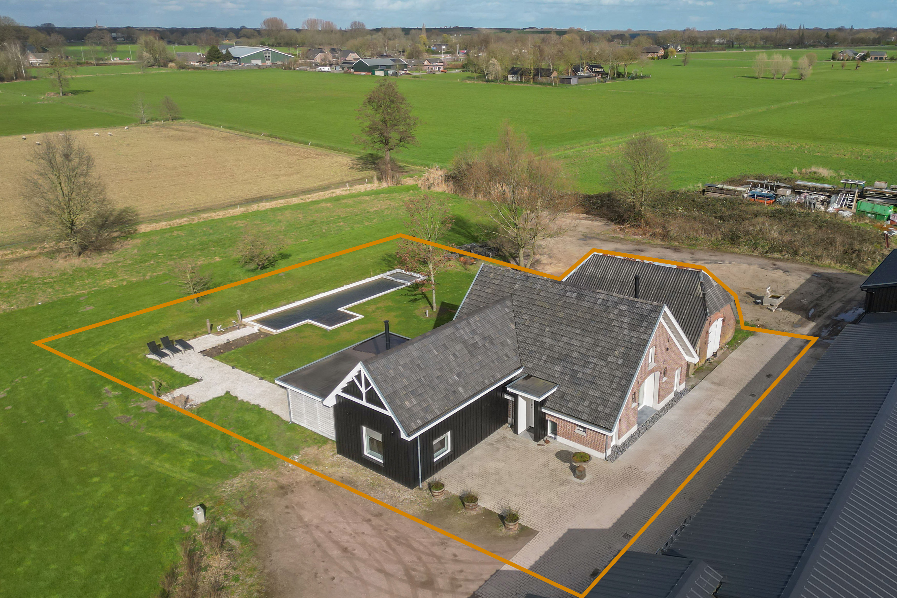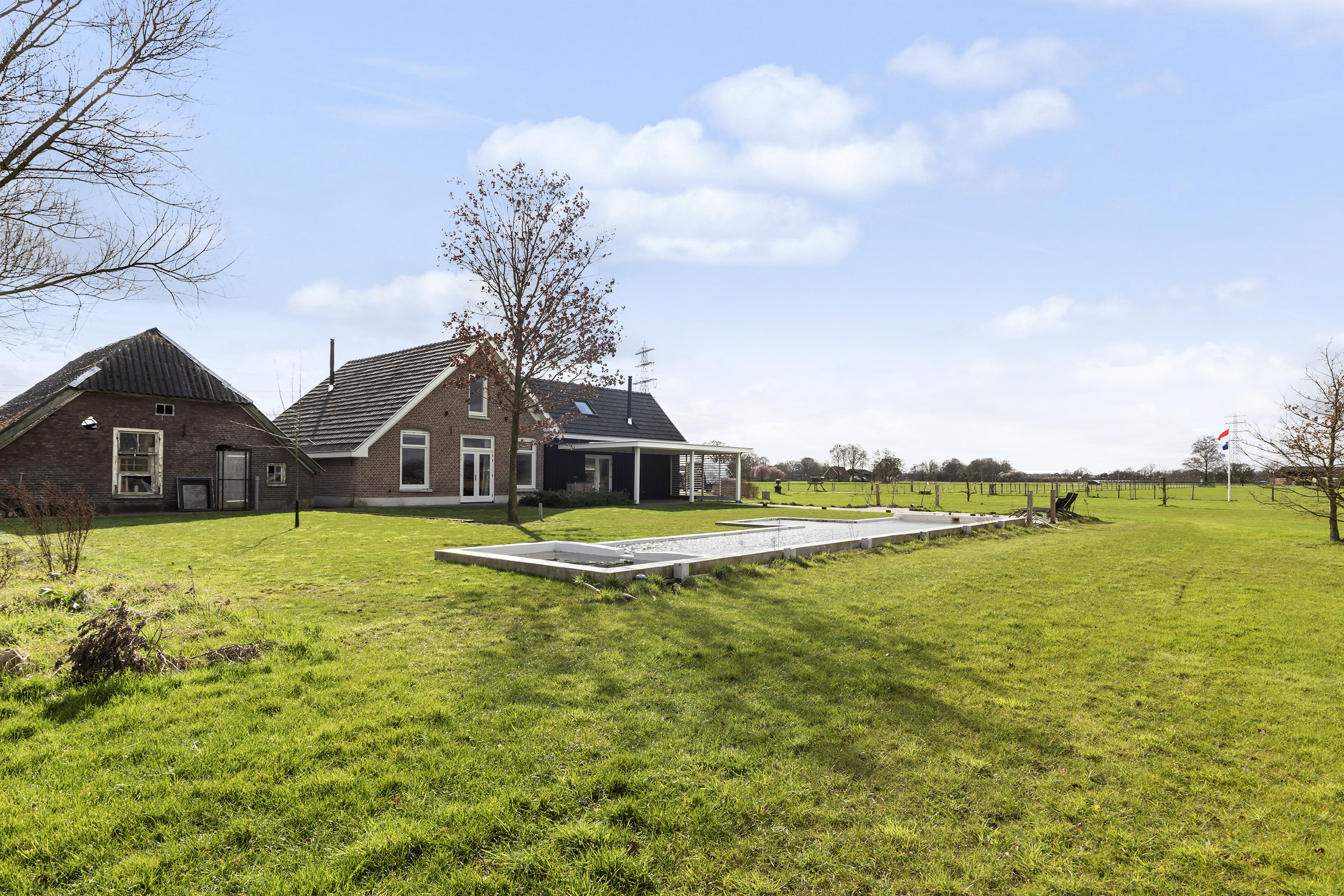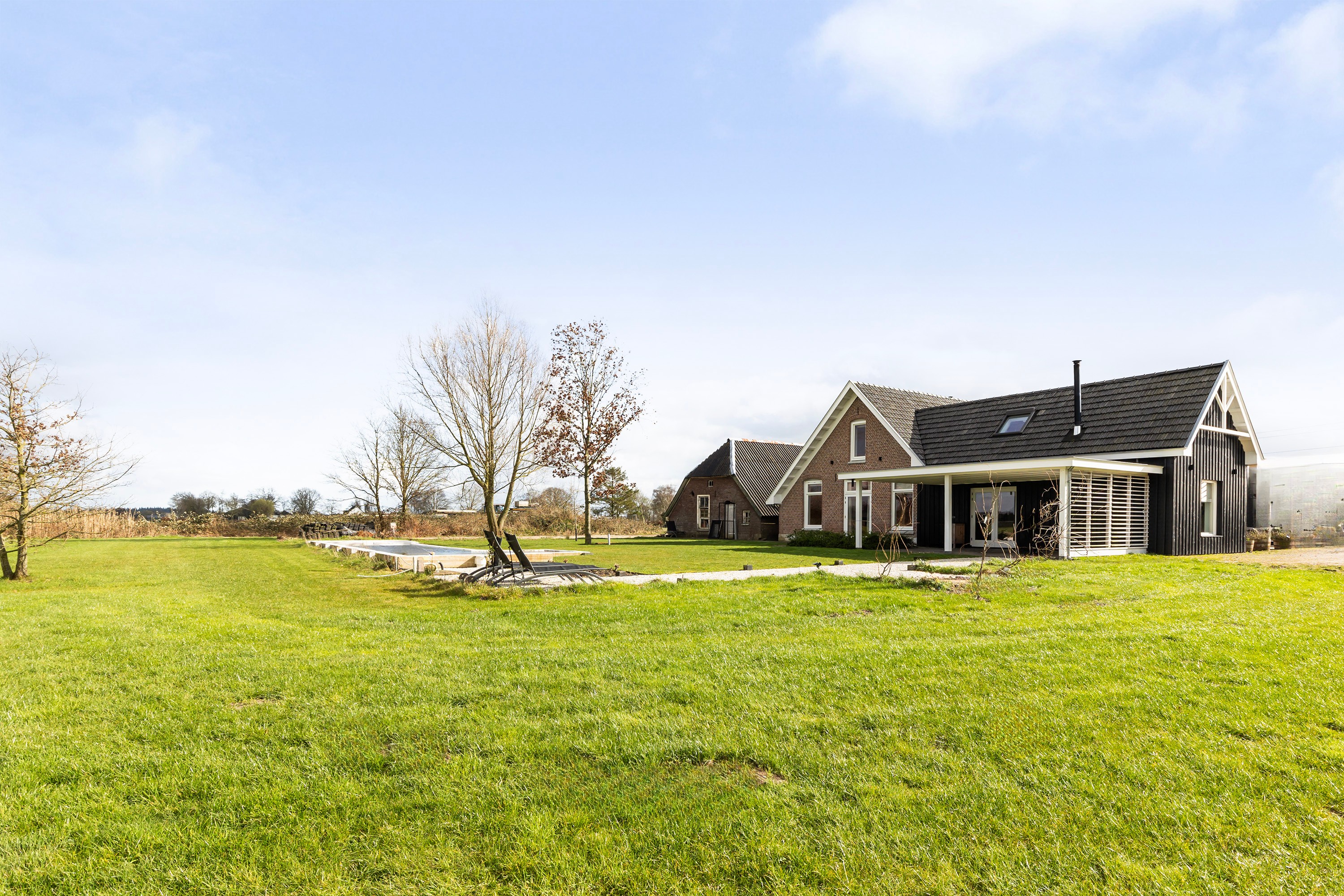 The farmhouse stands on approximately 2,500 m² of private land and forms part of an exclusive rural estate of around 4 hectares, designed in accordance with a thoughtfully implemented landscape and nature plan. Here, you enjoy wide, open views, mature greenery and a remarkable sense of freedom, without the responsibility of maintaining the surrounding grounds.