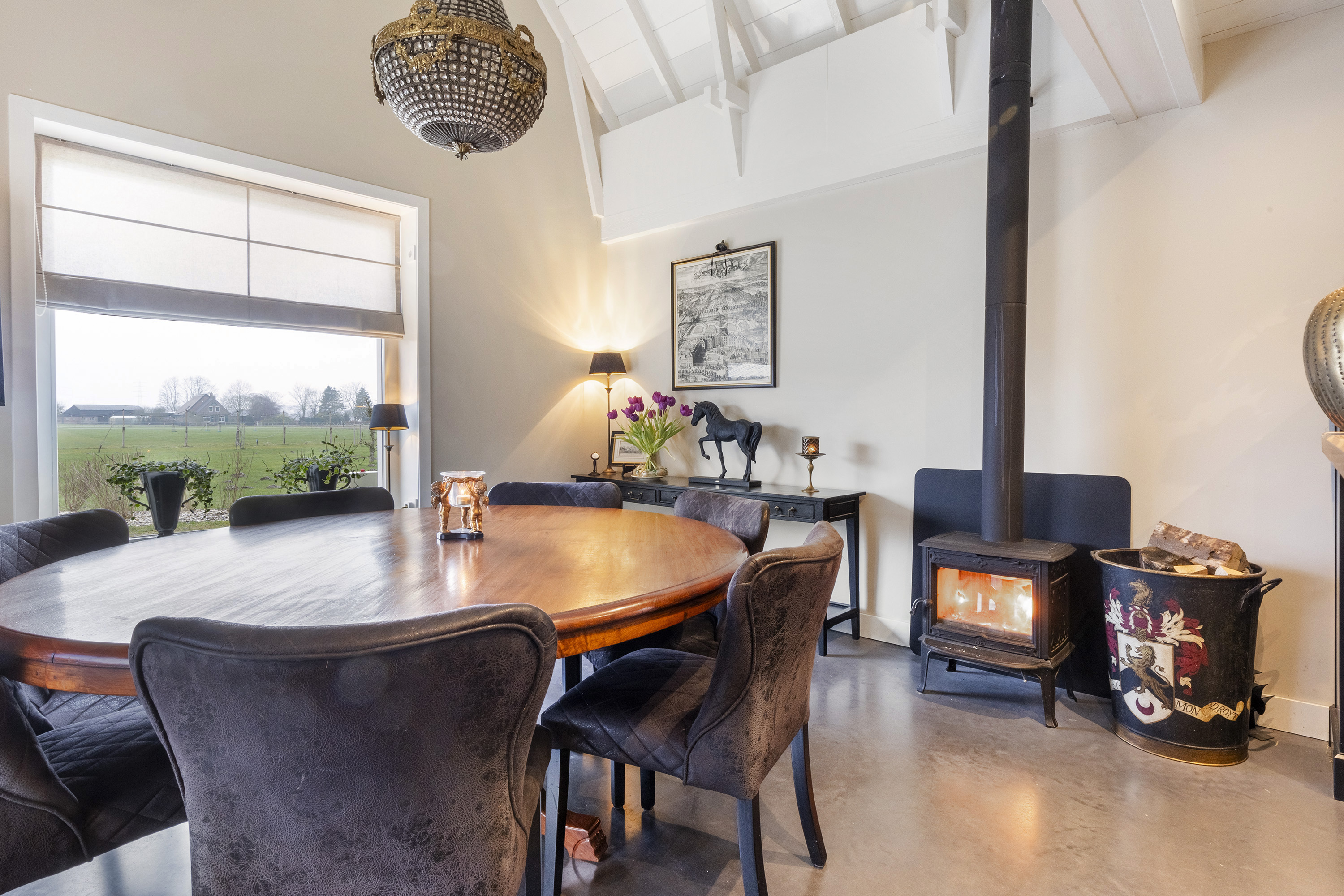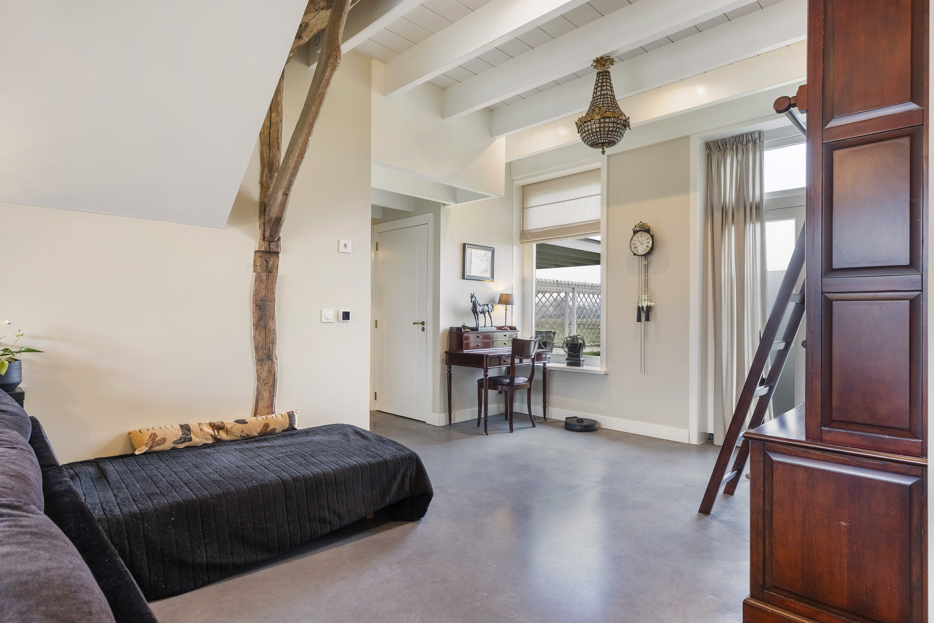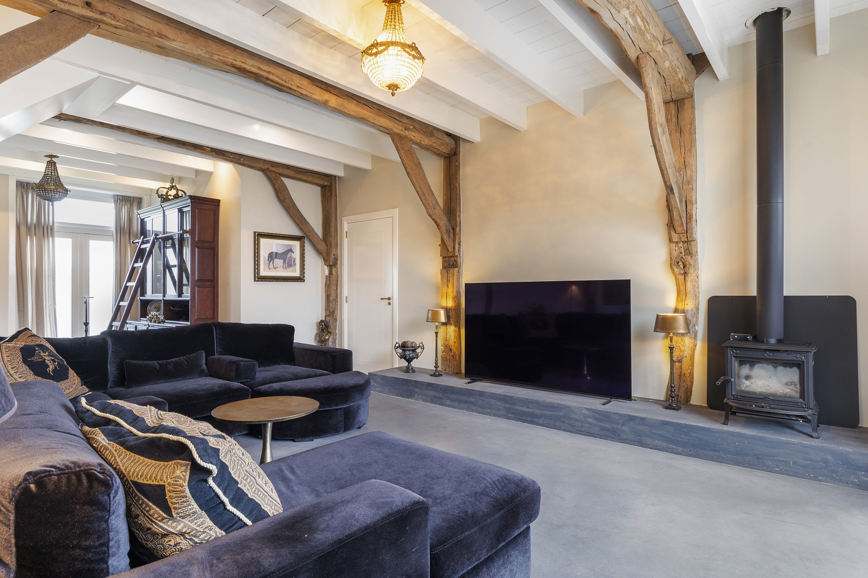 The living room is equally spacious and is characterised by a beautiful combination of white-painted timber ceiling beams, robust structural beams and a polished concrete floor. The wood-burning stove and French doors to the garden create a seamless connection between indoor and outdoor living. The room comfortably accommodates multiple seating areas, offering flexibility in layout.