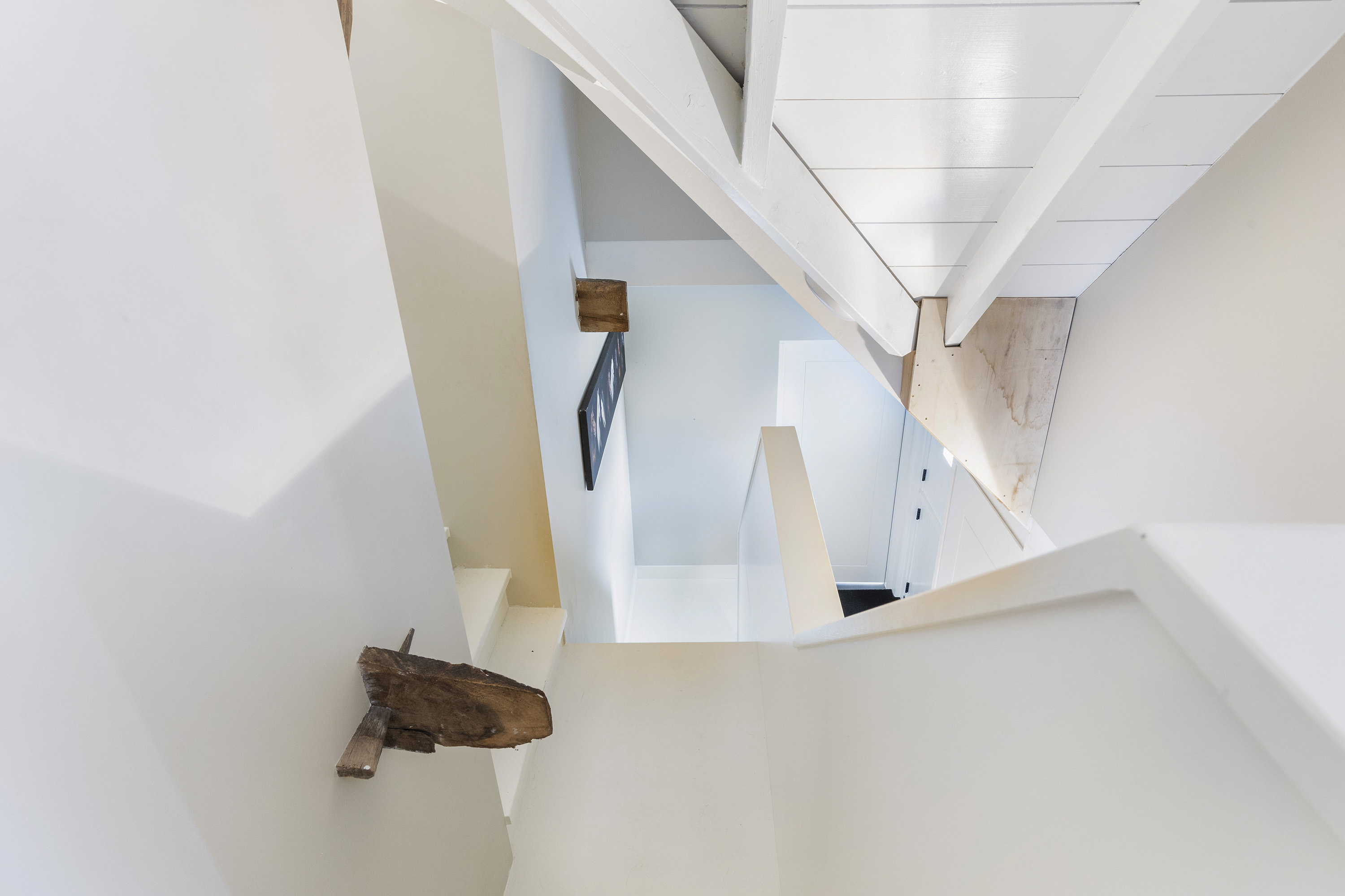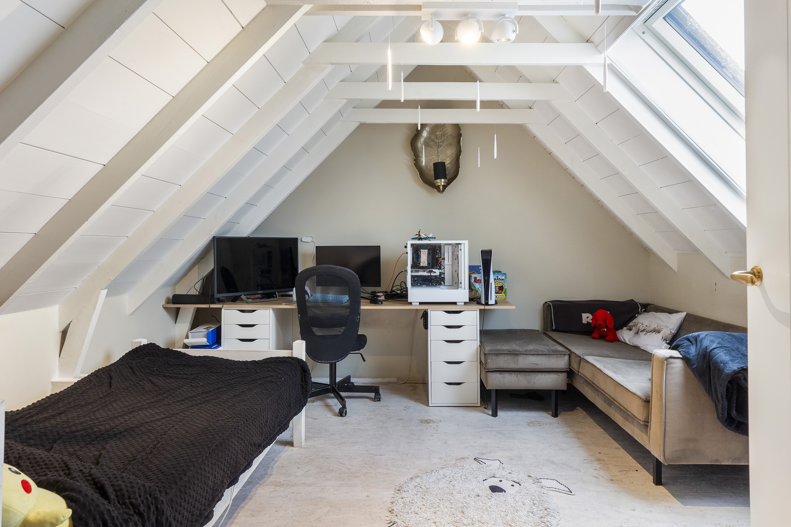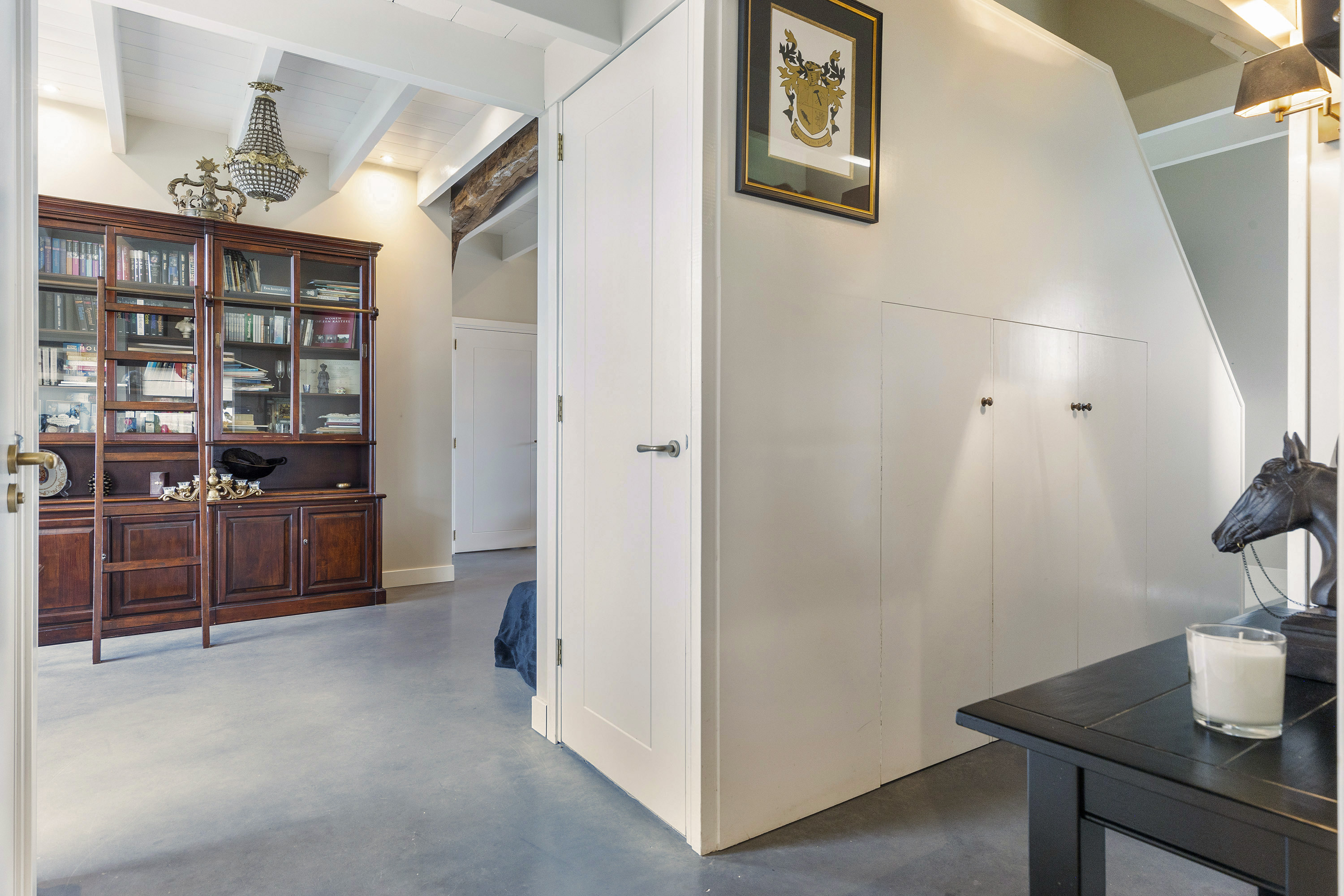The living room is equally spacious and is characterised by a beautiful combination of white-painted timber ceiling beams, robust structural beams and a polished concrete floor. The wood-burning stove and French doors to the garden create a seamless connection between indoor and outdoor living. The room comfortably accommodates multiple seating areas, offering flexibility in layout.