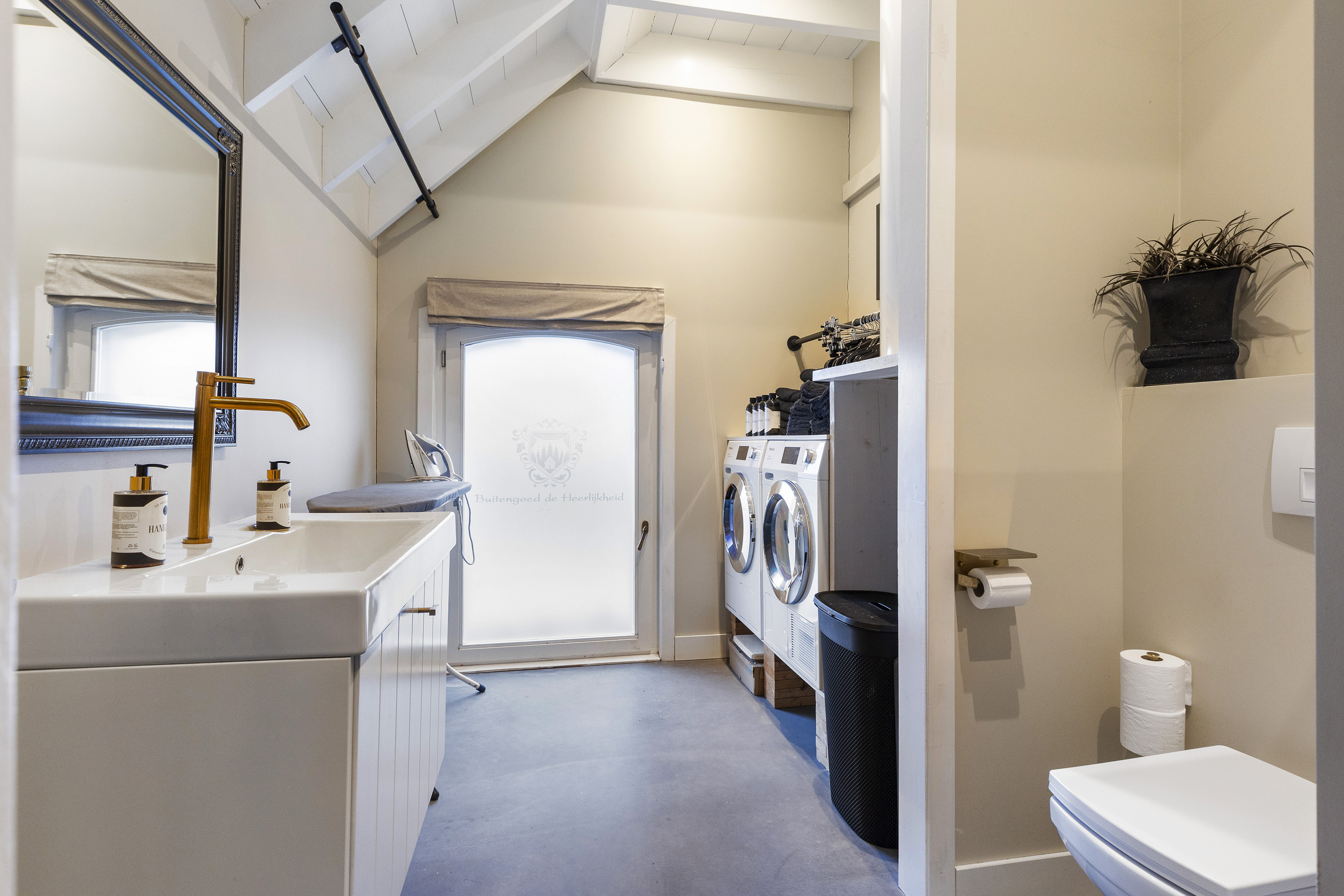 On the ground floor, there is also a generous principal bedroom with an open, loft-style layout and views over the garden. This space is connected to an en-suite dressing area and a modern bathroom, featuring a walk-in shower with dark tiling, a vanity unit, toilet and a separate, spacious utility room.