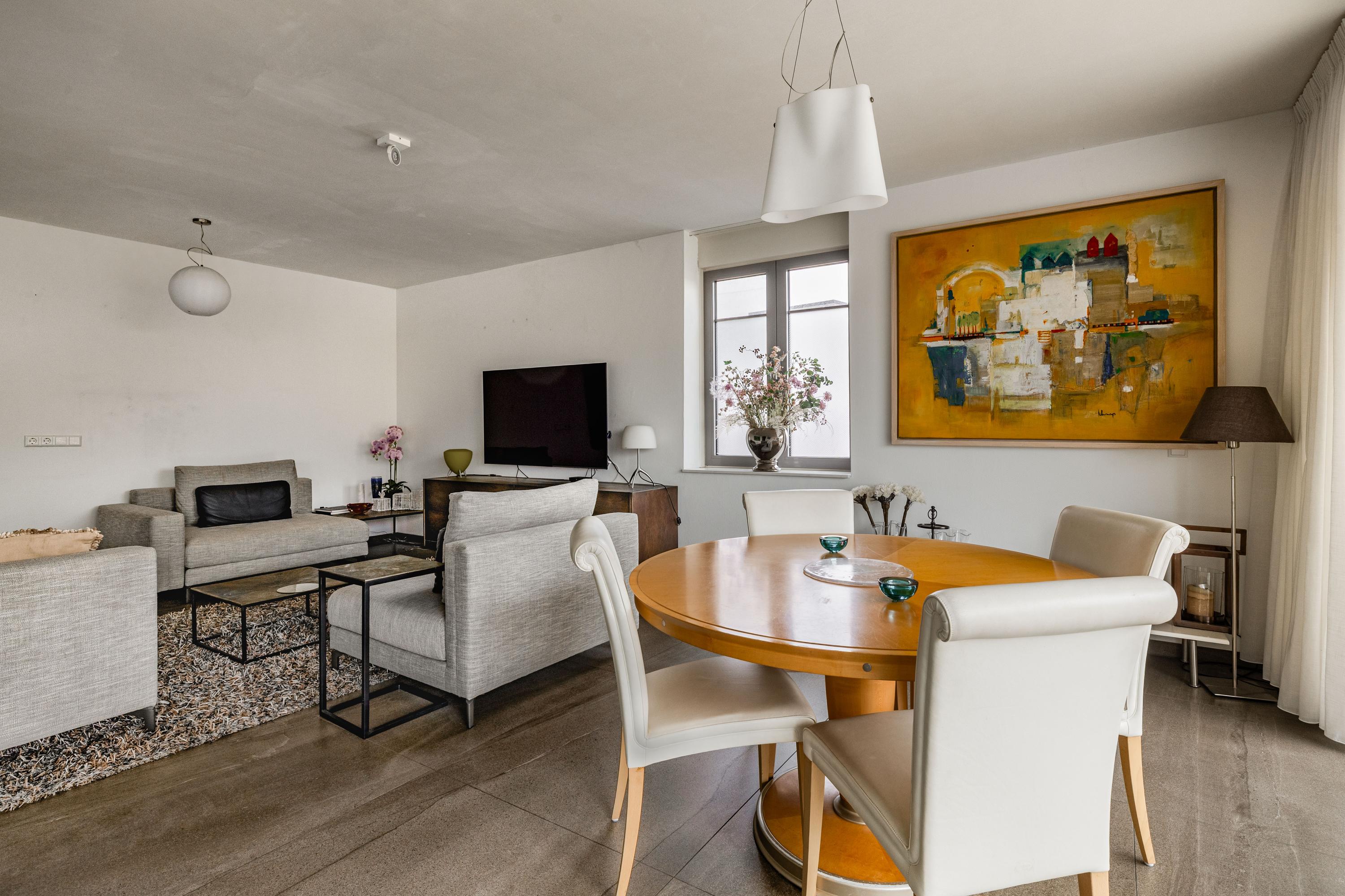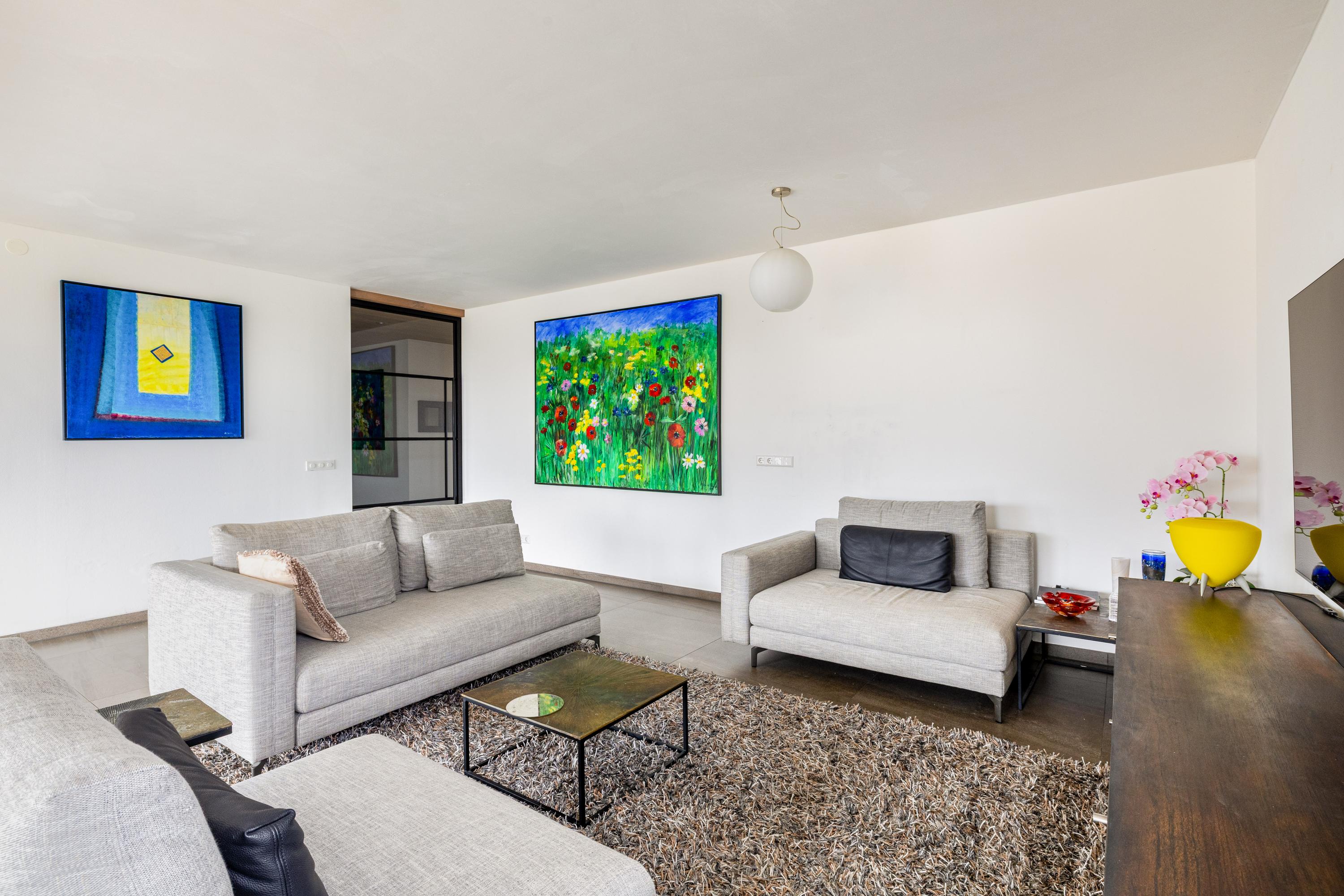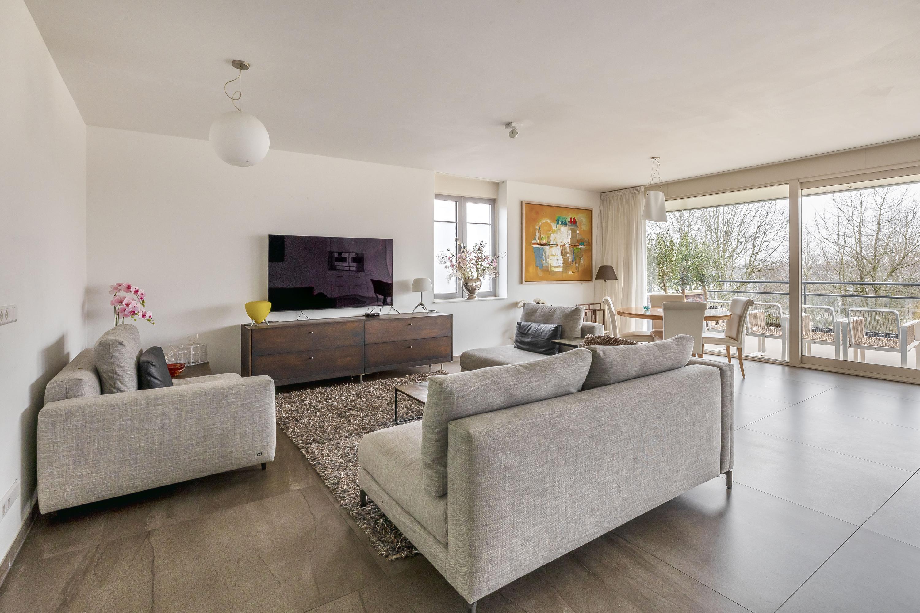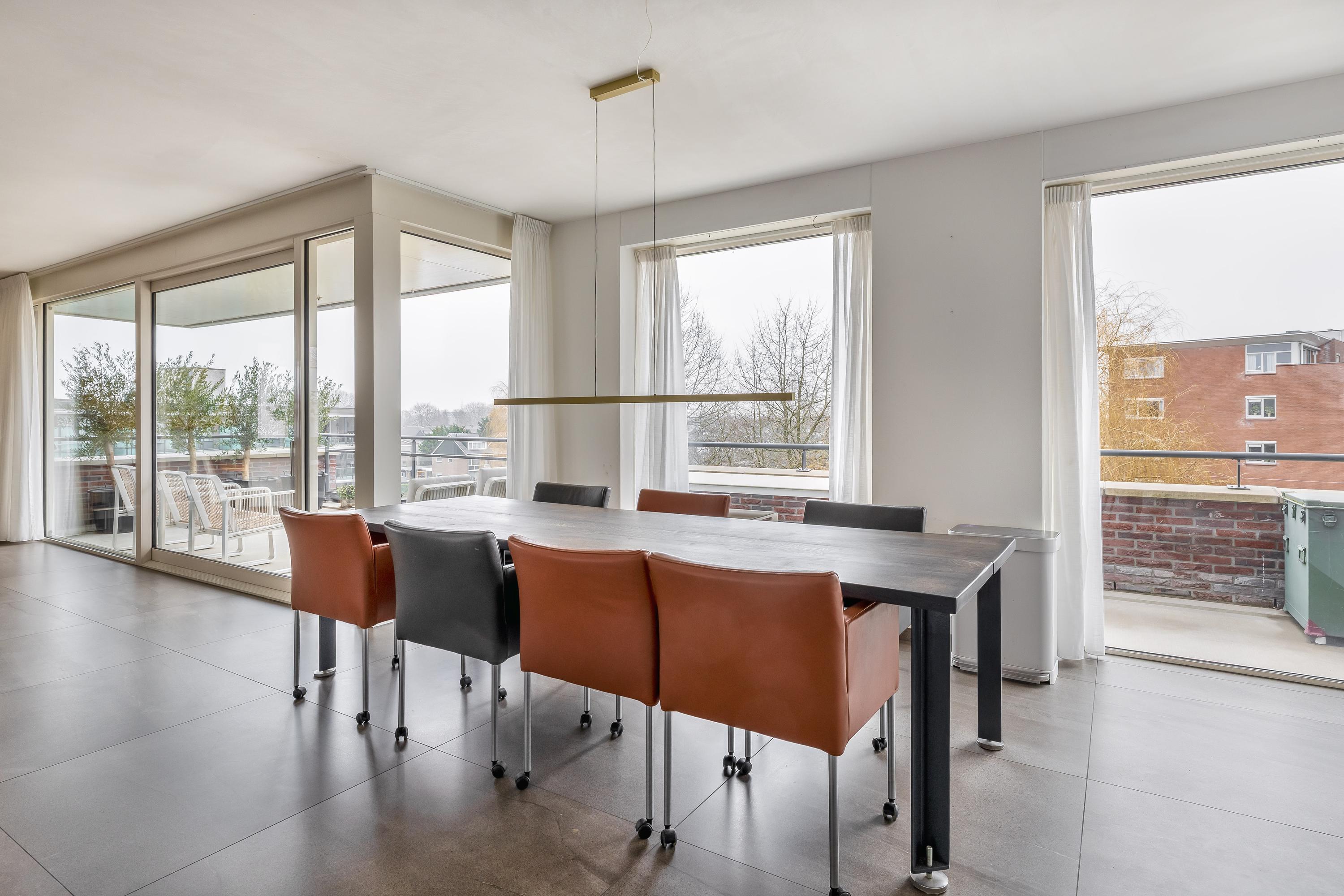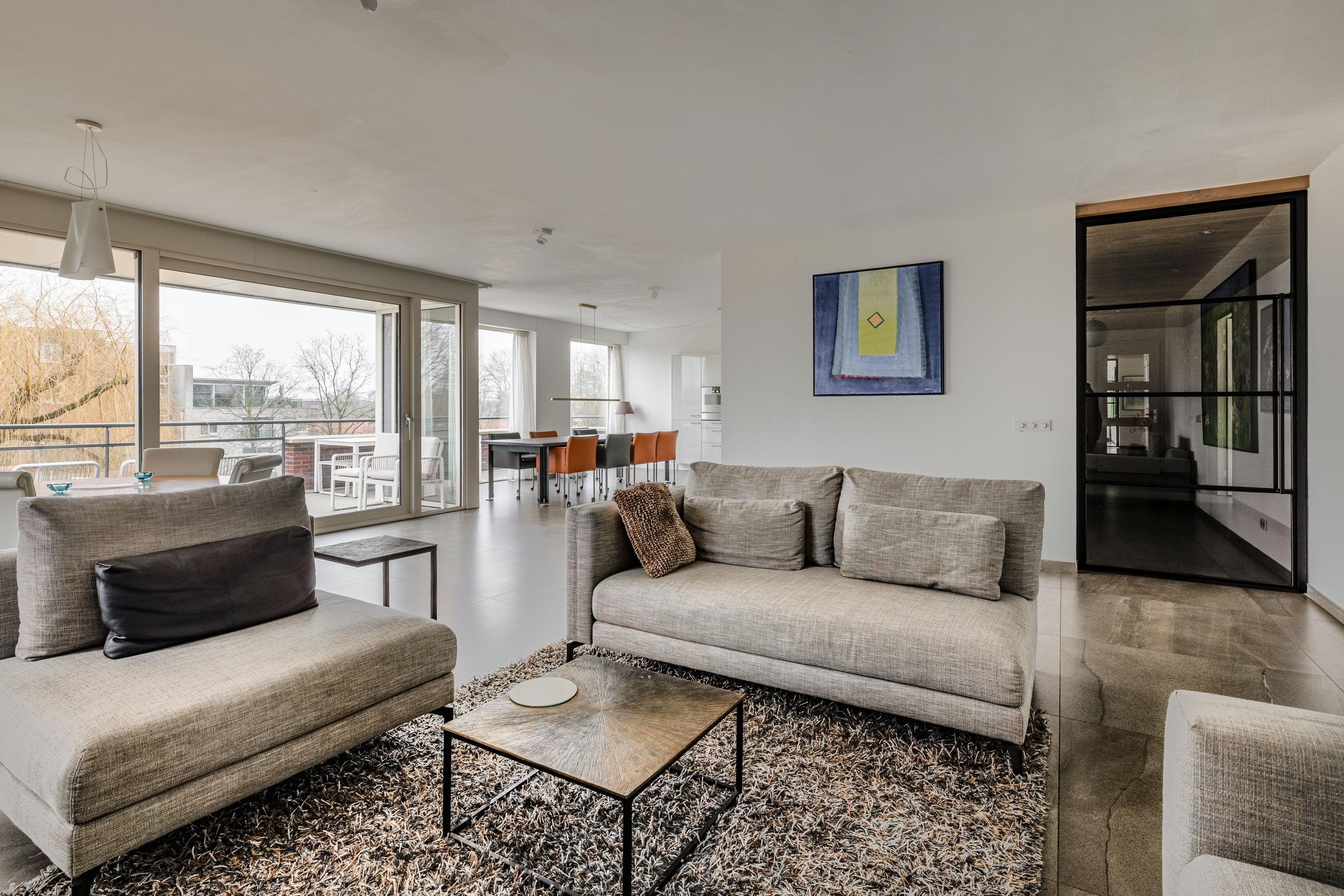 The living room is without a doubt the beating heart of the apartment and feels spacious, bright and relaxed. The generous seating area easily accommodates a large lounge setup as well as guests. Through the wide sliding doors, you step directly onto the large southeast-facing terrace. This terrace is truly impressive in size: there is plenty of room for a large dining table, lounge furniture and greenery, making it a perfect place to relax with family and friends.