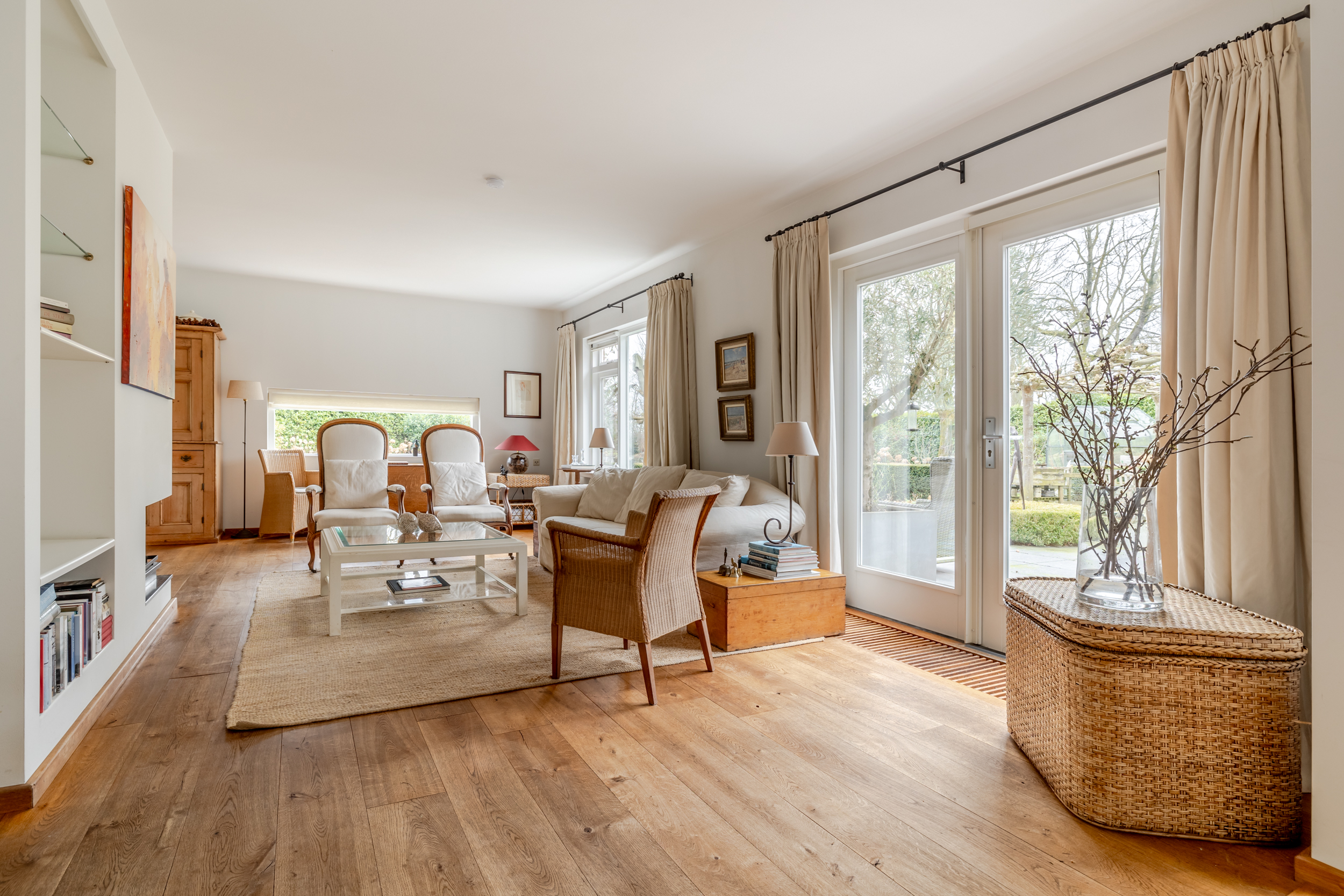 Garden-facing living room consisting of a lounge area (approx. 4.00 x 7.30 m) and a dining area (approx. 4.00 x 4.05 m) with a fireplace and French doors opening onto the garden. Large windows provide beautiful natural light and a seamless connection to the outdoors.