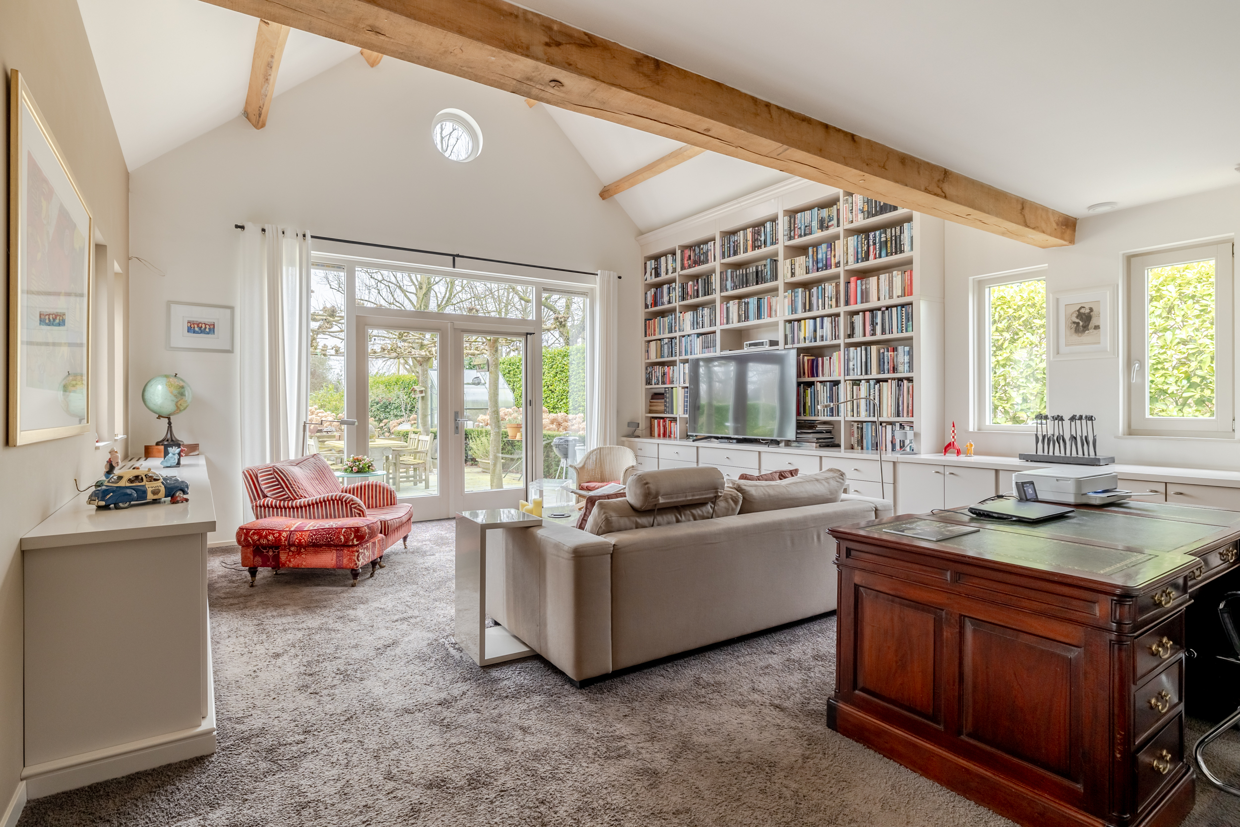 Spacious workroom (approx. 5.40 x 7.85 m) with beautifully crafted custom wall cabinetry and French doors opening onto the garden. This room offers stunning views over the garden and adjacent water.