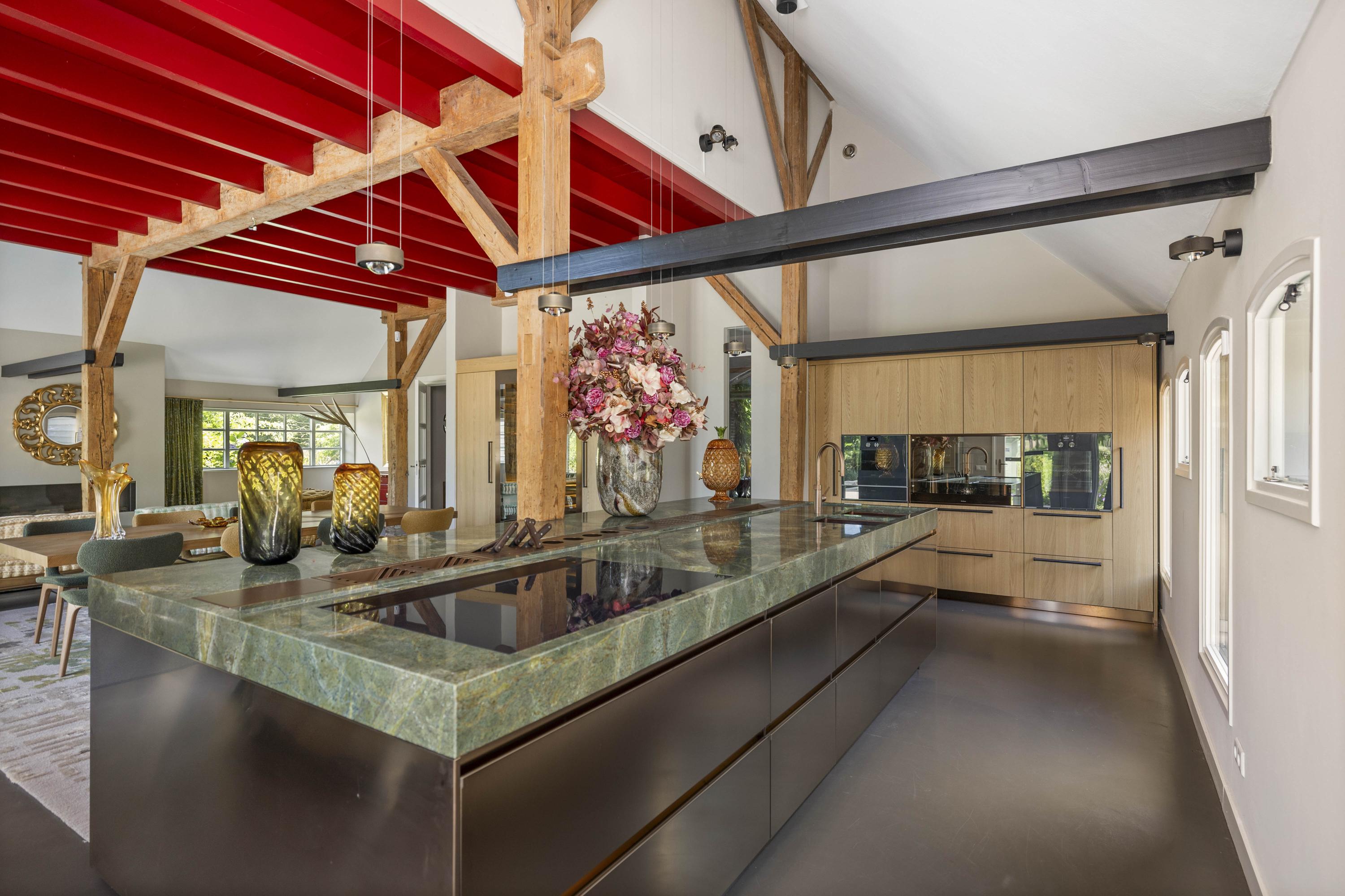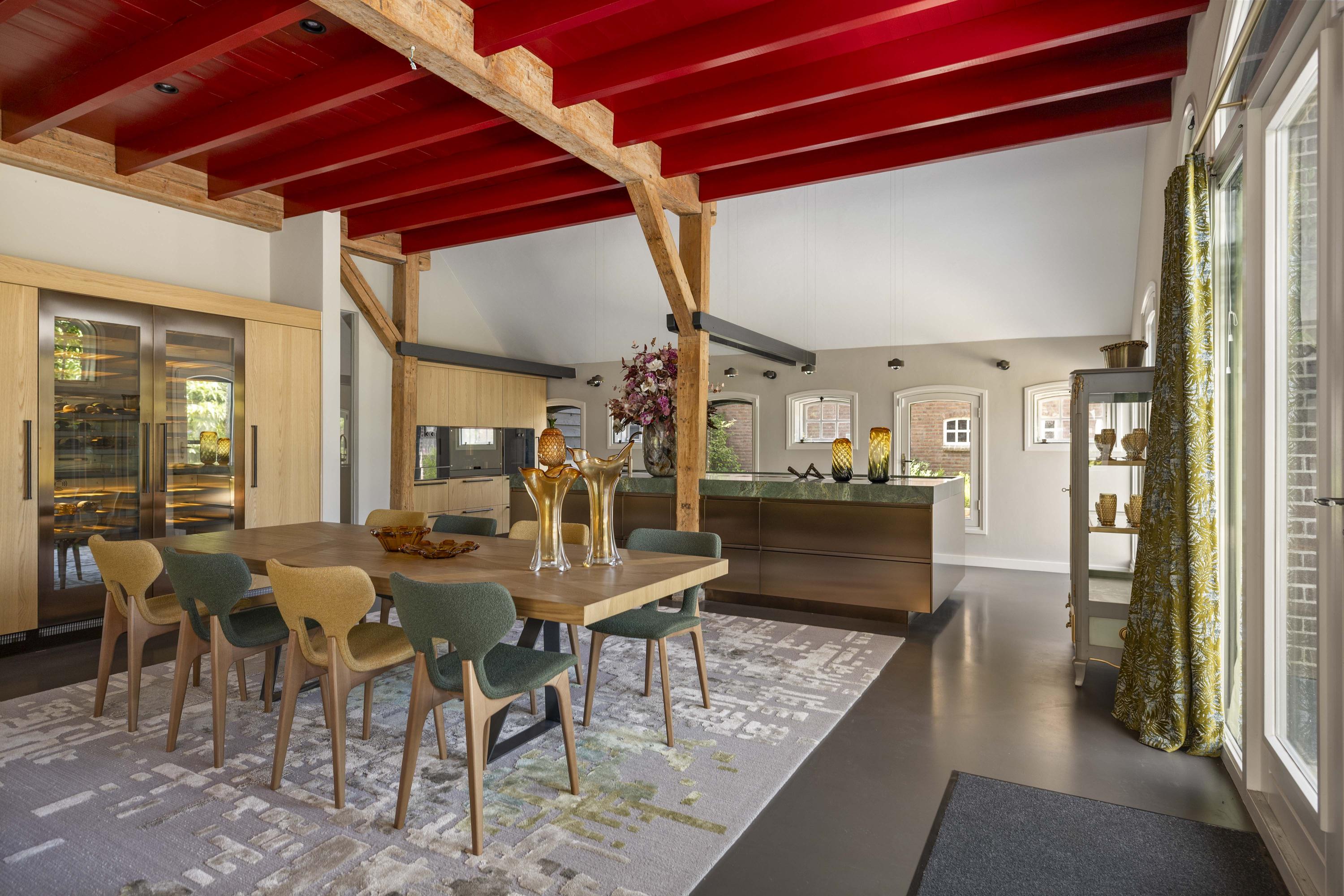 The kitchen-diner, located in the former barn, spans over 70 m² and, with the barn doors now filled with glass, offers a spectacular view of the garden.