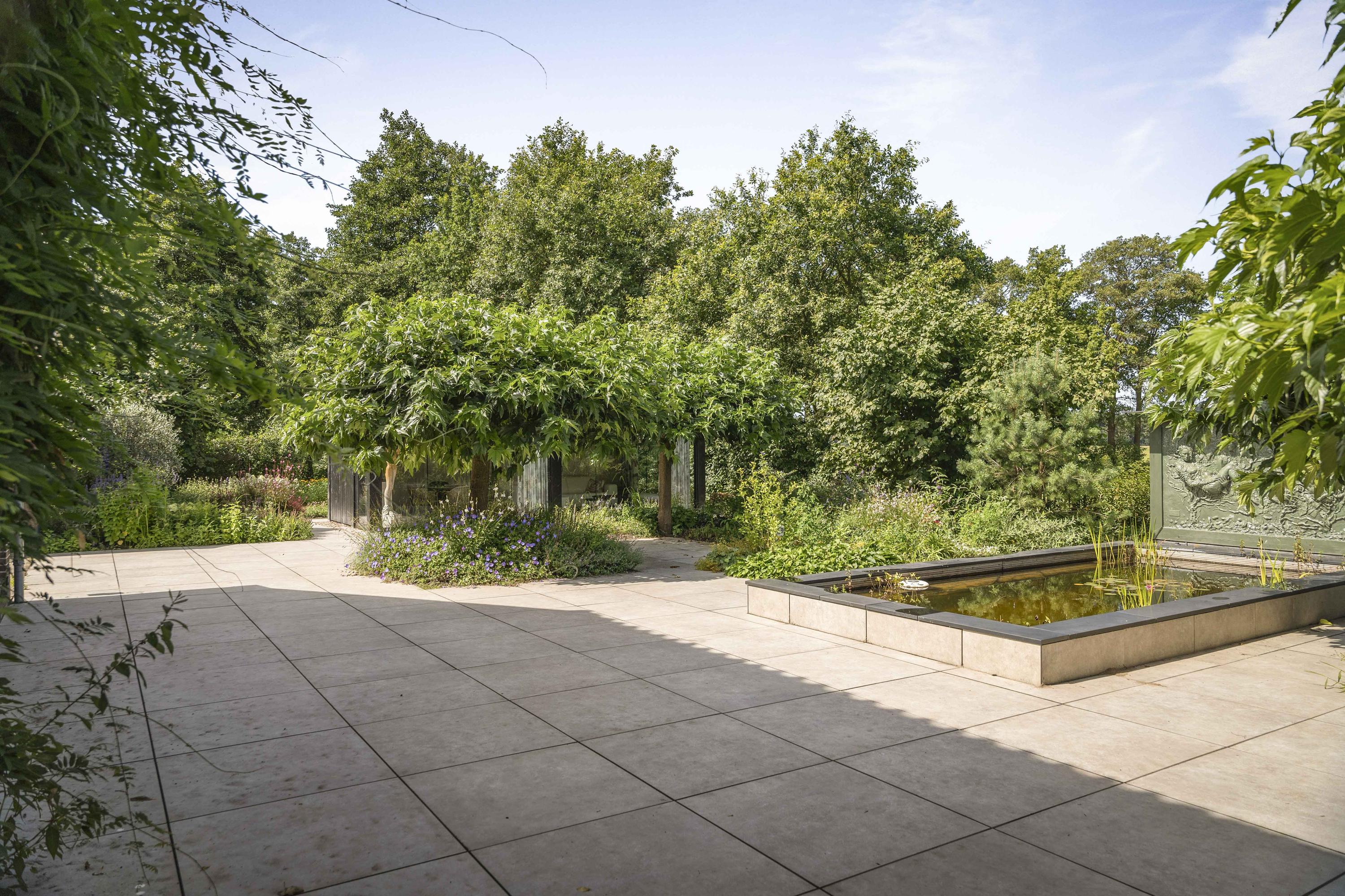 Around the house a wonderful terrace has been laid out, offering space for long tables and convivial summer evenings. Cosy seating areas are scattered throughout the garden. The elegant pond with sculpted friezes forms a striking focal point. Further into the garden are the sauna with outdoor shower (hot/cold water) and tipping bucket, and the stylish garden room with pantry, fridge and wine cooler, offering year-round comfort whether open or enclosed.