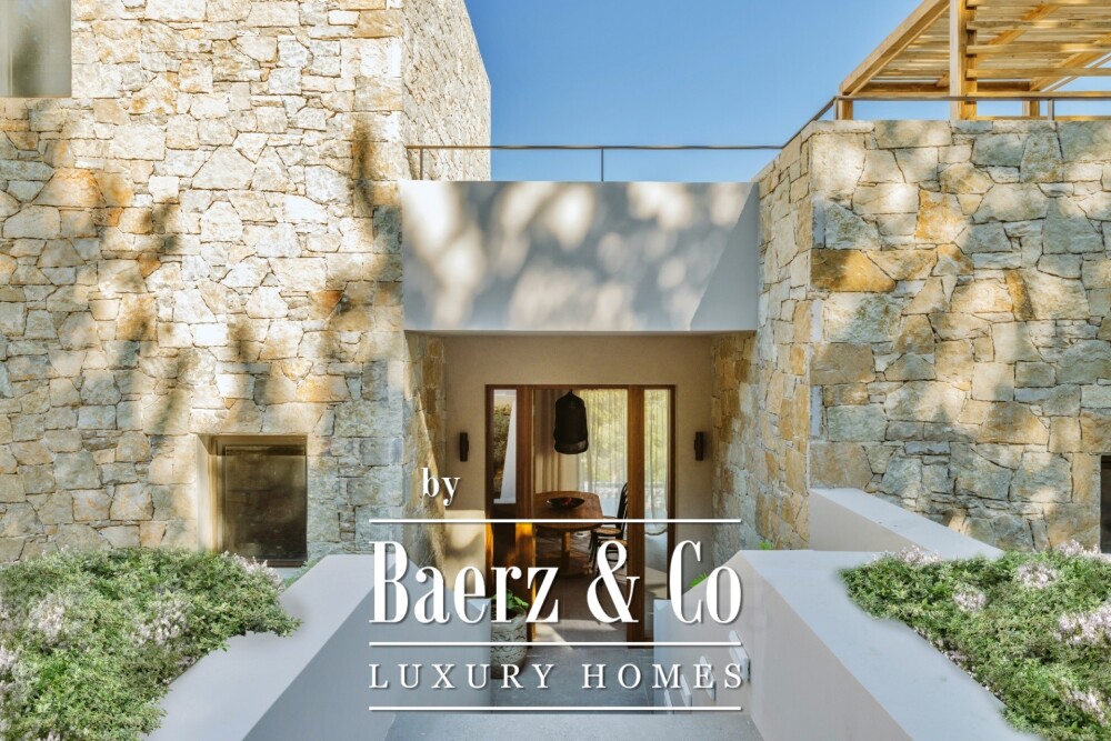 Luxury villa Lefkada defines understated coastal living, set on a commanding 6,820 m² plot in the heart of Nidri. This three-level villa offers 233 m² of sculpted interior space where form and function meet the expanse of the Ionian Sea. Upon entering, an open-plan dining area welcomes natural light and uninterrupted sea views, melding modern architecture with the landscape. The kitchen, seamlessly linked to the living room and dining space, expresses harmony and intentional design. Two en-suite bedrooms on this level provide comfort and privacy.
