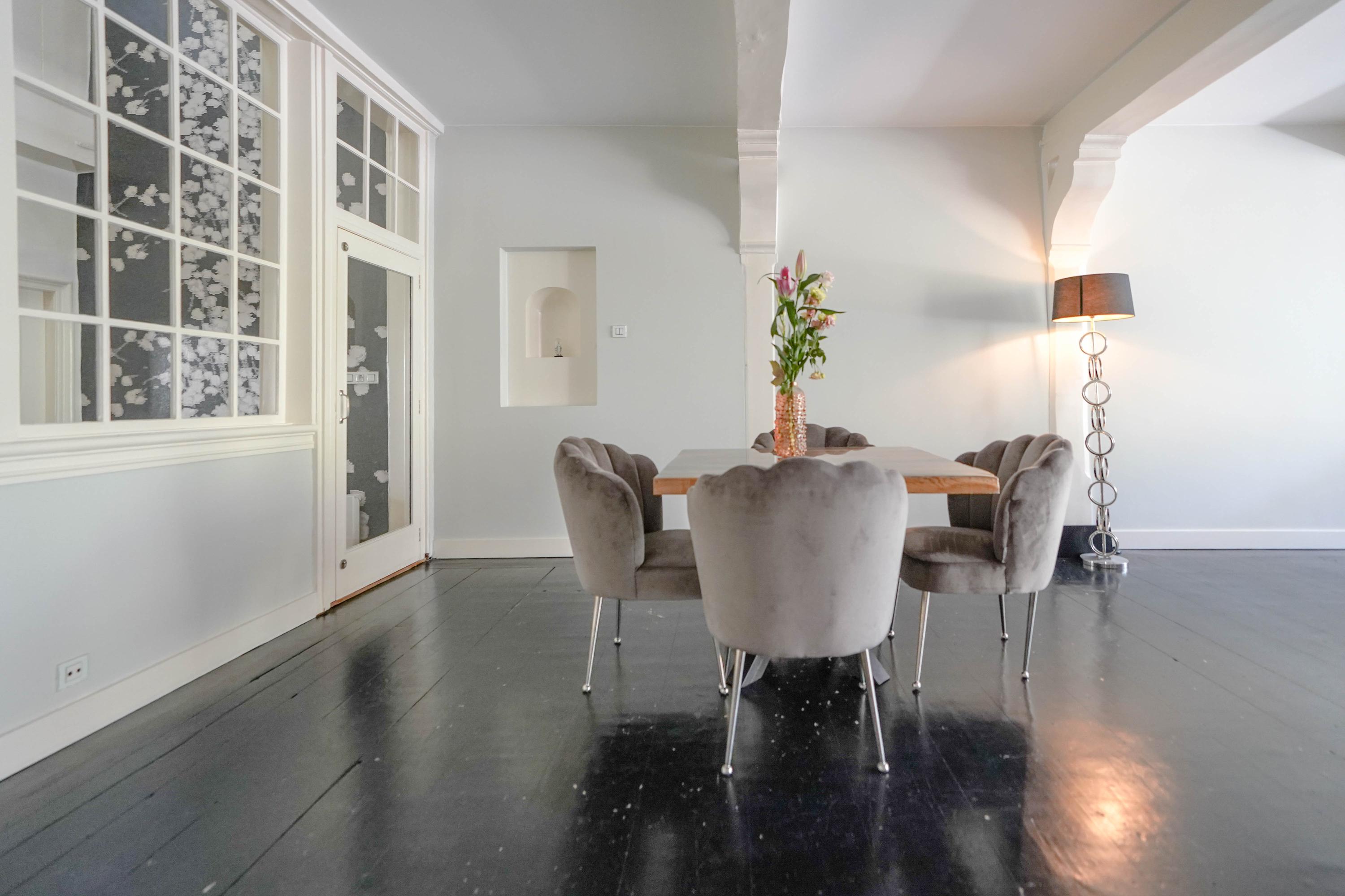 The rear house is oriented towards the garden and the castle hill. From the various rooms you can see the Burggraaf's old home through beautiful high windows: an 800-year-old oasis of greenery in the middle of the city center. Here the current owner has a garden room on the ground floor with an extra kitchen. You also need this, because having to go through the entire building every time for a snack or drink when you're sitting in the garden is a bit much to ask. There are quite some distances you can cover here. There is now a second living room on the 1st floor. with high ceilings, a fireplace and the best view of the Castle. It could also make a lovely office or library. Upstairs is a separate guesthouse with private bathroom and toilet. An aupair could also have a very nice place here.