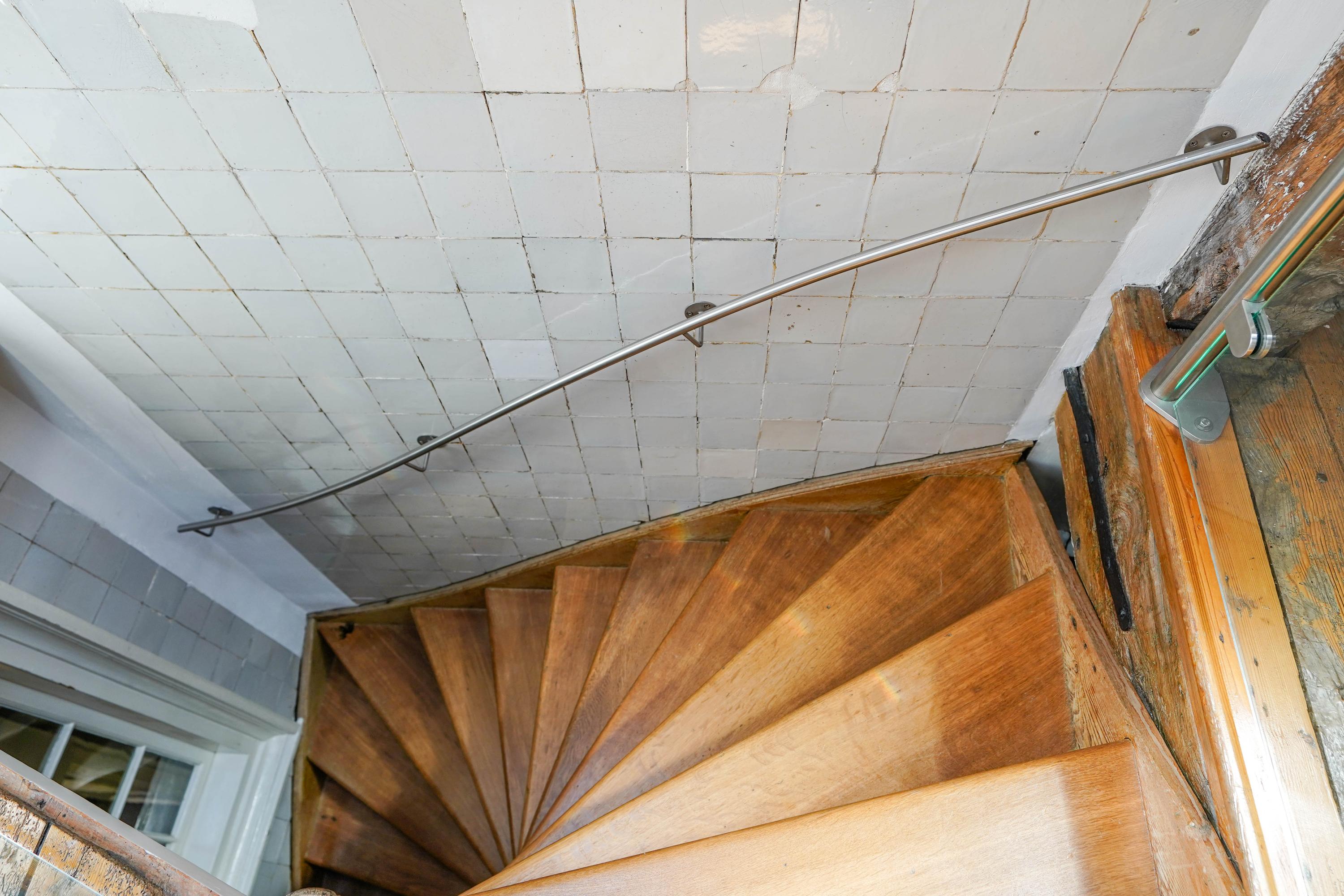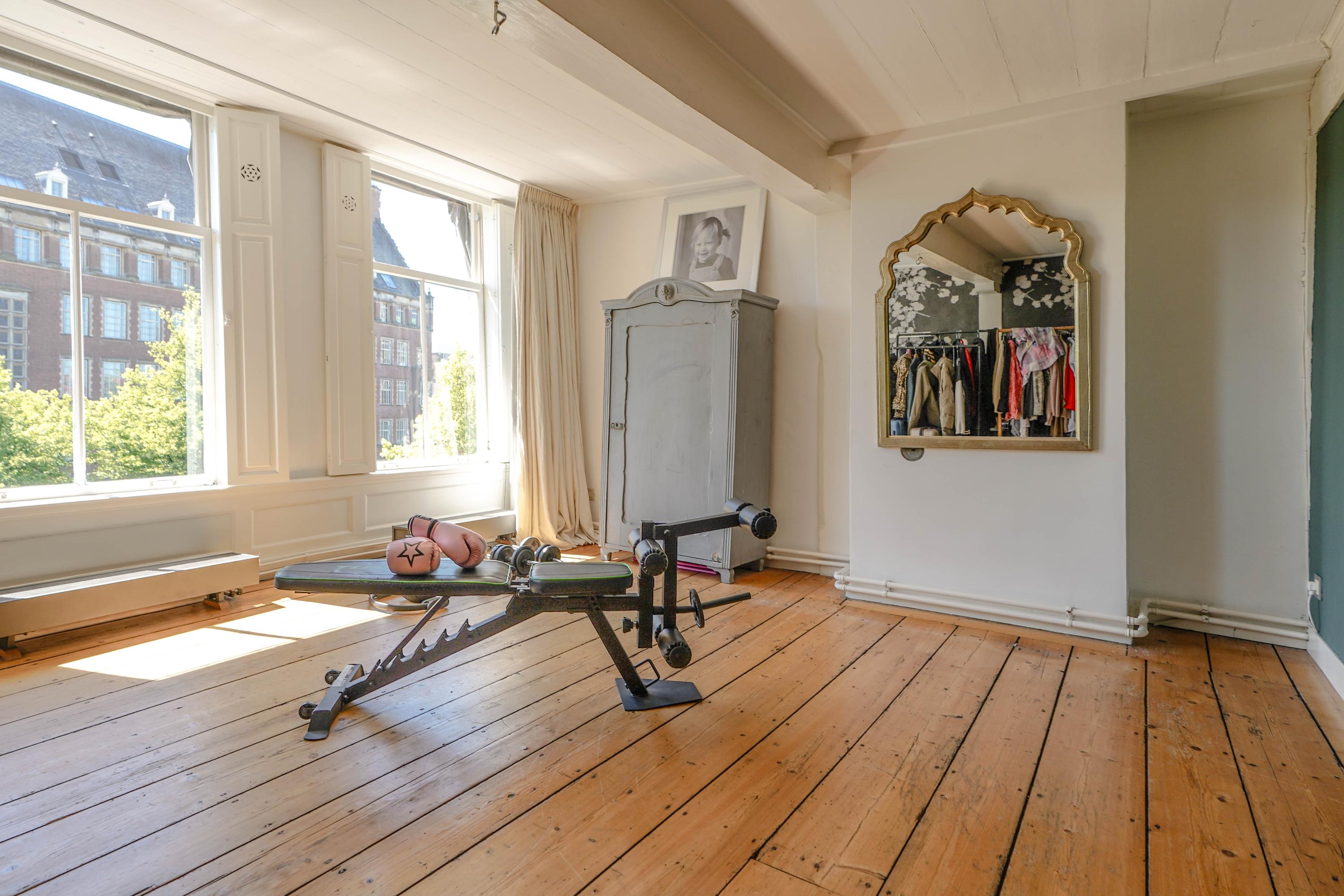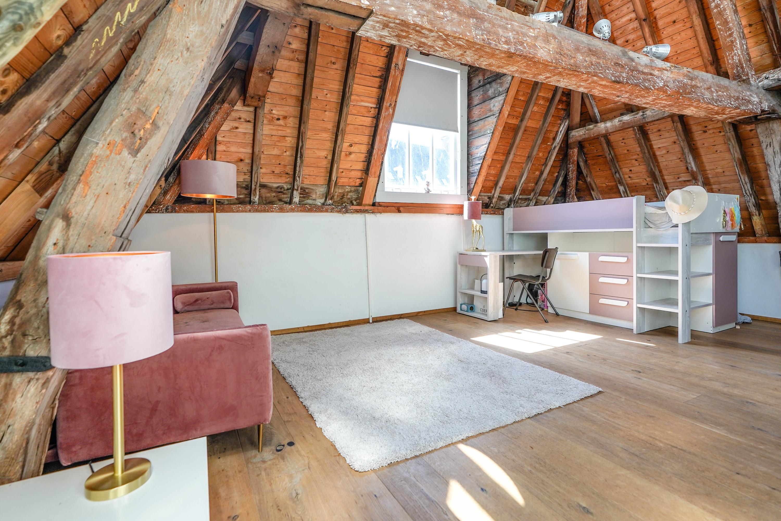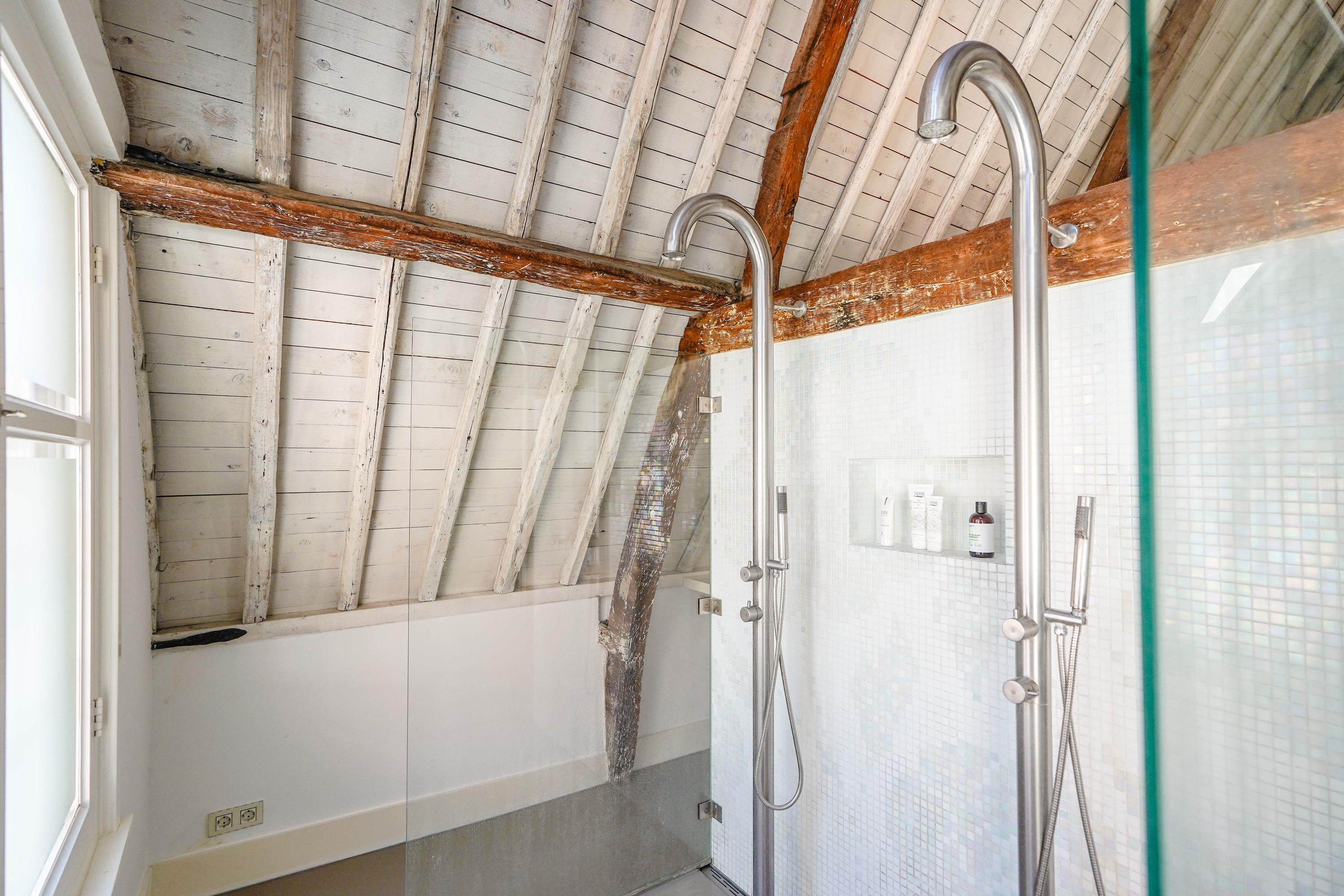 The front house is the original main house. The ground floor houses a shop (which is also available for purchase), and the first floor now houses the 70 m² living room, which overlooks the Rhine and Stadhuisplein. At the rear is the kitchen/diner with space. A lot of space. With 50 m², long worktops and a dining table that seats 12, this is now the heart of the house. From here there is also one of the passages to the back house along the courtyard, which provides a lot of light. The sleeping floors are one floor higher. Here the house has been peeled back to the structure with the beautiful wooden siding roof in full view. High Velux windows have been installed between the tracks, providing beautiful light at any time of the day. At the front you will find three bedrooms, a bathroom and, above all, plenty of storage space with fitted wardrobes and a linen room, spread over two floors. At the rear, the master bedroom with ensuite bathroom covers the entire roof with a ridge of no less than 8 meters high.