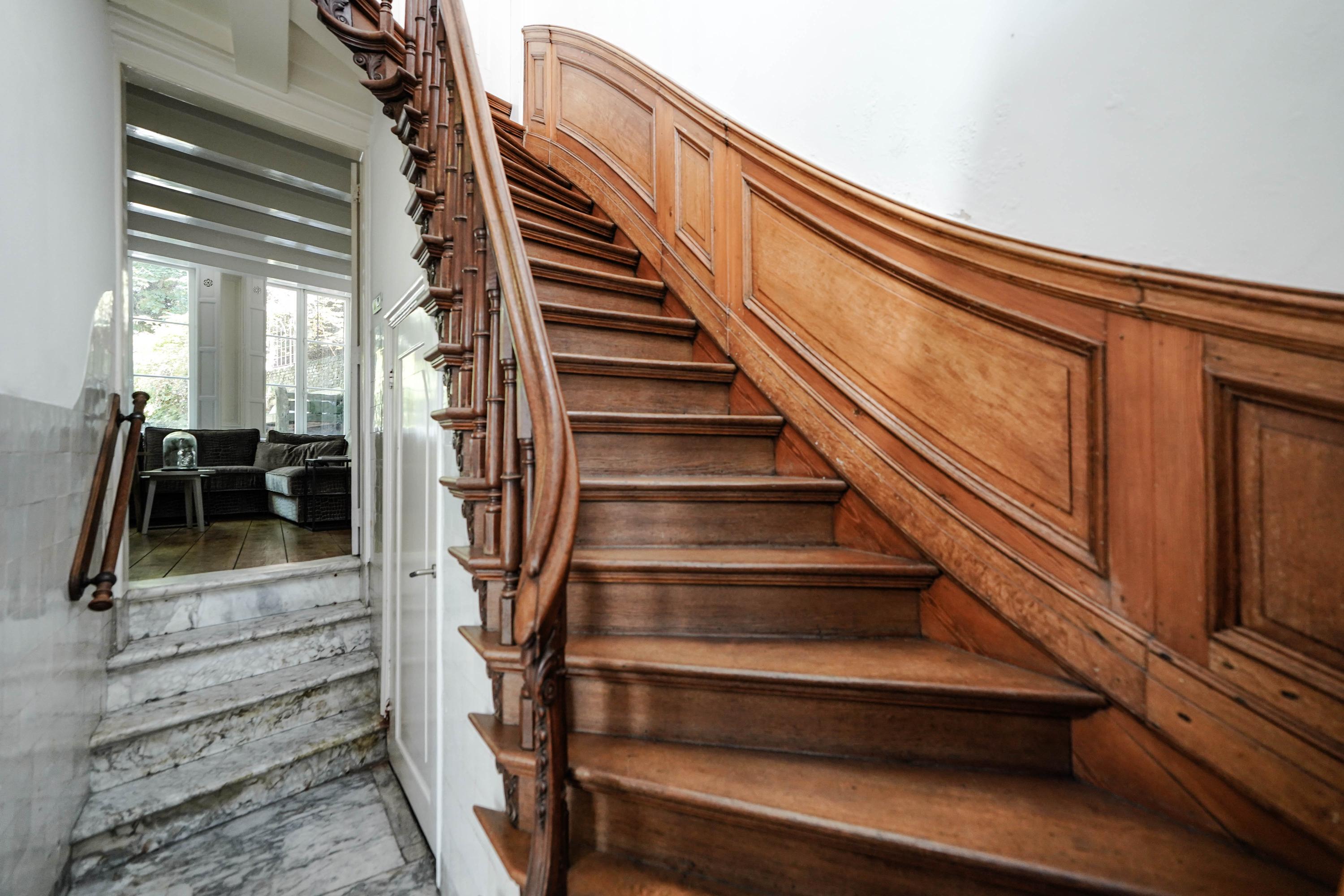 This example of 17th-century wealth is located along the water of the Rhine at the foot of the castle hill. As usual at that time, the face of the facade was modest, almost even subdued. However, this was more than compensated for inside. The prosperity was exuberantly displayed: richly decorated natural stone fireplaces and opulent stuccowork adorn the ground floor. After all, this is where guests were received and people had to impress. Although the centuries have passed, much of the original wealth of this building has been retained and the current owner has completely modernized it. In addition, both floors and the rear house are characterized by large and high rooms, where heavy oak beams and impressive roof structures with large and high windows provide light and views.