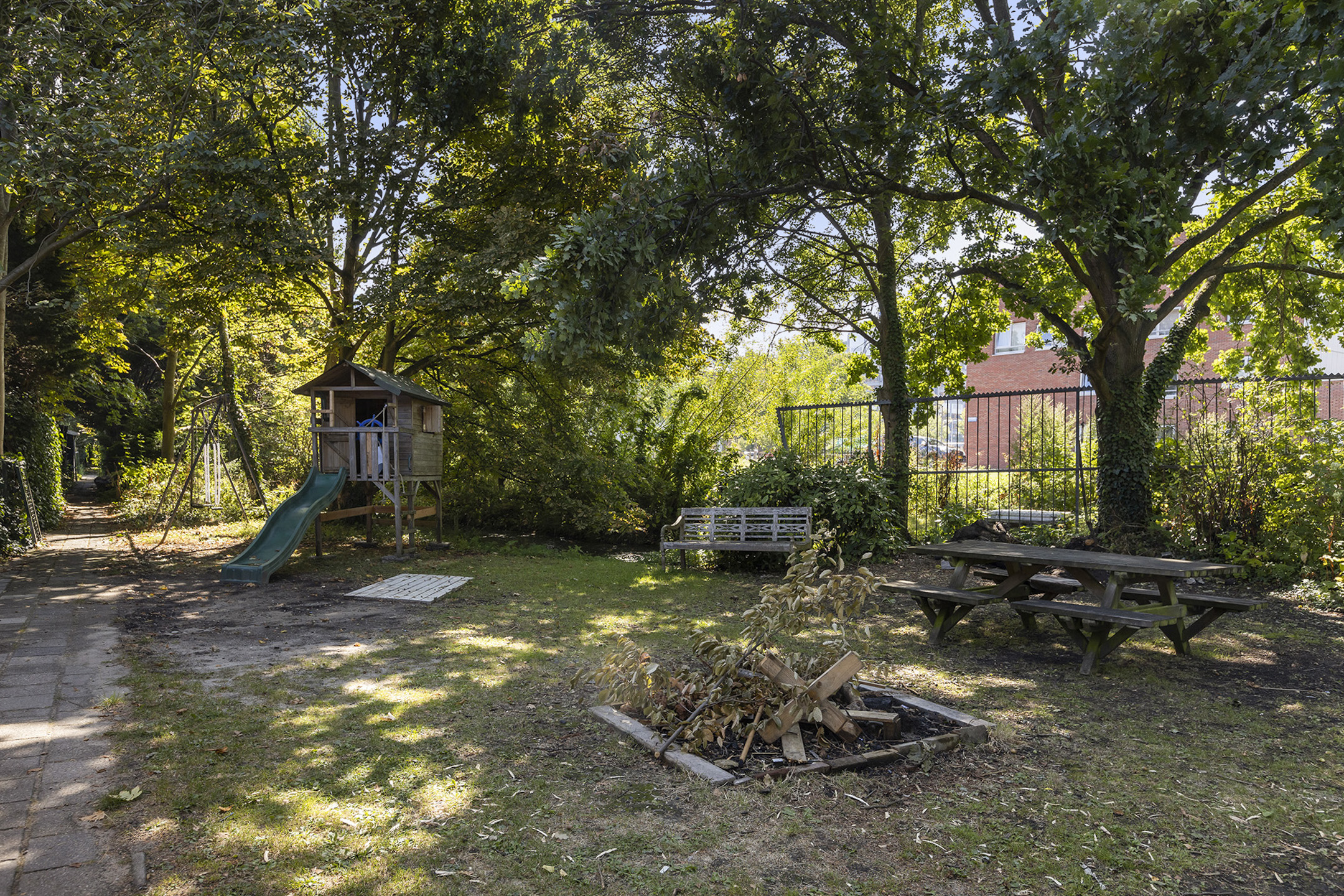 Outside, the deep rear garden faces south west, ensuring ample sunlight yet offering shaded views from mature trees. Beyond lies a private, 1,318 m² enclosed lot, shared among neighbors, with space for children’s play, gathering, and water access. Essential amenities, schools, transit, green parks, and urban offerings lie nearby. This townhouse, a registered municipal monument, carries period character, partial double glazing, central heating, and inclusion in a residents’ association.