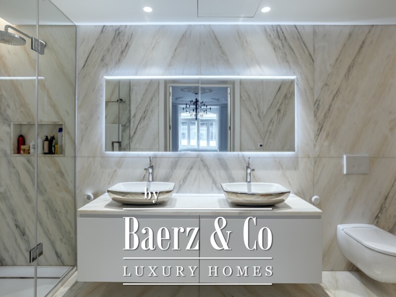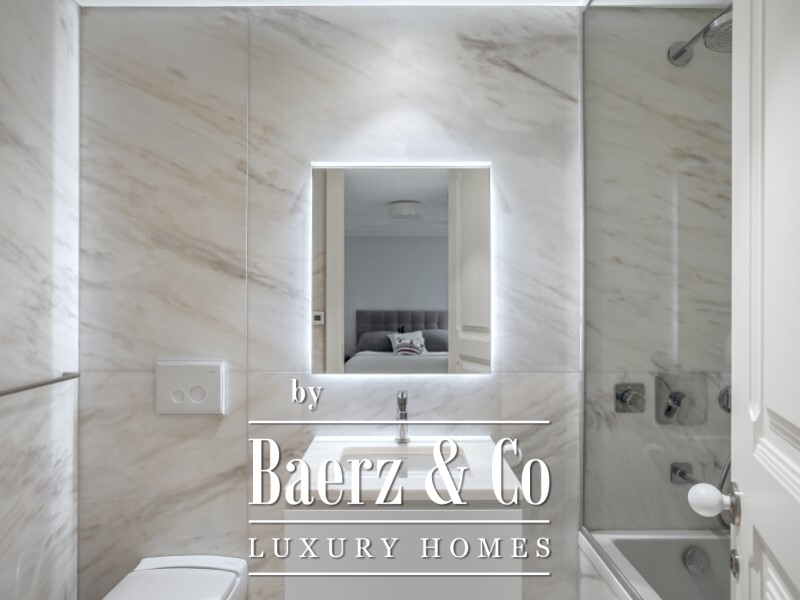 High decorative ceilings at 2.8 m provide a sense of airiness, while abundant natural light filters through wide rooms finished with meticulous attention. Estremoz marble details and built-in wardrobes signal a commitment to enduring materials and thoughtful design. The layout unfolds gracefully: an entrance hall leads to the living and dining rooms, a kitchen with Miele appliances, a powder room, a versatile bedroom or office, and four suites, two featuring walk-in closets. Underfloor heating in bathrooms, air conditioning in all rooms, and central heating guarantee year-round comfort.