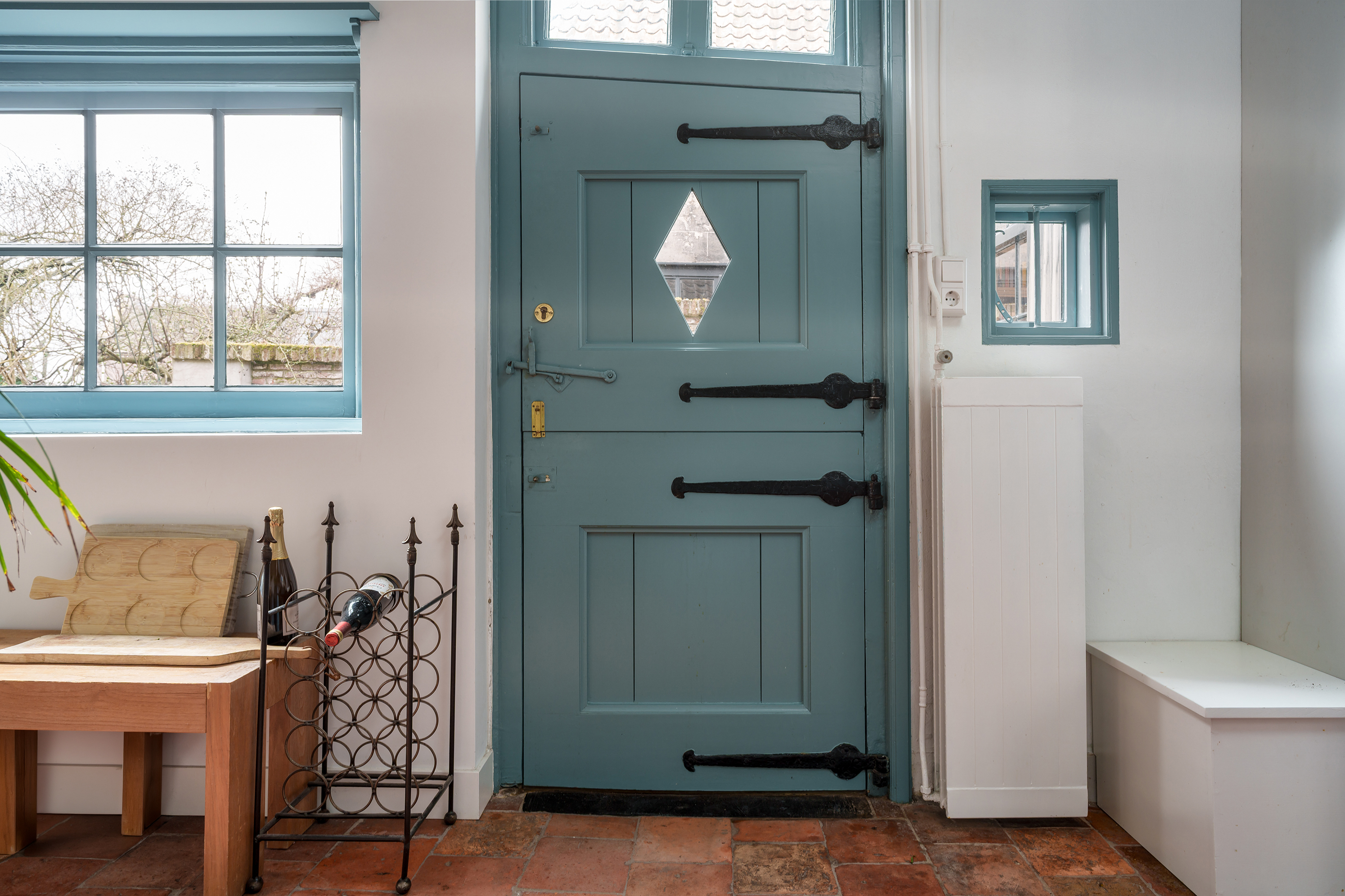 The country-style kitchen is equipped with a Quooker and a gas stove with oven and is directly connected to the living area and also to the central hall. This makes this space the real central living area of the house. A fixed dining bench has been installed here, creating a cosy dining area. The kitchen also has built-in cupboard space. From the kitchen, you have access to the outdoor area and the adjoining study. A nice detail: the beautiful façade in this kitchen, which features an old farmhouse door (two parts that open) with a skylight, beautiful old hinges and locks, and windows that provide plenty of light and, above all, atmosphere.