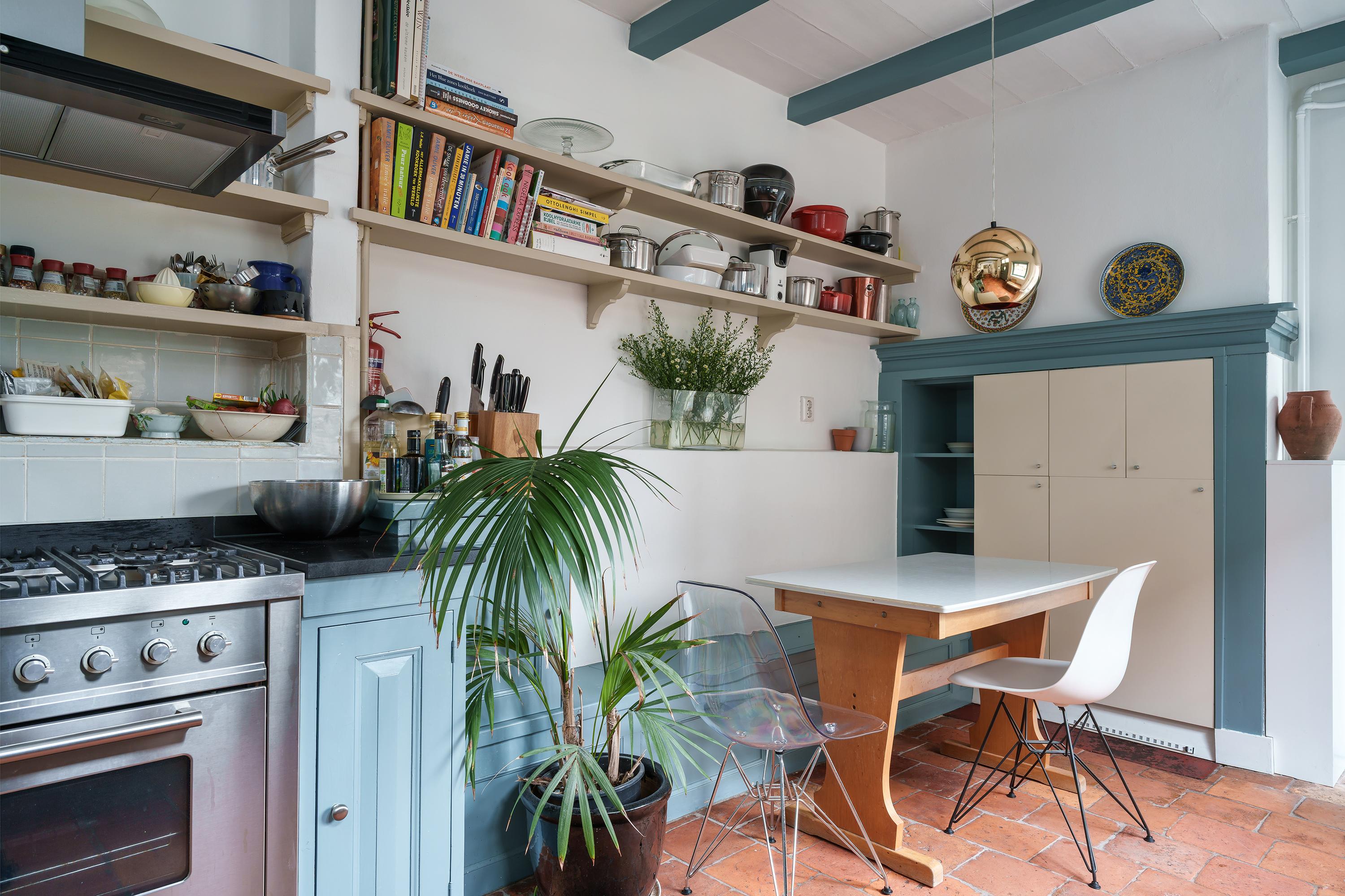 On the right-hand side, you enter the living room. This fairly deep space is therefore used in two parts. The front part (street side) is now a lovely space where the grand piano stands. The rear of this living room is a lovely, cosy sitting/living area. This living room is located at the rear (garden side) and has a large sliding window for wonderful light and a view of the courtyard garden. This living room also has a cosy wood-burning stove and, once again, a beautiful beamed ceiling. An antique French terracotta tiled floor that continues into the living-dining kitchen perfectly matches the monumental character of the house.