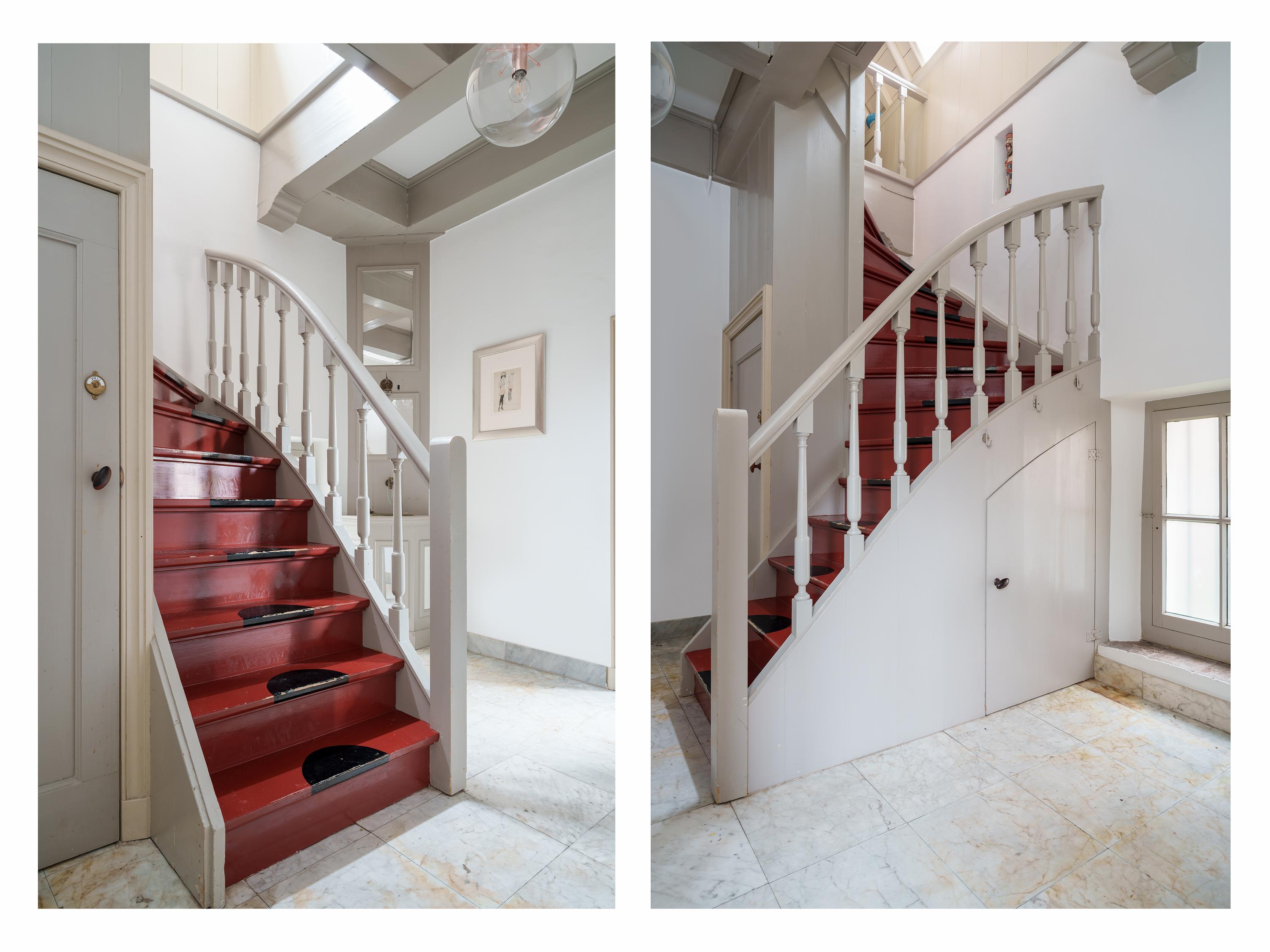 The stately entrance leads to the central hall, which continues into a more spacious hallway. Here you will find the toilet and the impressive staircase to the first floor. Nice details: the low window, the beautiful stair cupboard under the stairs and the authentic washbasin in the corner. The hall is tiled with old ‘Carrara’ marble floor tiles. The incredibly beautiful, very old floor beams (ceiling height of over 2.8 metres) immediately catch the eye here, and these are also reflected in the living areas.