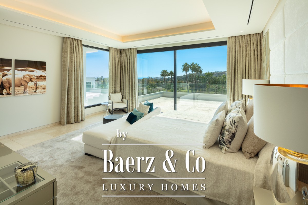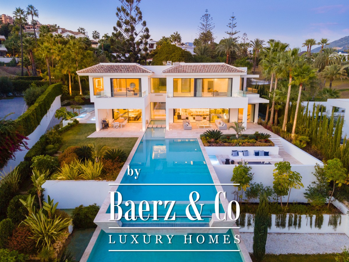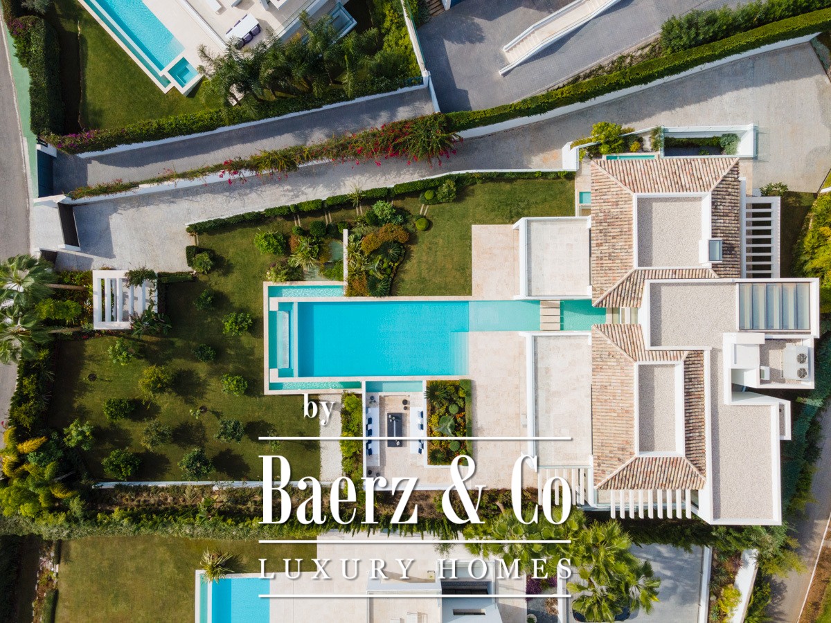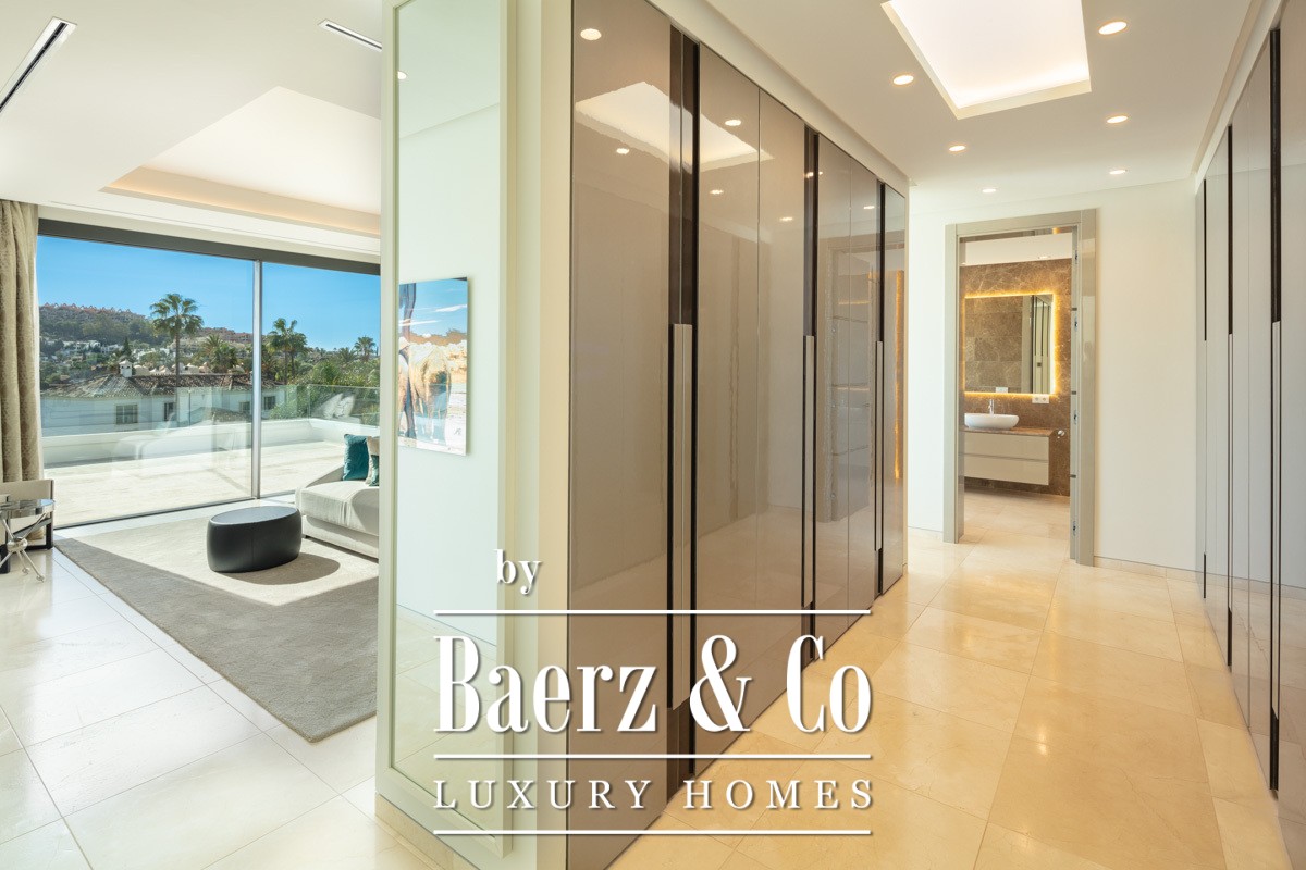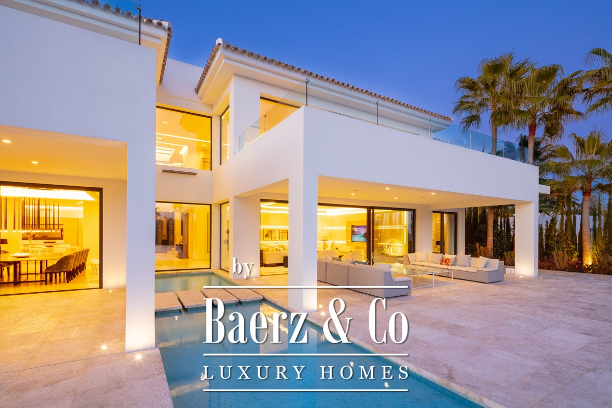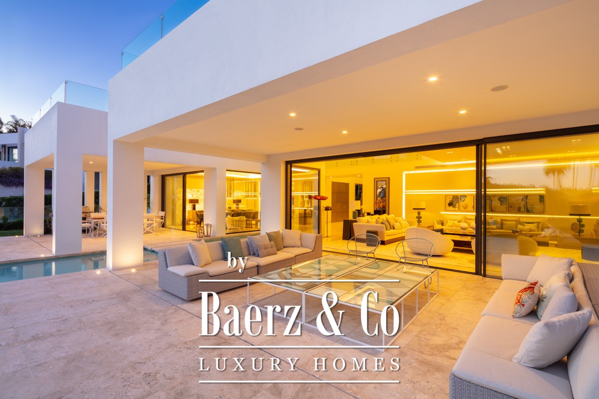 This stunning modern villa is located in the prestigious community of La Cerquilla. Nestled in the heart of the Golf Valley, this luxurious home is located within a short distance to all amenities of Nueva Andalucía and the exclusive golf courses. This bespoke home has been finished to the highest quality standards, offering top quality materials throughout. Distributed over three levels, villa welcomes you into an impressive entrance hall with double height ceiling, which leads to a large open-plan living area. The large living room is furnished with high quality furniture and overlooks the tropical garden of the villa. The