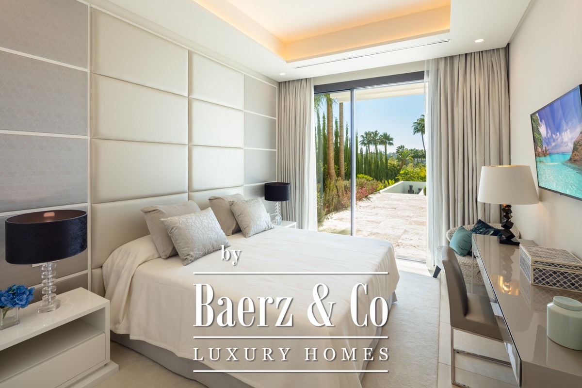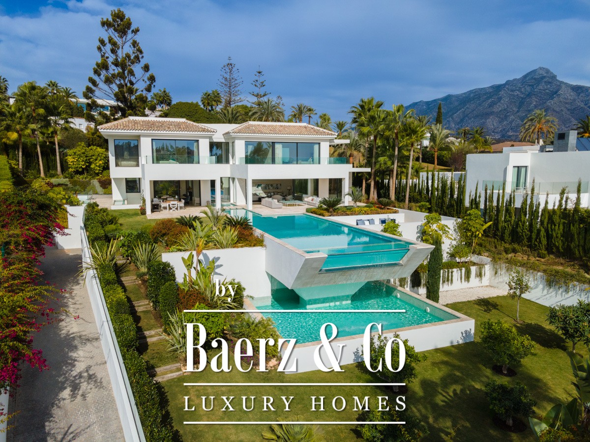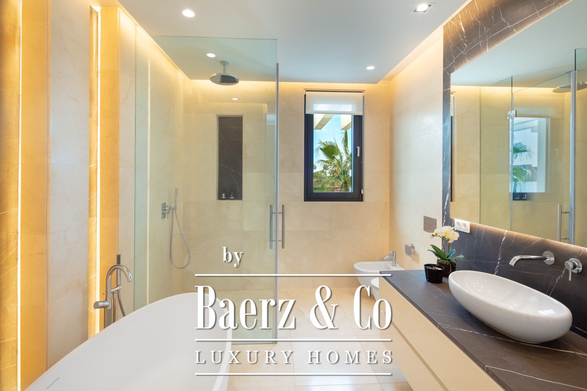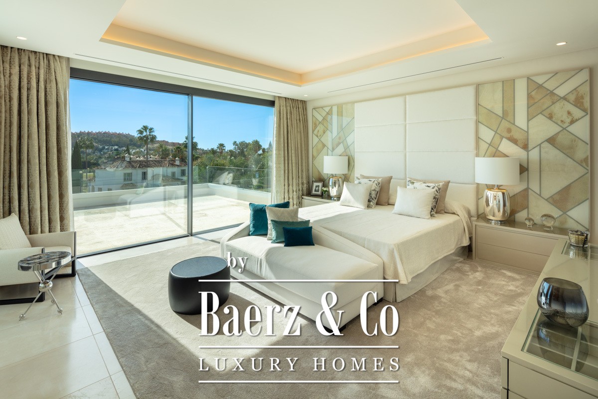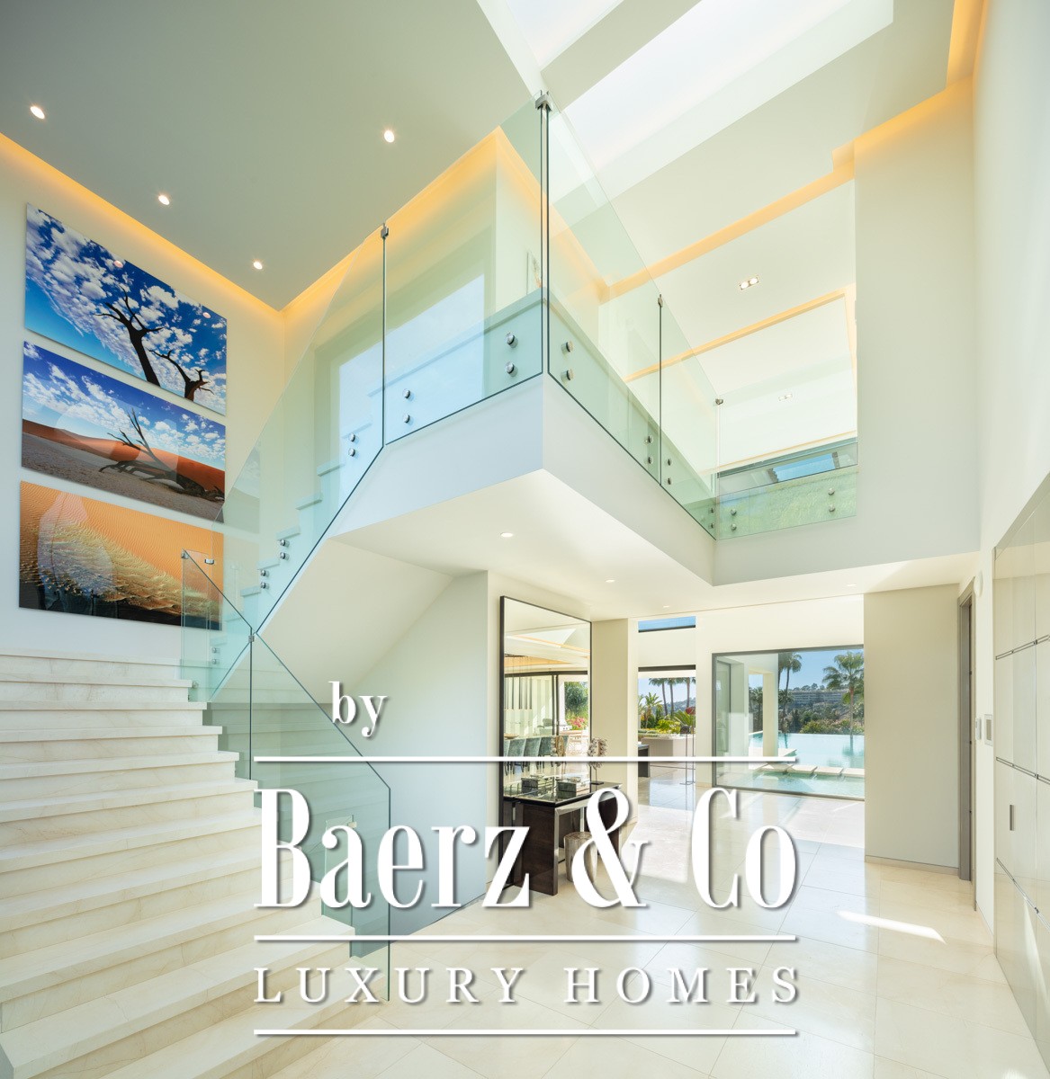 This stunning modern villa is located in the prestigious community of La Cerquilla. Nestled in the heart of the Golf Valley, this luxurious home is located within a short distance to all amenities of Nueva Andalucía and the exclusive golf courses. This bespoke home has been finished to the highest quality standards, offering top quality materials throughout. Distributed over three levels, villa welcomes you into an impressive entrance hall with double height ceiling, which leads to a large open-plan living area. The large living room is furnished with high quality furniture and overlooks the tropical garden of the villa. The