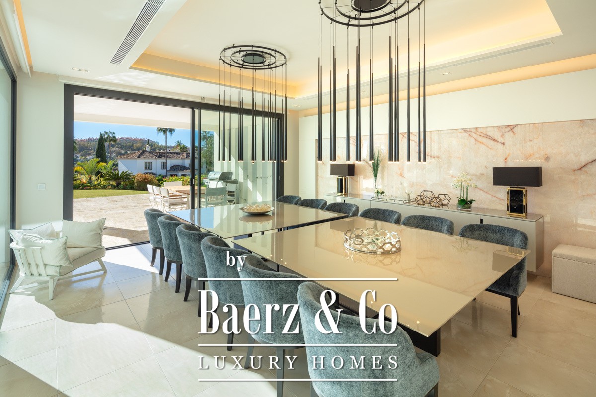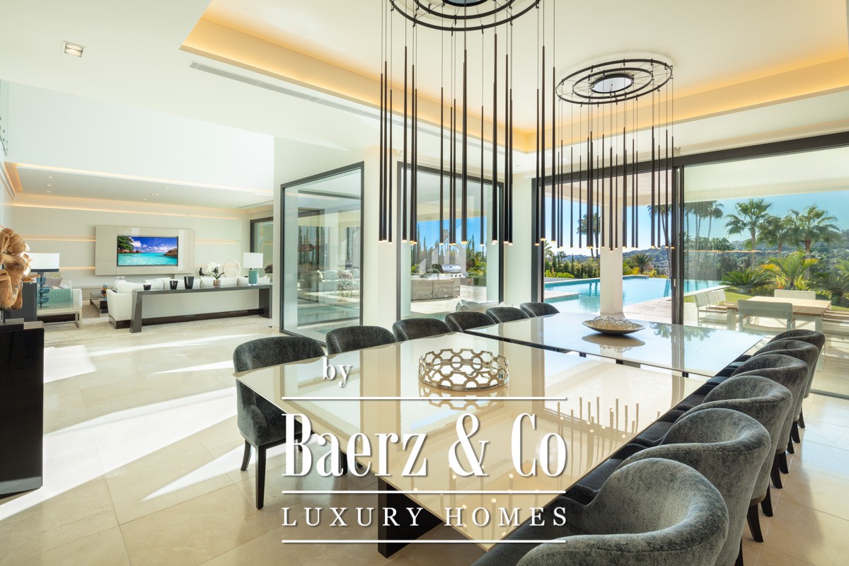 living room connects with the impressive dining area and the modern kitchen. The living room and dining area have direct access to the covered and uncovered terraces, with several chill-out areas and stunning infinity pool. Upstairs, the villa welcomes you into spacious bedrooms, overlooking the greens of Los Naranjos Golf. The lower level of the villa boasts an extra large entertainment area with TV room and possibility to customize with more features. This property is truly one of the most exceptional homes in Nueva Andalucía as per its fantastic elevated plot, high qualities, cutting-edge architecture and prime location.