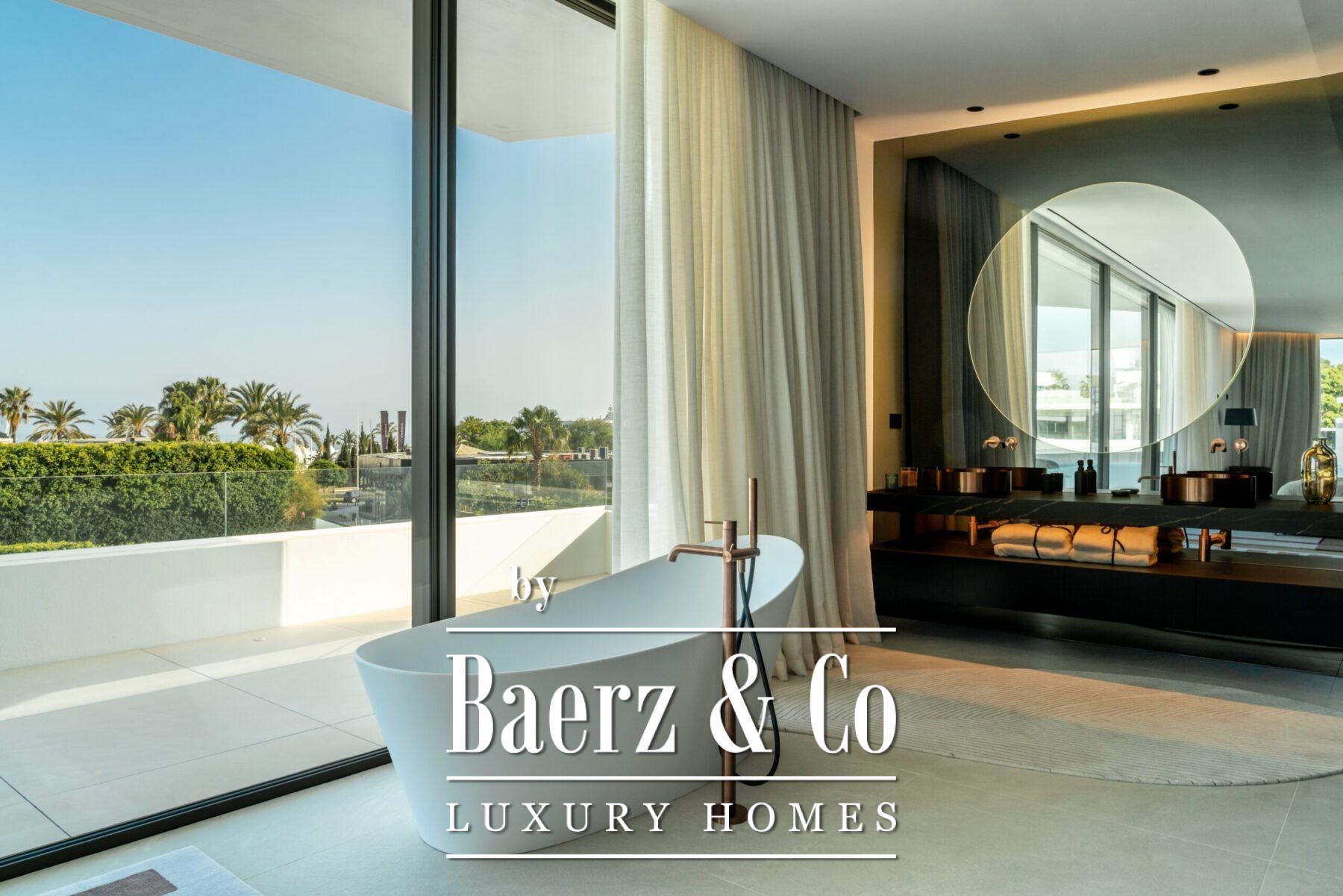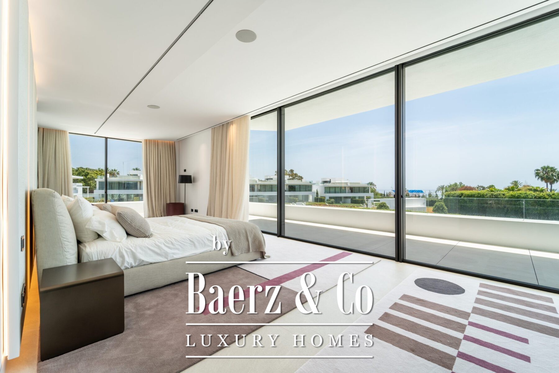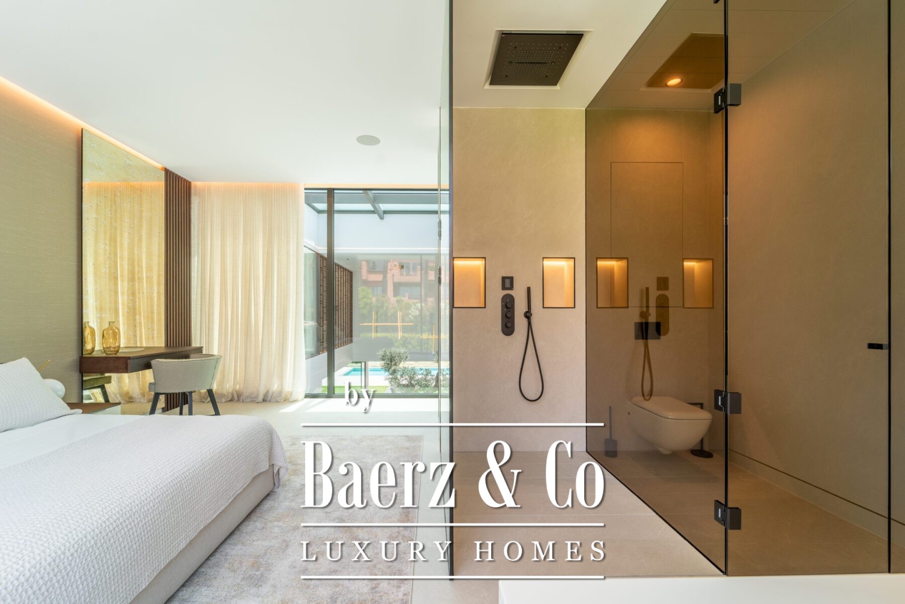 Refined in its execution, the villa includes five en-suite bedrooms and five bathrooms, each space designed to harmonize with the clear Andalusian light and the Mediterranean Sea backdrop. Ground floor living is generous, featuring a large living and dining area, direct terrace access, and a fully equipped kitchen connected to the gardens and two private pools. Upstairs, private terraces unfold from every bedroom, with the master suite distinguished by a sizeable dressing room and long sea views extending across the Golden Mile.