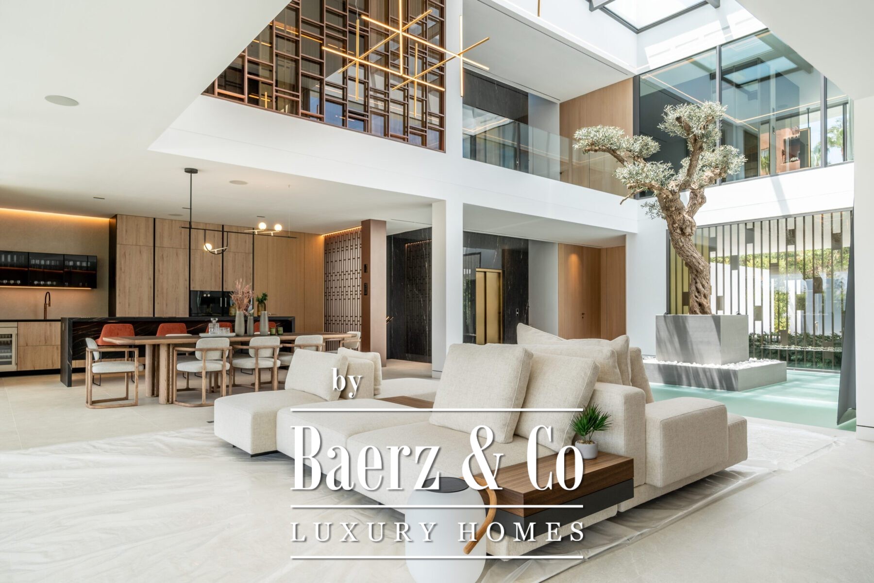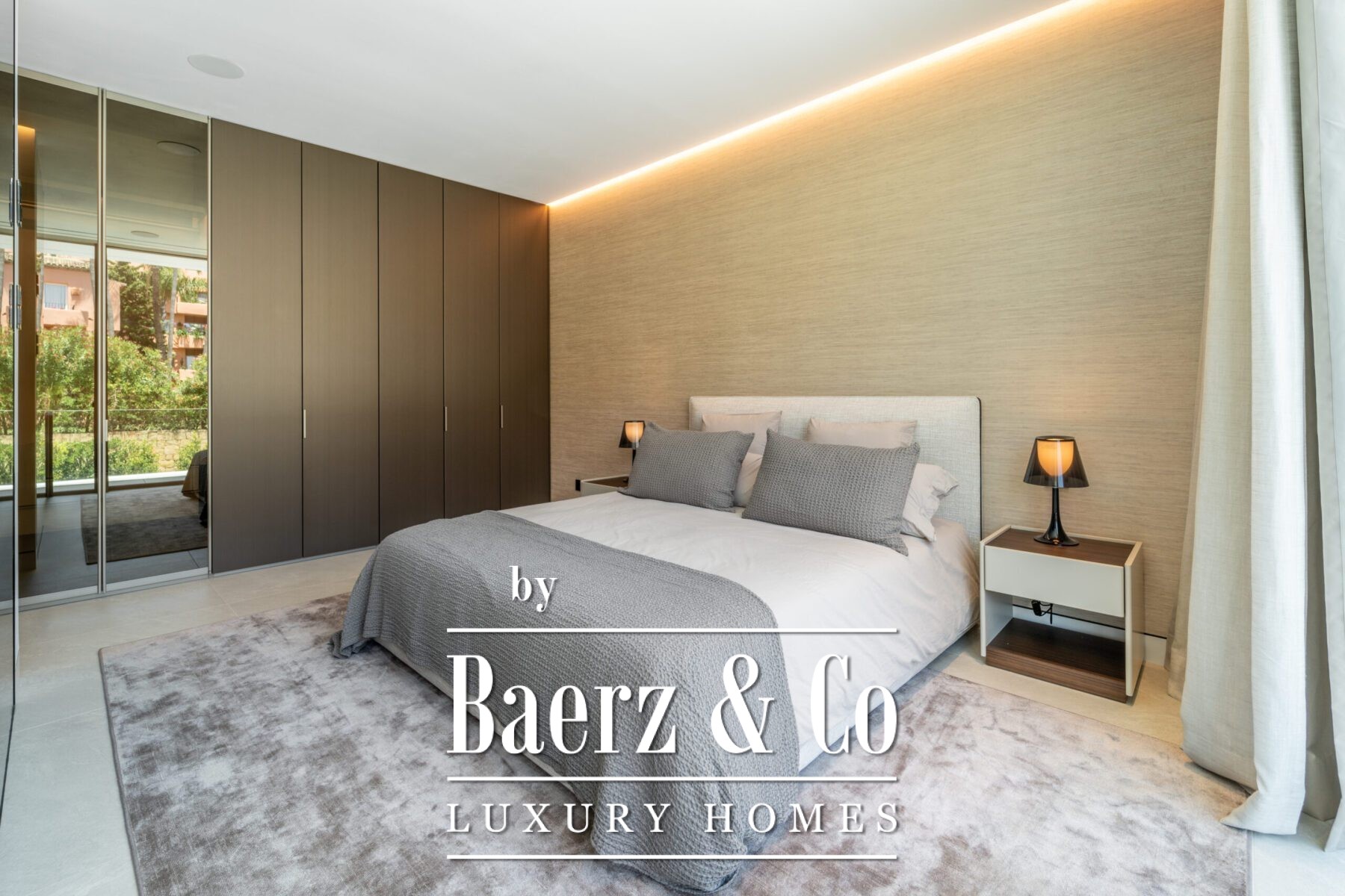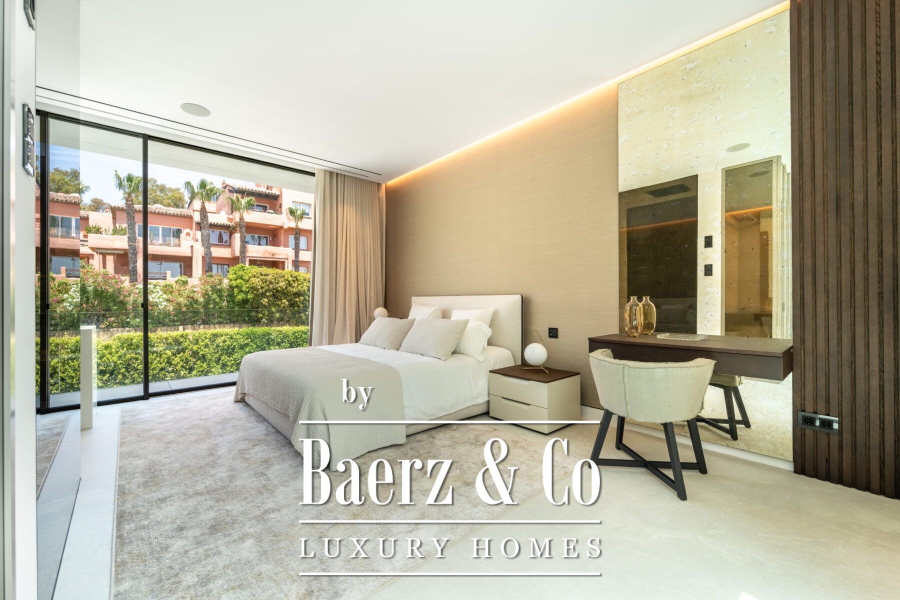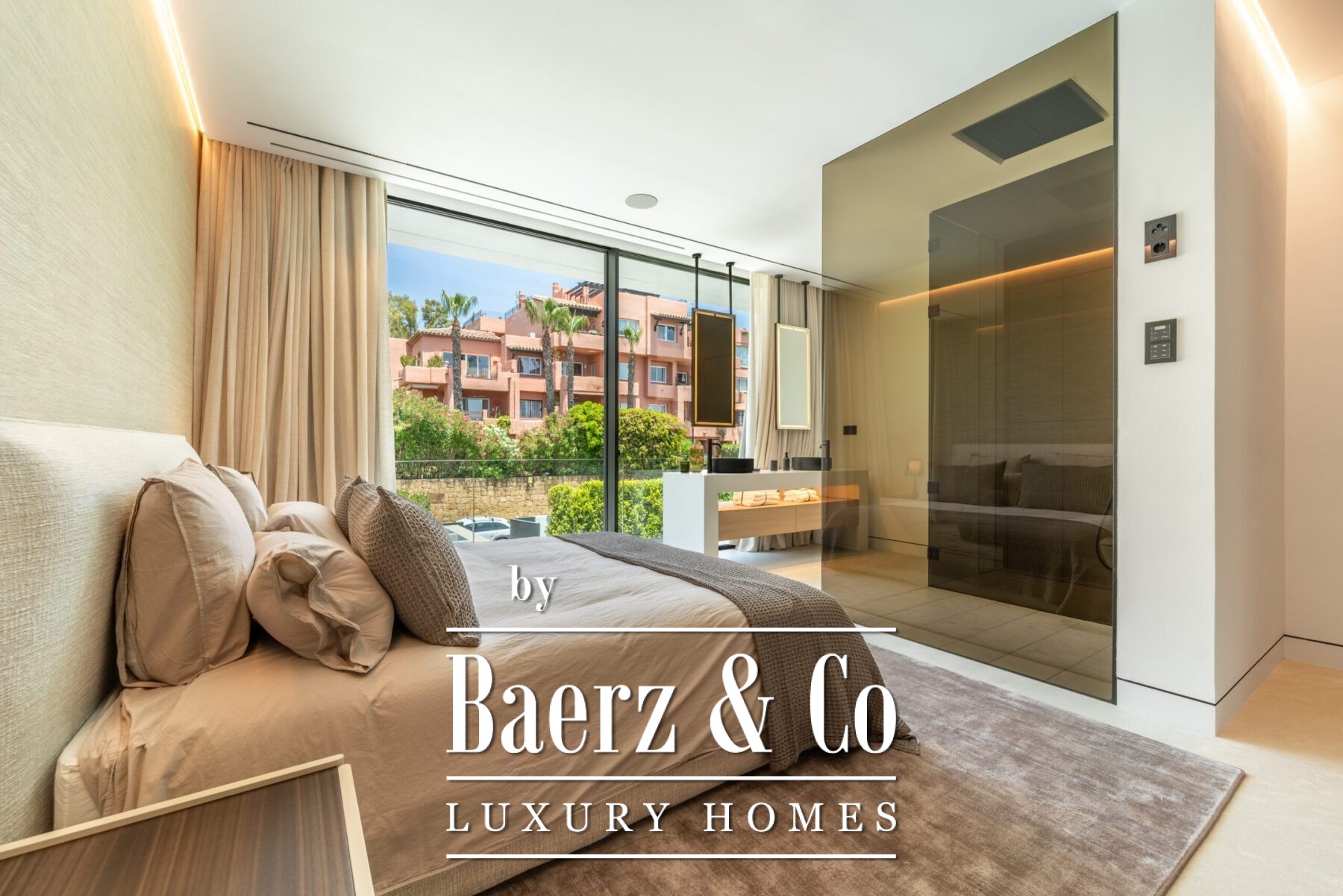 Refined in its execution, the villa includes five en-suite bedrooms and five bathrooms, each space designed to harmonize with the clear Andalusian light and the Mediterranean Sea backdrop. Ground floor living is generous, featuring a large living and dining area, direct terrace access, and a fully equipped kitchen connected to the gardens and two private pools. Upstairs, private terraces unfold from every bedroom, with the master suite distinguished by a sizeable dressing room and long sea views extending across the Golden Mile.