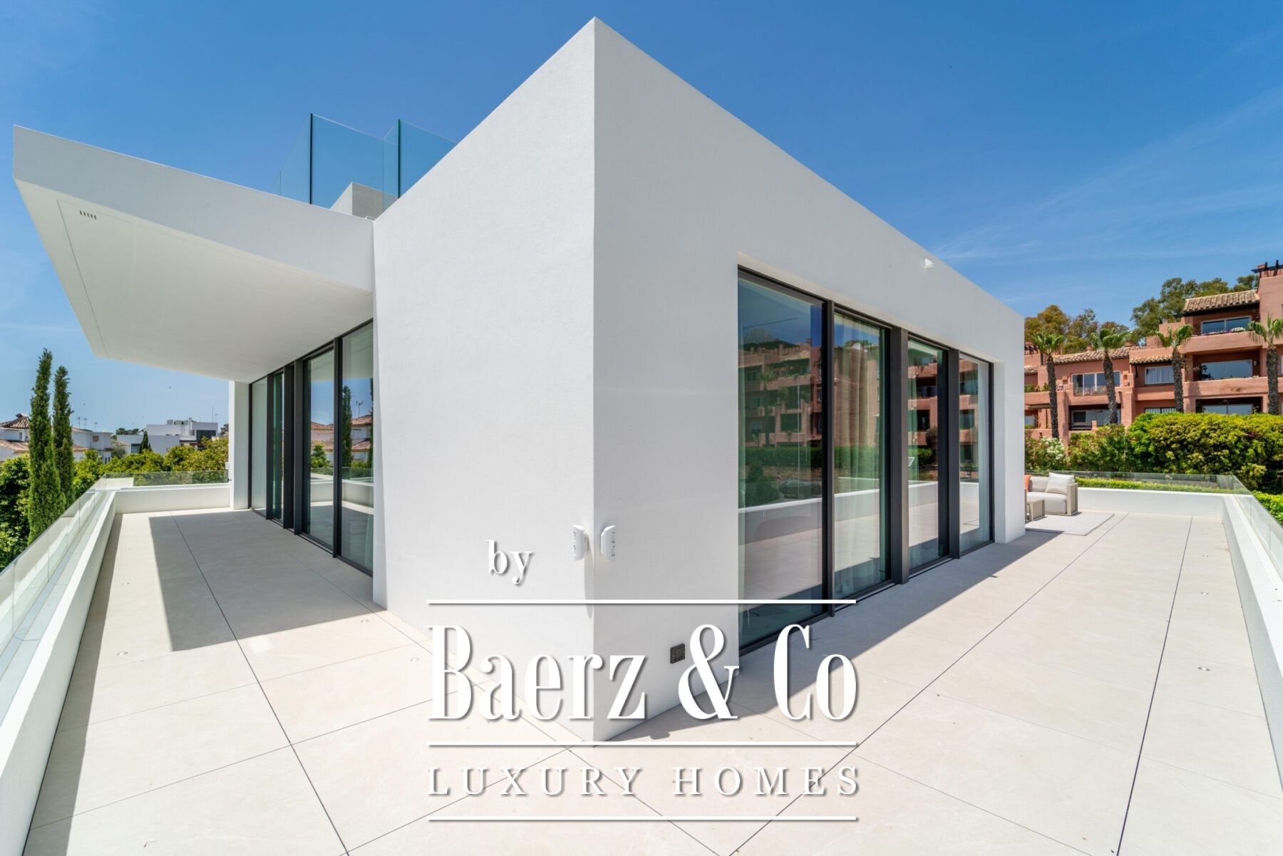 The rooftop solarium, covering 100 m², is dedicated to panoramic dining, a pool, and a tranquil chill-out area—designed for moments set against Marbella’s iconic sunsets. Entertaining is effortless with a cinema room, gym, and a flexible entertainment space in the basement, complemented by a bar, reception area, laundry, and an eight-car garage. Security and comfort are assured with features such as alarm, lift, A/C, UHF, and fireplace.
