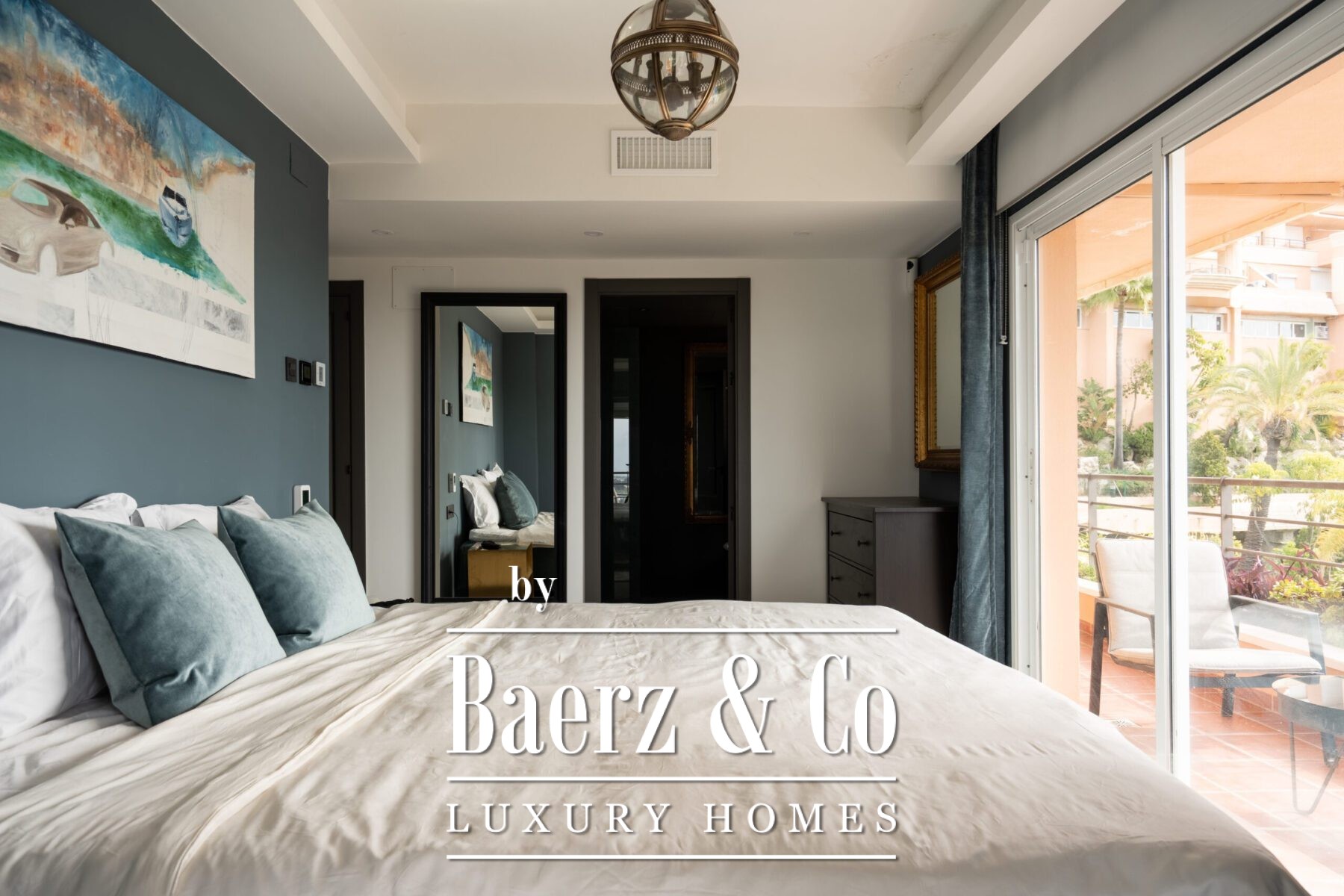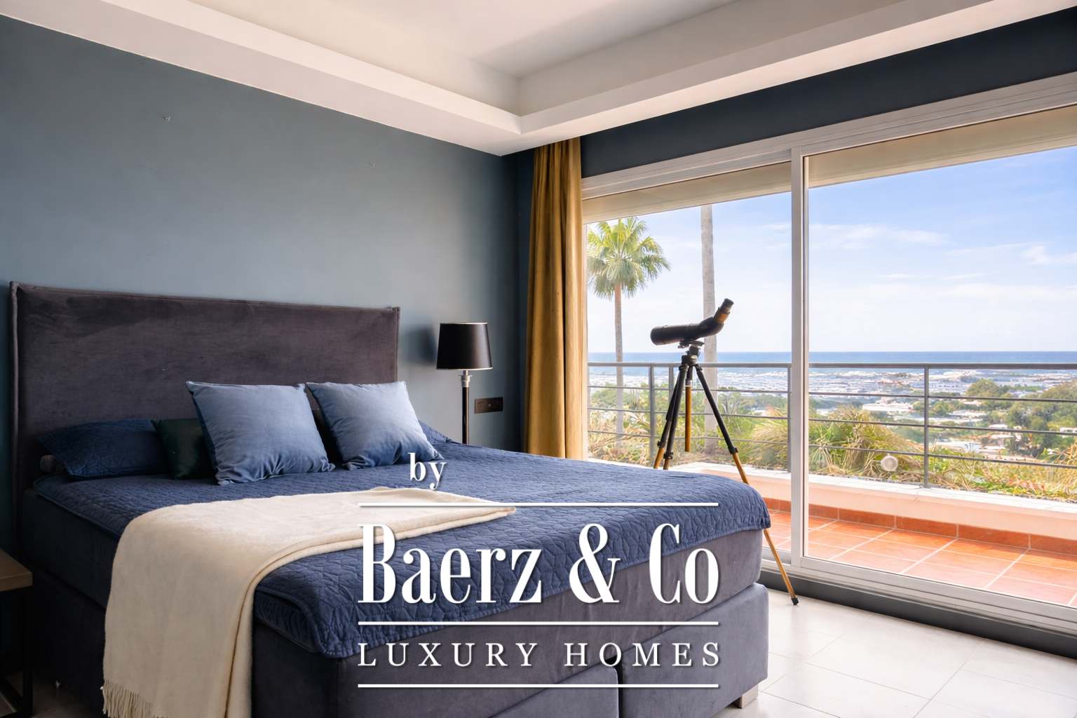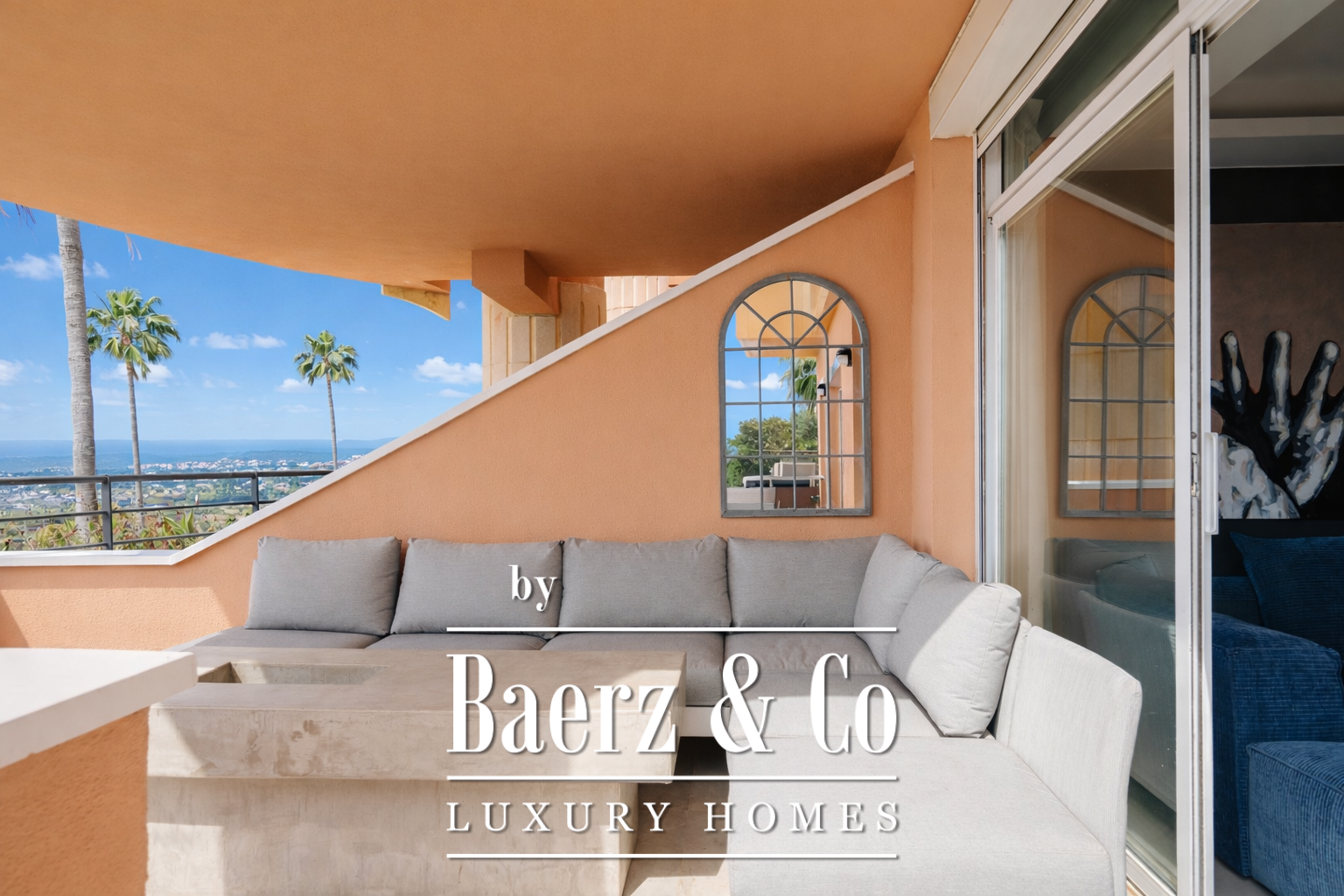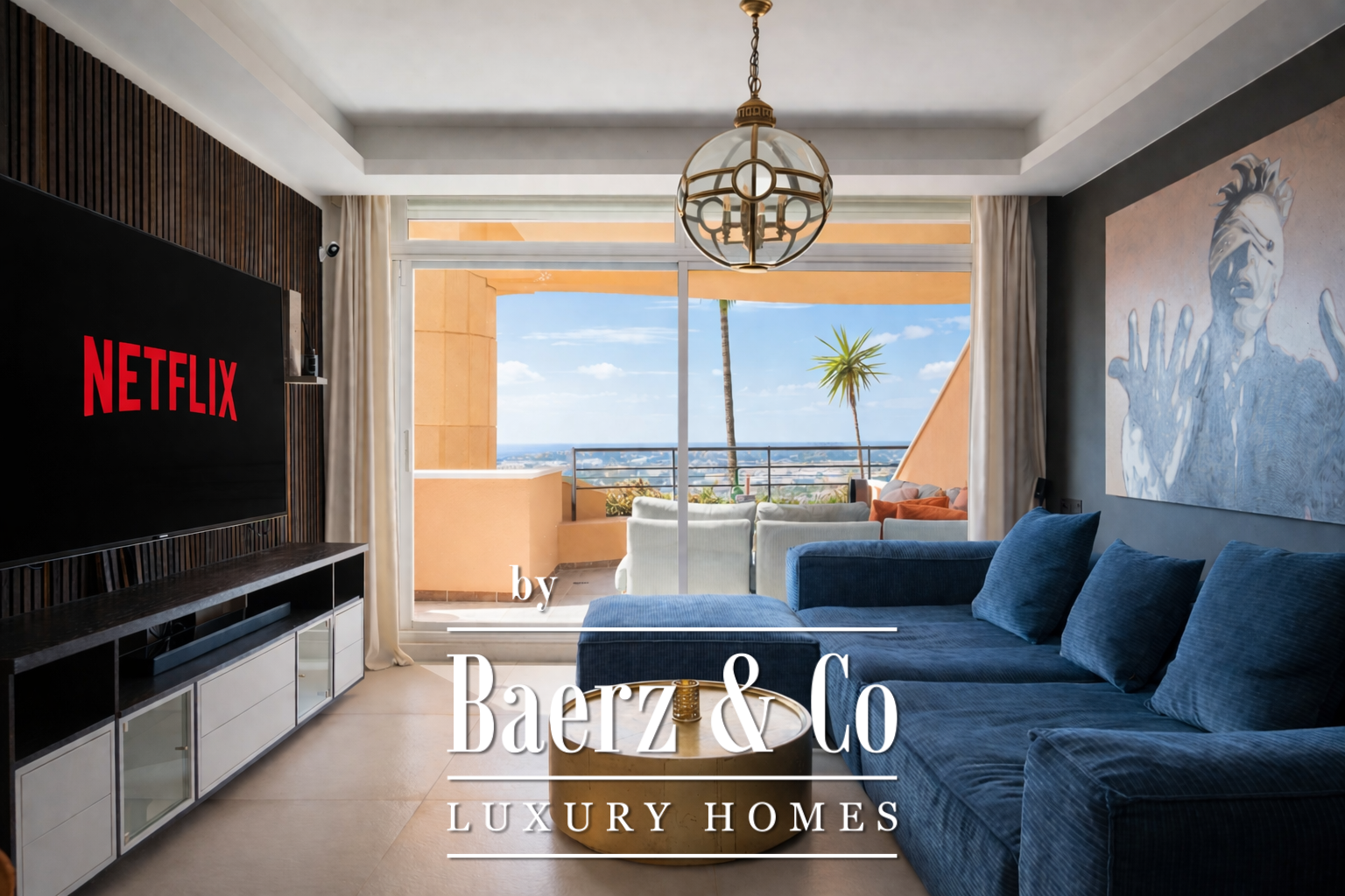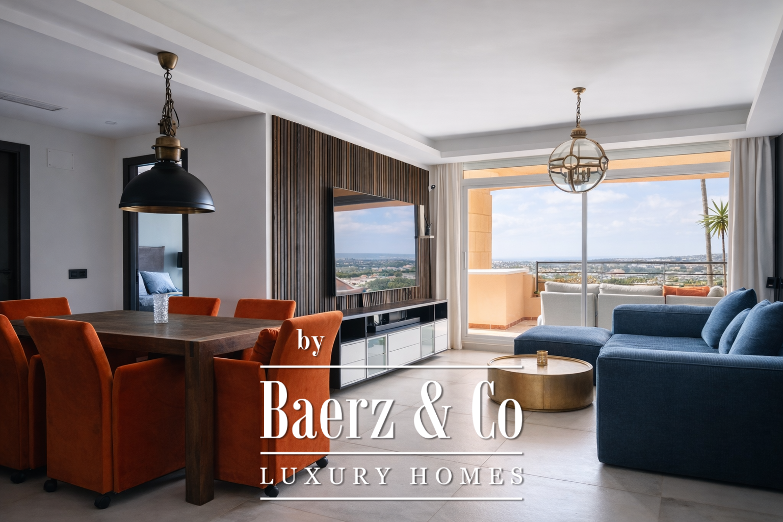 Apartment Marbella with panoramic sea and golf views offers a newly renovated living environment designed for comfort and understated distinction. This apartment presents three bedrooms and three bathrooms, where an open plan kitchen flows seamlessly into the living area, enhanced by expansive sliding doors connecting to a generous terrace. Sunlight fills the interior spaces, while every bedroom provides direct access to the terrace for a continuous sense of openness.