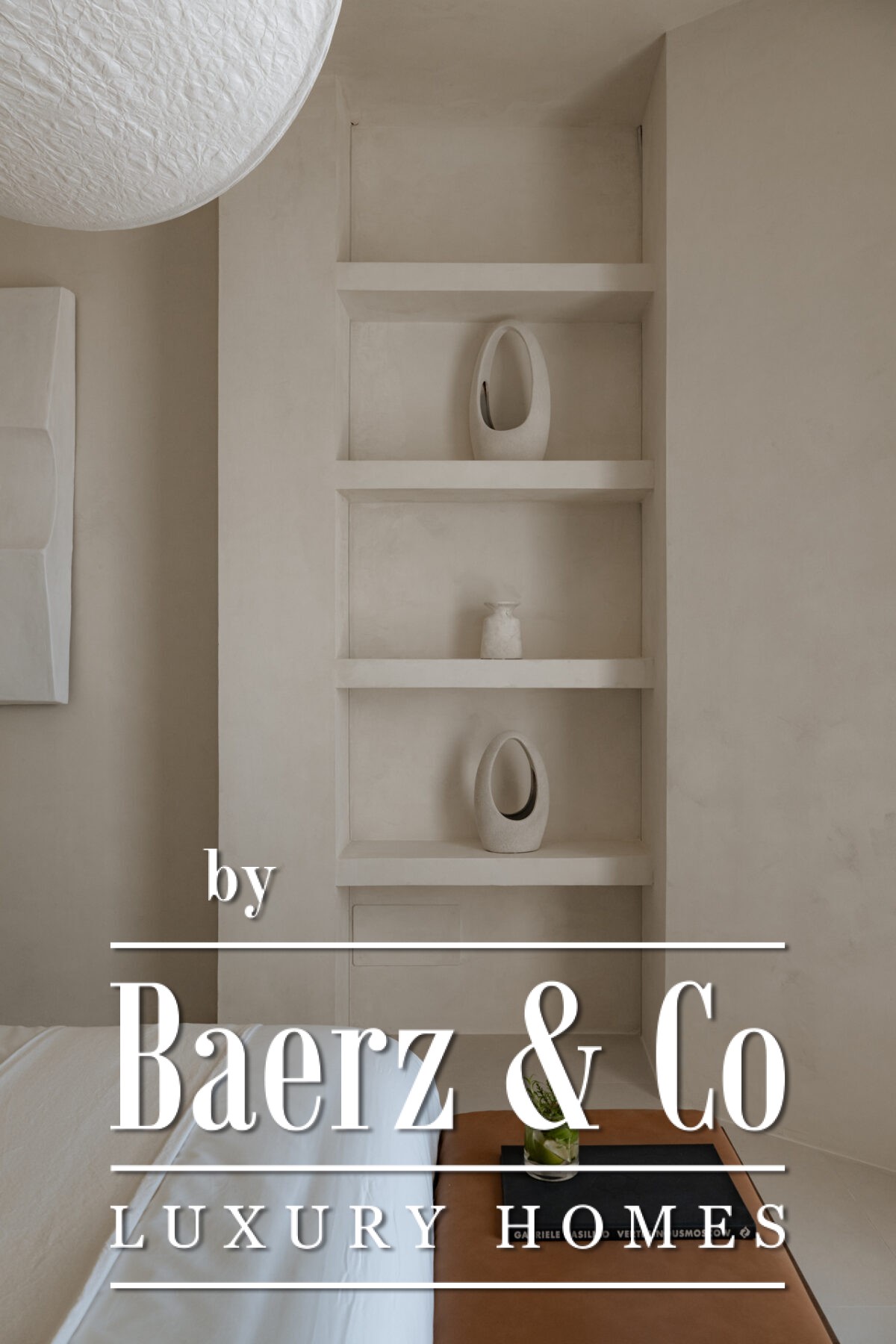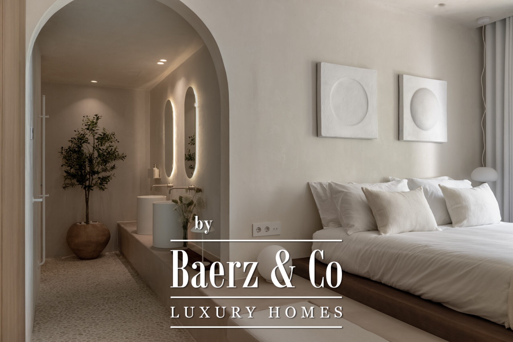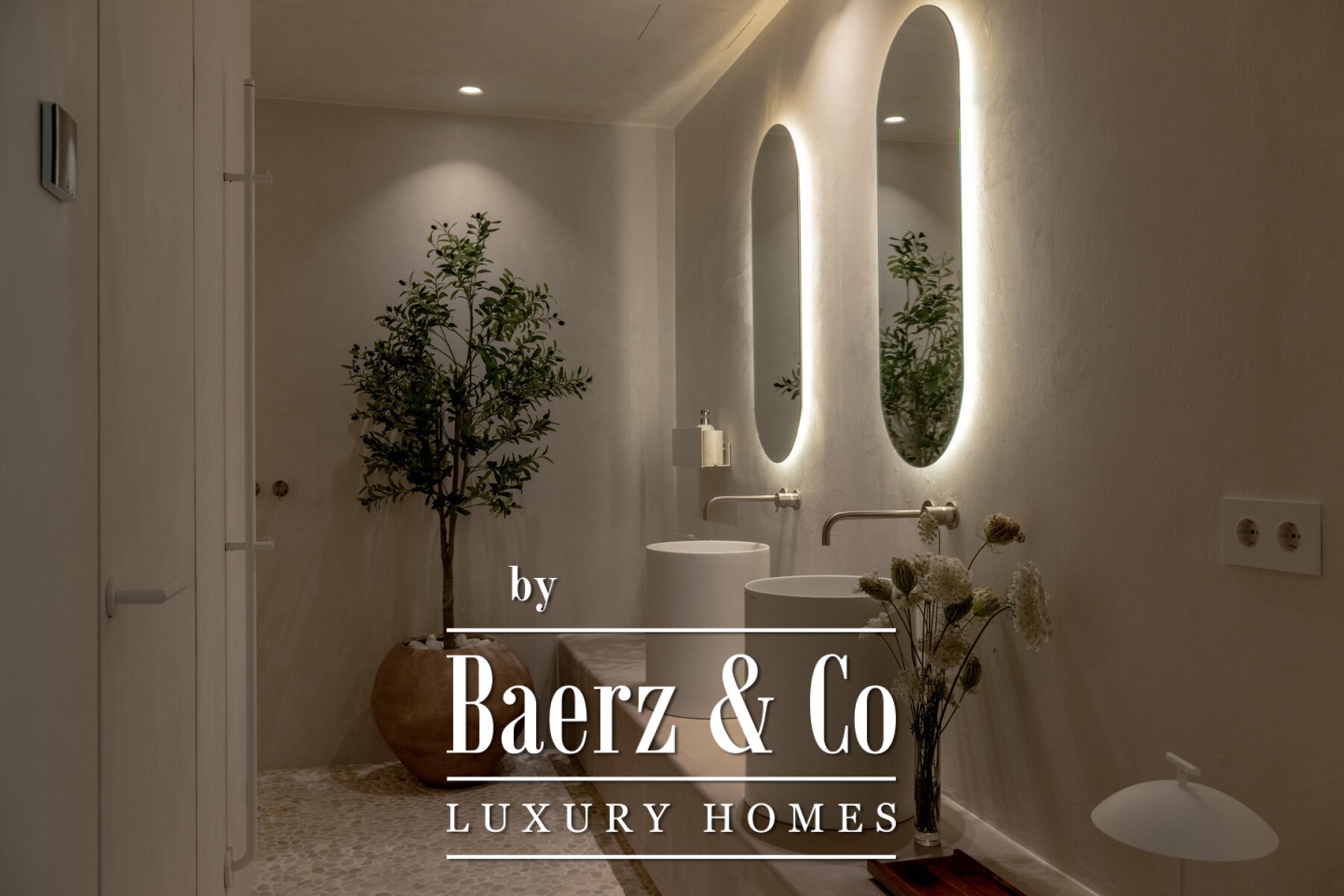 The main floor is crafted for connection and ease, with a fully equipped kitchen and central island, a wine bodega for collectors, and a dining area with views to the sea. The living space opens to a terrace ideal for outdoor dining and relaxation. The master suite is thoughtfully divided, featuring a restful area with terrace access, a walk-in closet, bathroom with rain shower, double sink, and a secluded outdoor bathtub terrace.