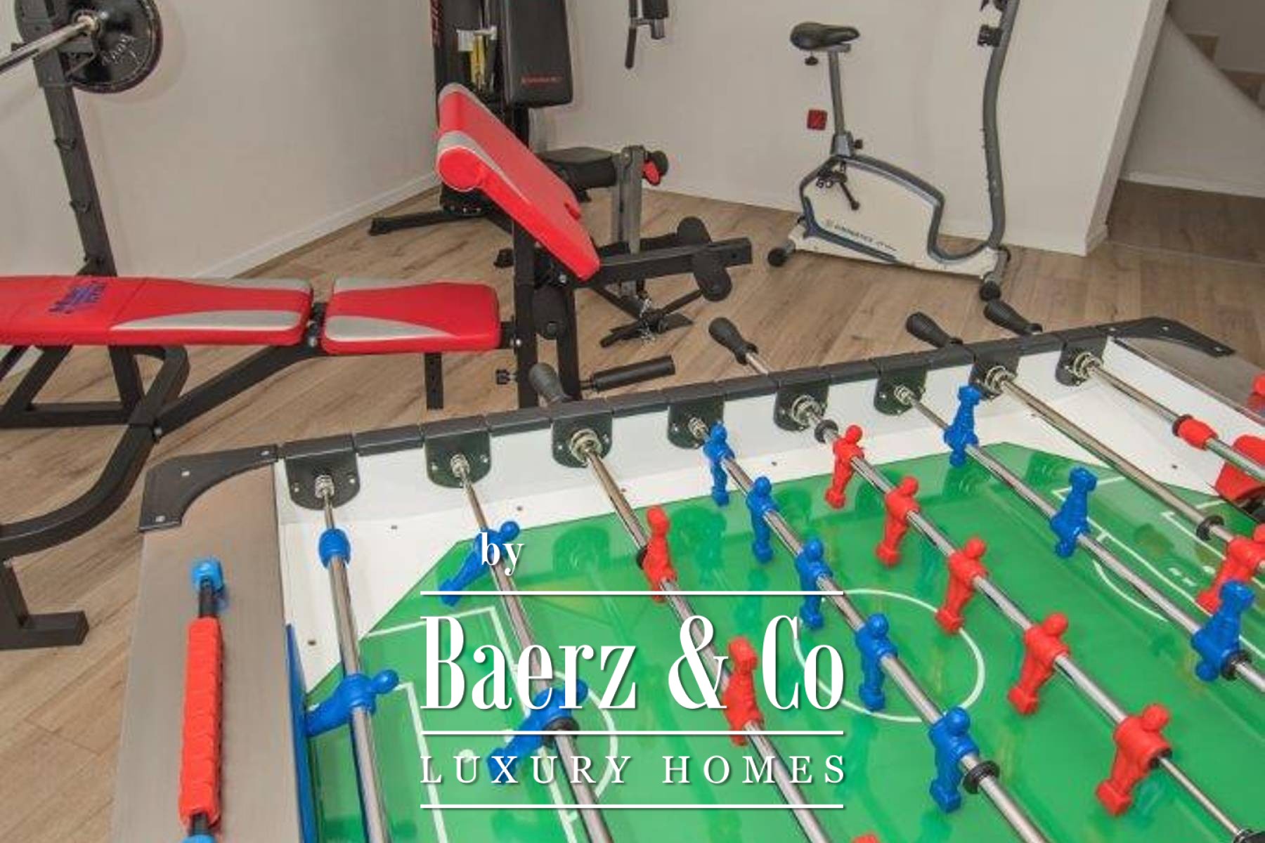 Five bedrooms are arranged for both comfort and serenity, each complemented by contemporary finishes. Three bathrooms and five air conditioning units assure ease across seasons. The layout encompasses a private gym and provides the capacity to park four vehicles within the garden grounds. Meticulous attention extends outdoors, where the pool flows into the green landscape and the ambiance is quietly Mediterranean.