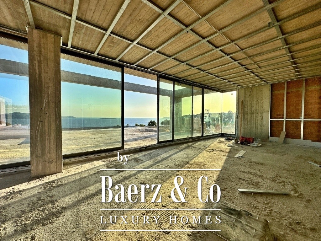Inside, the open plan living room and kitchen are crowned by glazed windows, creating seamless transitions between interior and the Ionian panorama beyond. The island kitchen, set to the side, provides both function and a choreography for indoor and outdoor living. With a single gesture, large glass walls slide open, letting space and light flow freely.