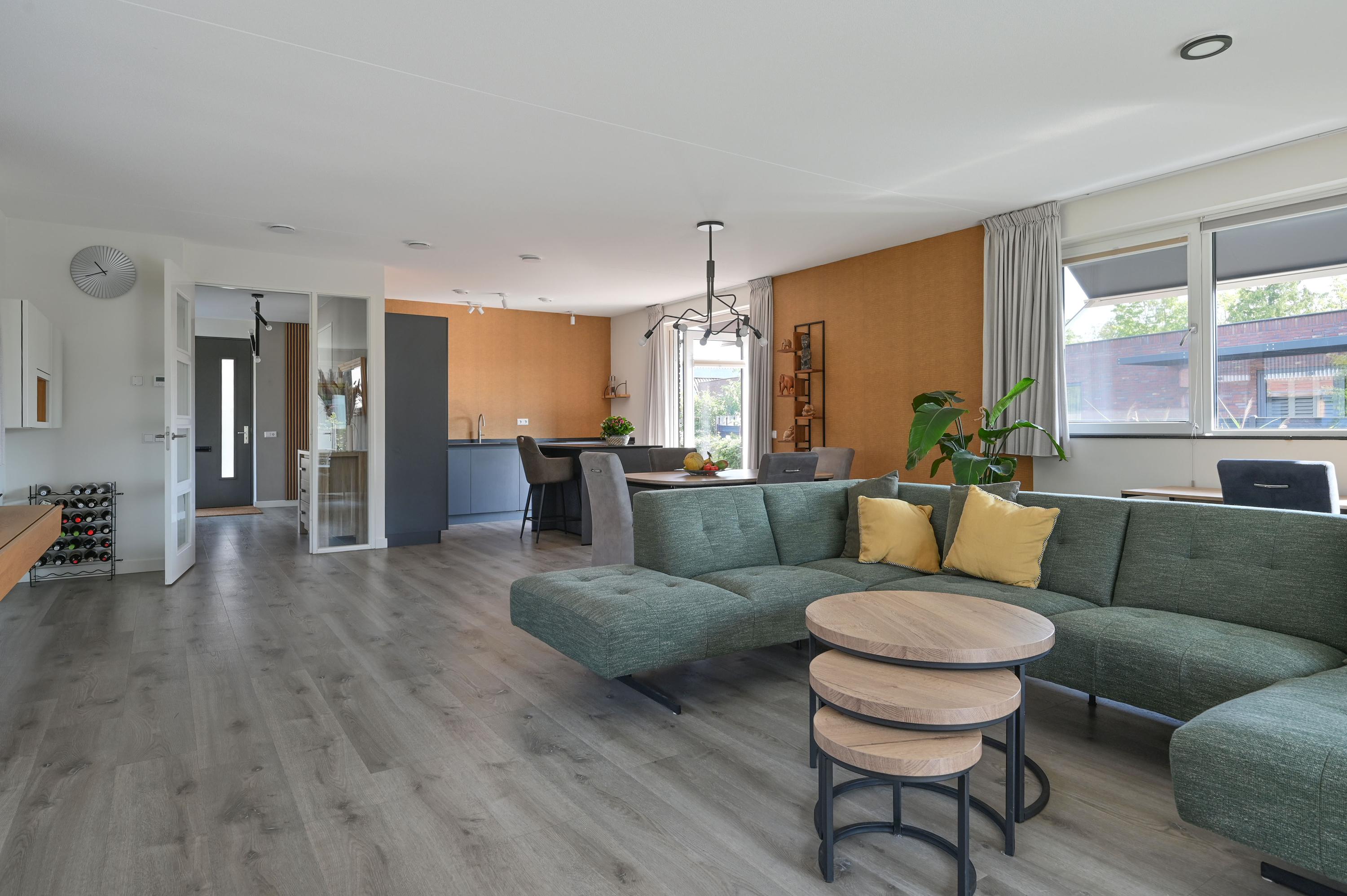 The spacious anthracite gravel driveway offers parking for two cars and includes a private charging station. From here you reach the stylish entrance of the villa. Inside, the generous hall with a large corner window immediately catches the eye, flooding the space with natural light. From the hall, you have access to various rooms and the staircase to the first floor.