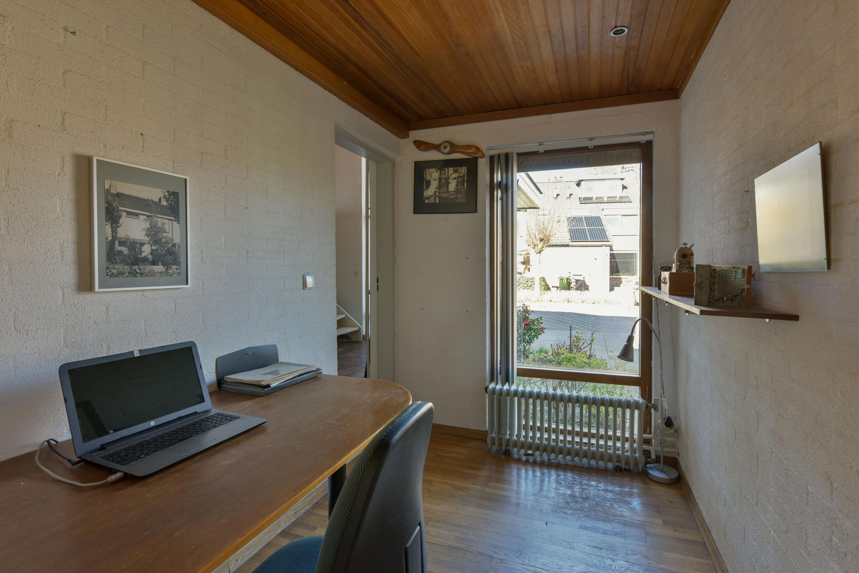 The office on the ground floor is a quiet and comfortable space — ideal for working from home, studying, or hobbies. At the front, the square-shaped living room offers a cozy atmosphere with a wood-burning stove. A recessed nook adds a playful element and is perfect as a reading corner, workspace, or children’s play area. At the rear, a door leads to the garden, seamlessly connecting indoor and outdoor living on sunny days.