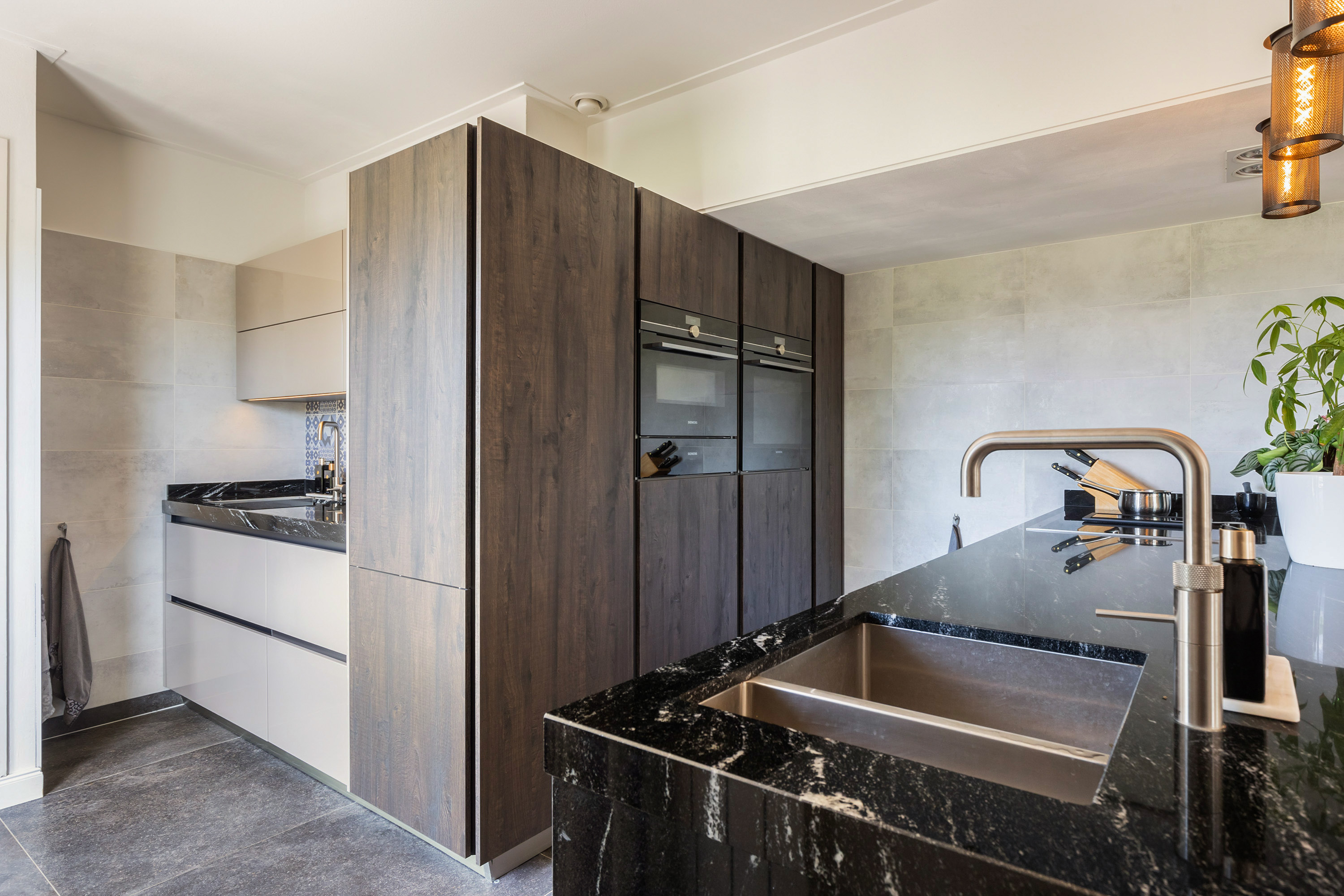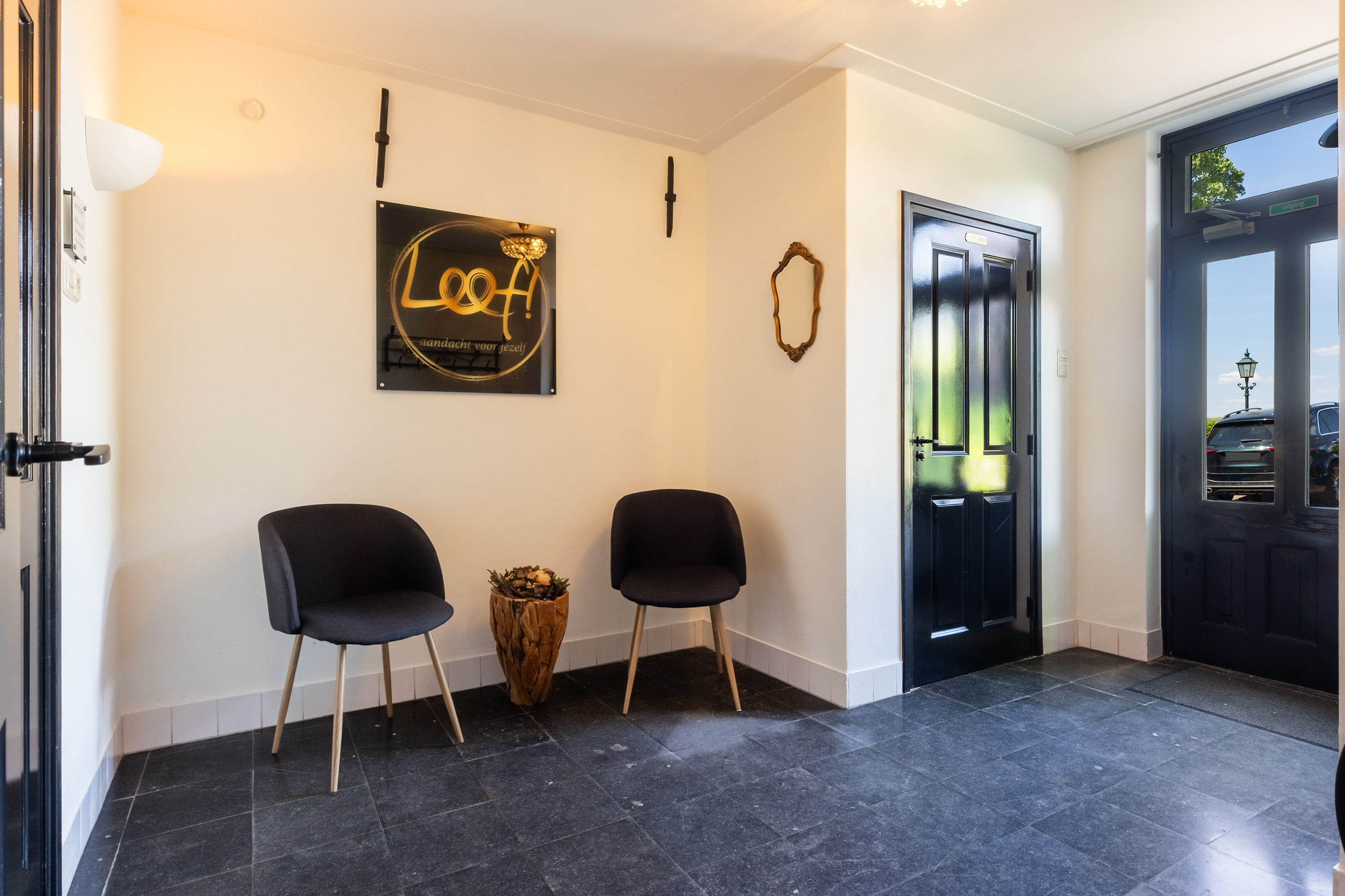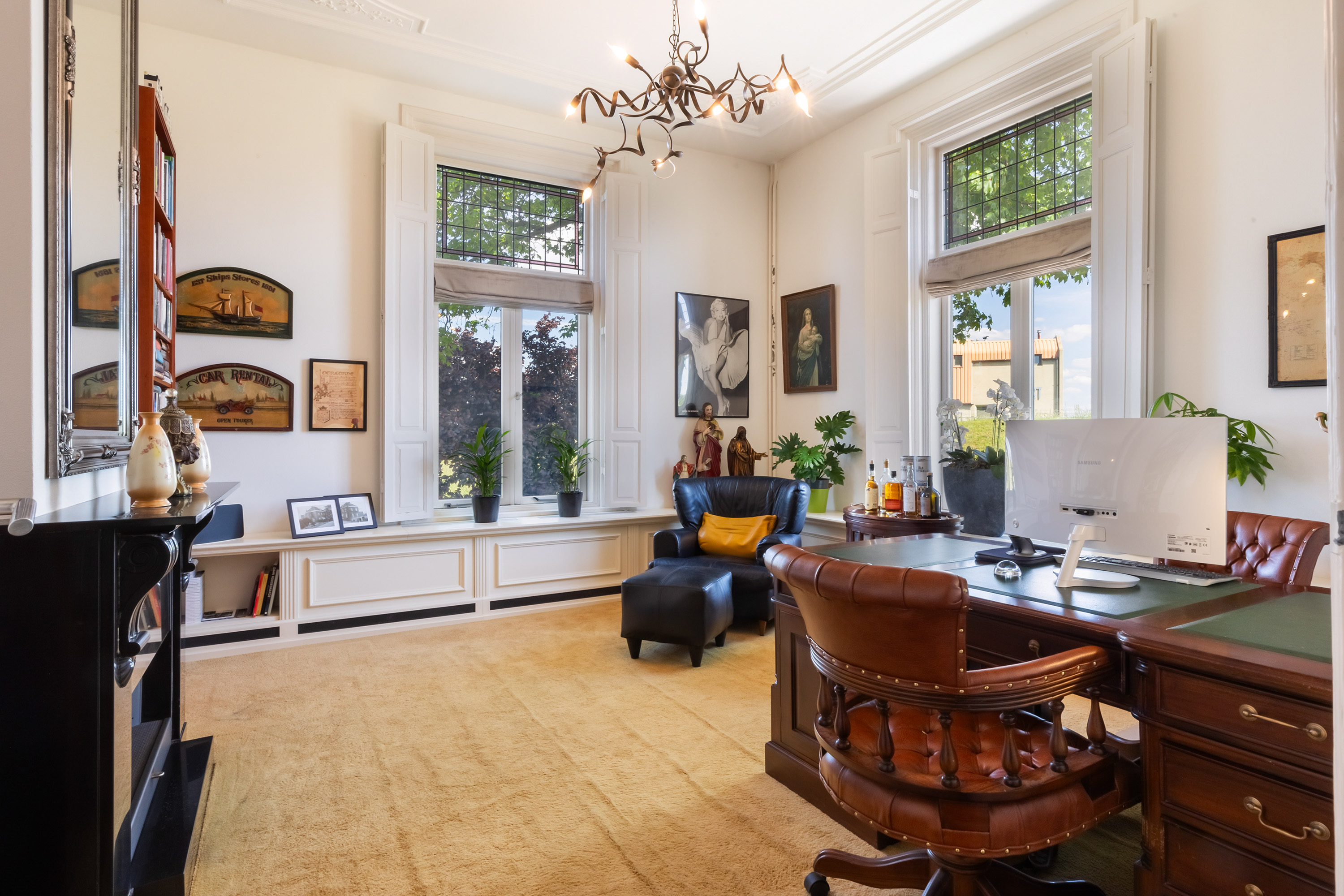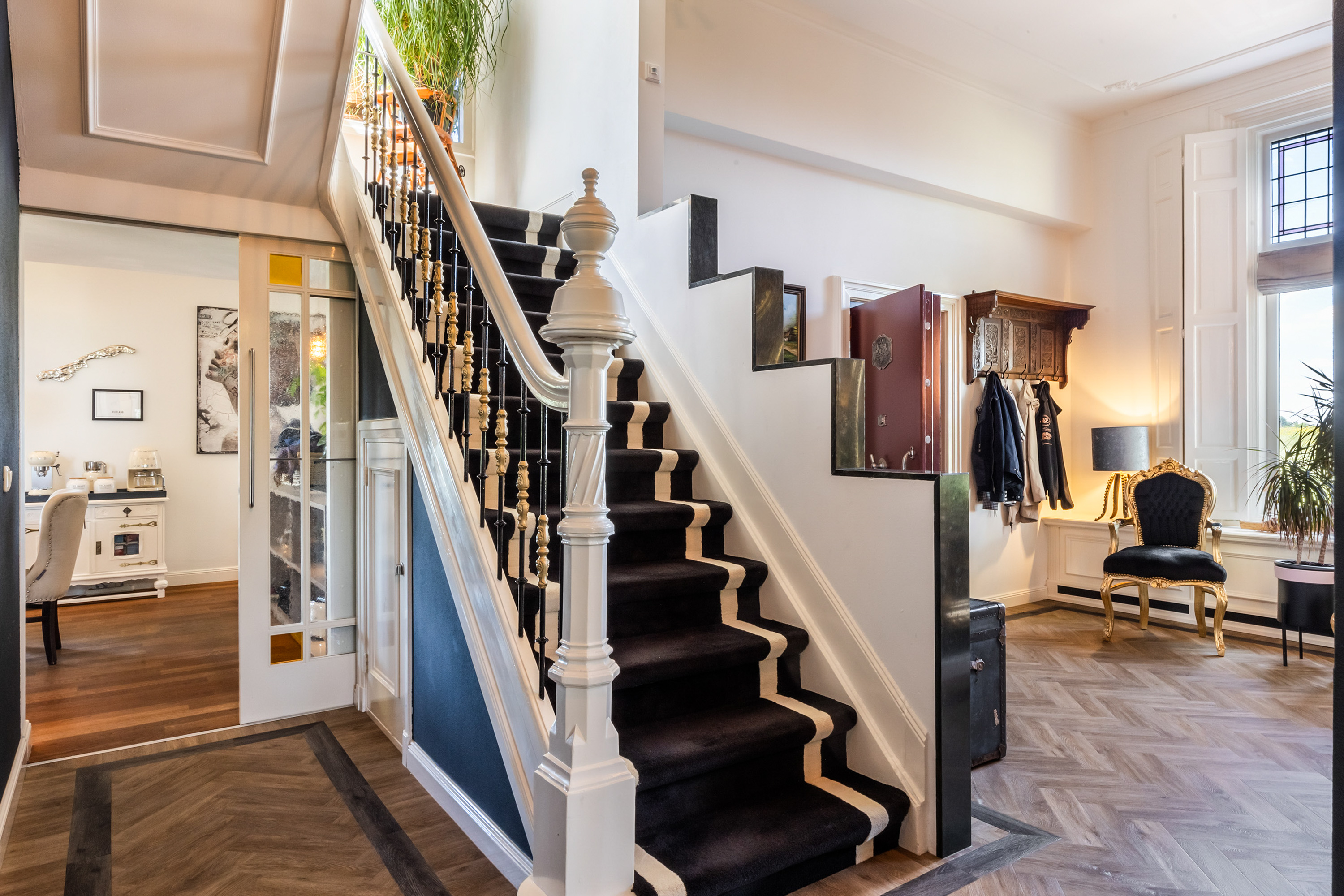 The villa distinguishes itself not only by its setting, but also by its versatility. Arranged over four full floors, the layout naturally accommodates a combination of living, working and hosting. At dike level lies the heart of the home: an elegant living floor where various living spaces flow seamlessly together. From the vestibule, one enters a generous study with fireplace and views across the river. The adjoining living room, dining area and open-plan kitchen form a cohesive and spacious environment, unified by a stylish double-sided fireplace. Large windows and French doors provide direct access to the balcony, where uninterrupted views over the water and surrounding countryside create an ever-changing and captivating backdrop.