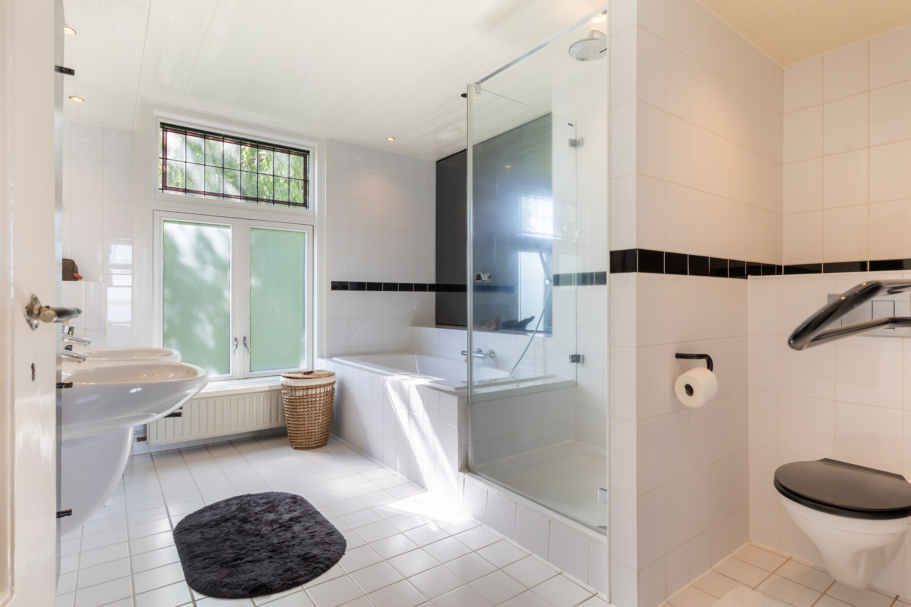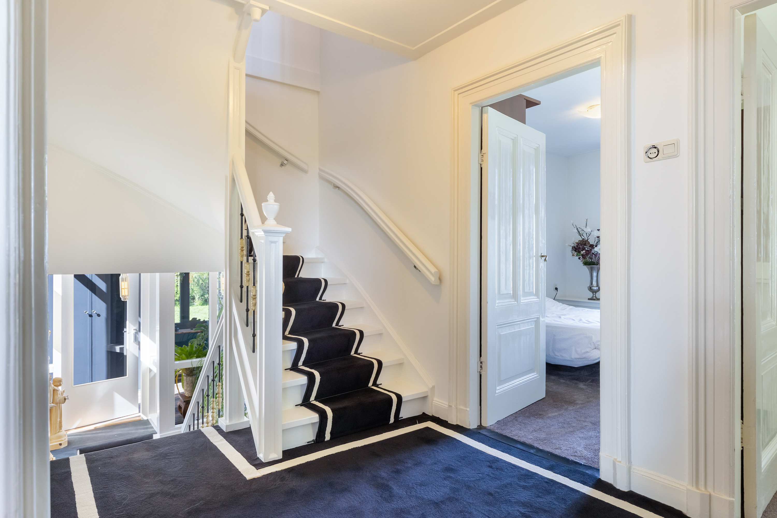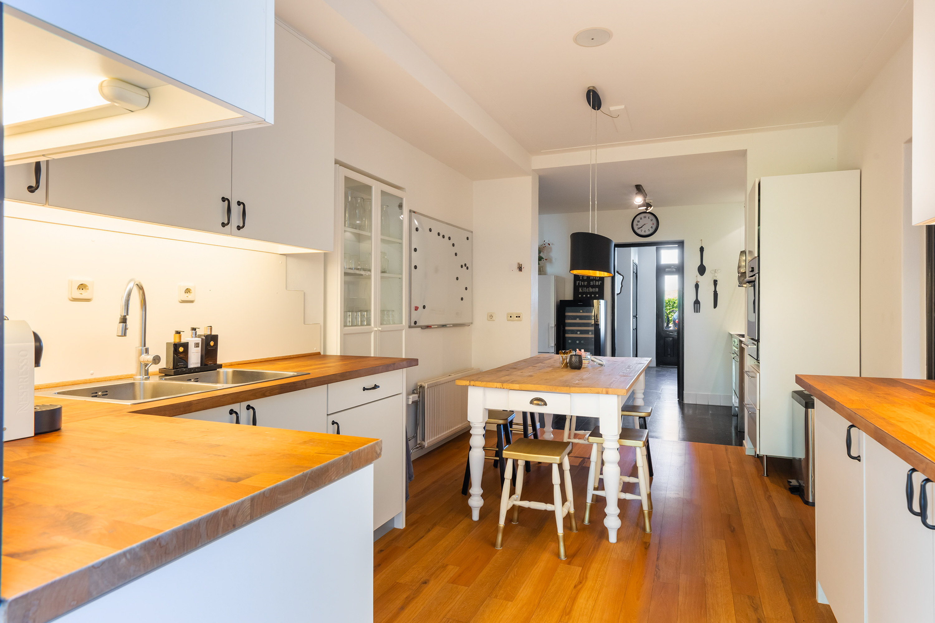 The outdoor space forms a natural extension of the home. The garden, redesigned in 2022, has been thoughtfully arranged with a focus on tranquillity and usability. Clean lines are combined with natural planting, and multiple terraces offer both sun and shade throughout the day. The veranda, featuring a timber beam ceiling and prepared for an outdoor kitchen and wellness facilities, enhances the enjoyment of outdoor living. To the side of the plot, a second garden area with lawn and a graceful weeping willow adds to the sense of greenery and privacy.