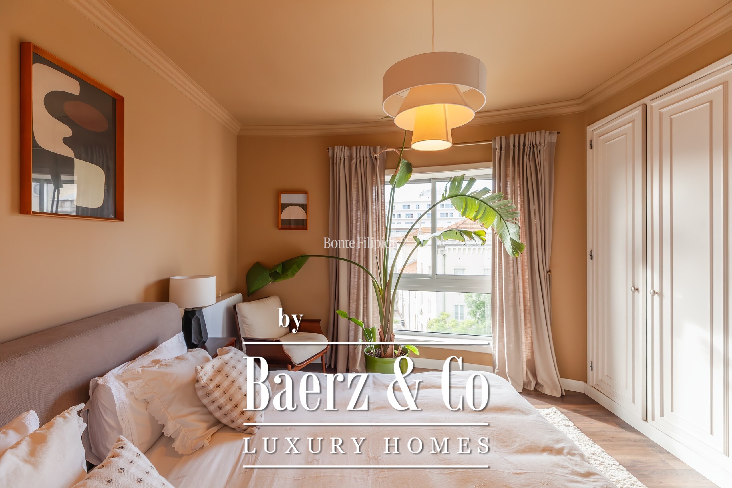 Each of the four bedrooms retains an understated sense of scale, complemented by three full bathrooms. The apartment merges traditional Lisbon elegance—high ceilings, wooden floors, original detailing—with considered modern comfort. The building provides lift access, secure parking, and thoughtful amenities.