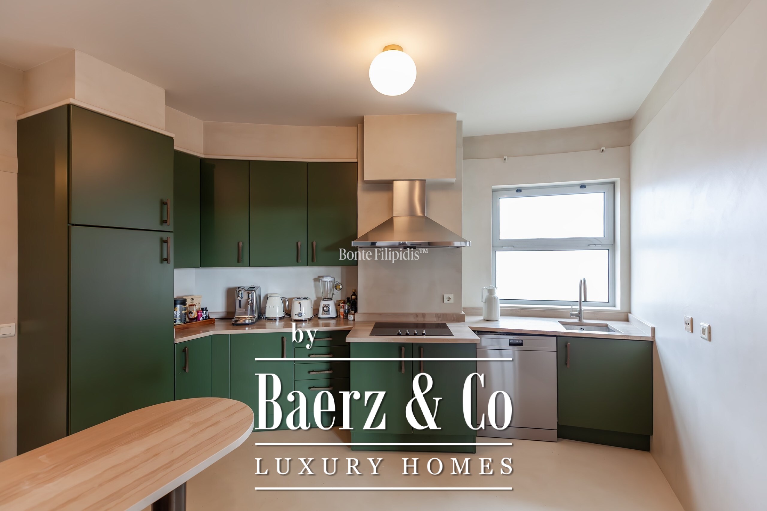 Wide windows in the living and dining room invite serene river views and lead to a spacious balcony, creating a seamless connection between interior and exterior space. A fireplace anchors the room, offering warmth and a gathering point during Lisbon’s cooler evenings. The kitchen is fully equipped with contemporary appliances and an integrated laundry, delivering both function and discretion.