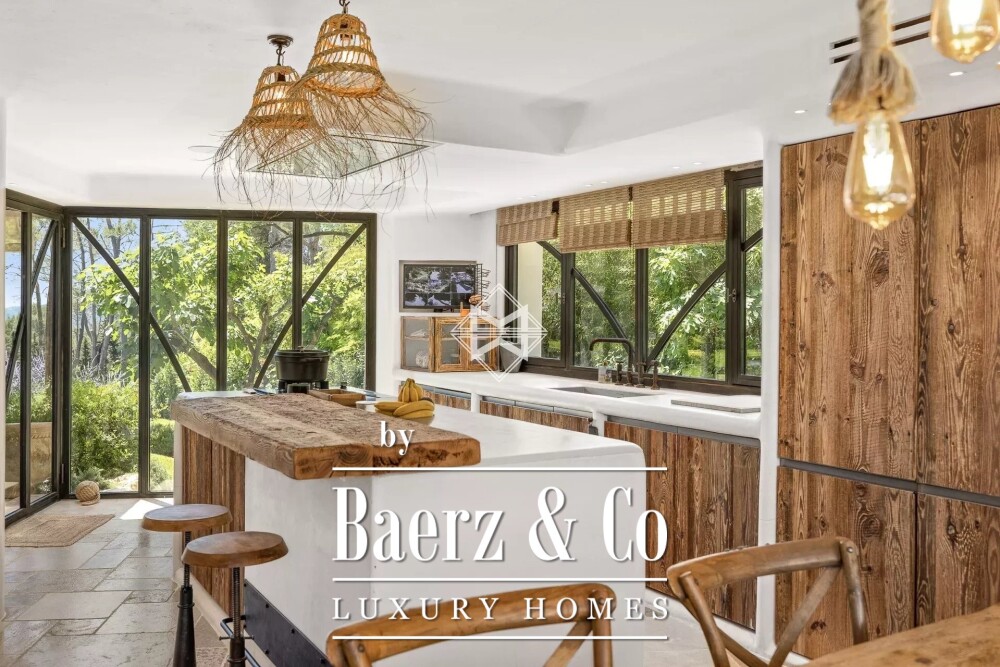 Villa Mougins, set in a prized residential pocket of Mougins, embodies Mediterranean poise. This villa Mougins offers 400 m² of thoughtfully restored interiors, where stone floors, wood panelling, and natural parquet lend tactile warmth to every room. The property opens onto panoramic views of green hills and forest, suffusing the home with a sense of calm and privacy.