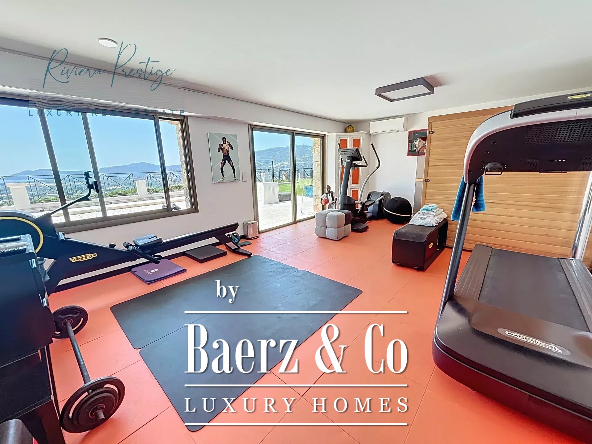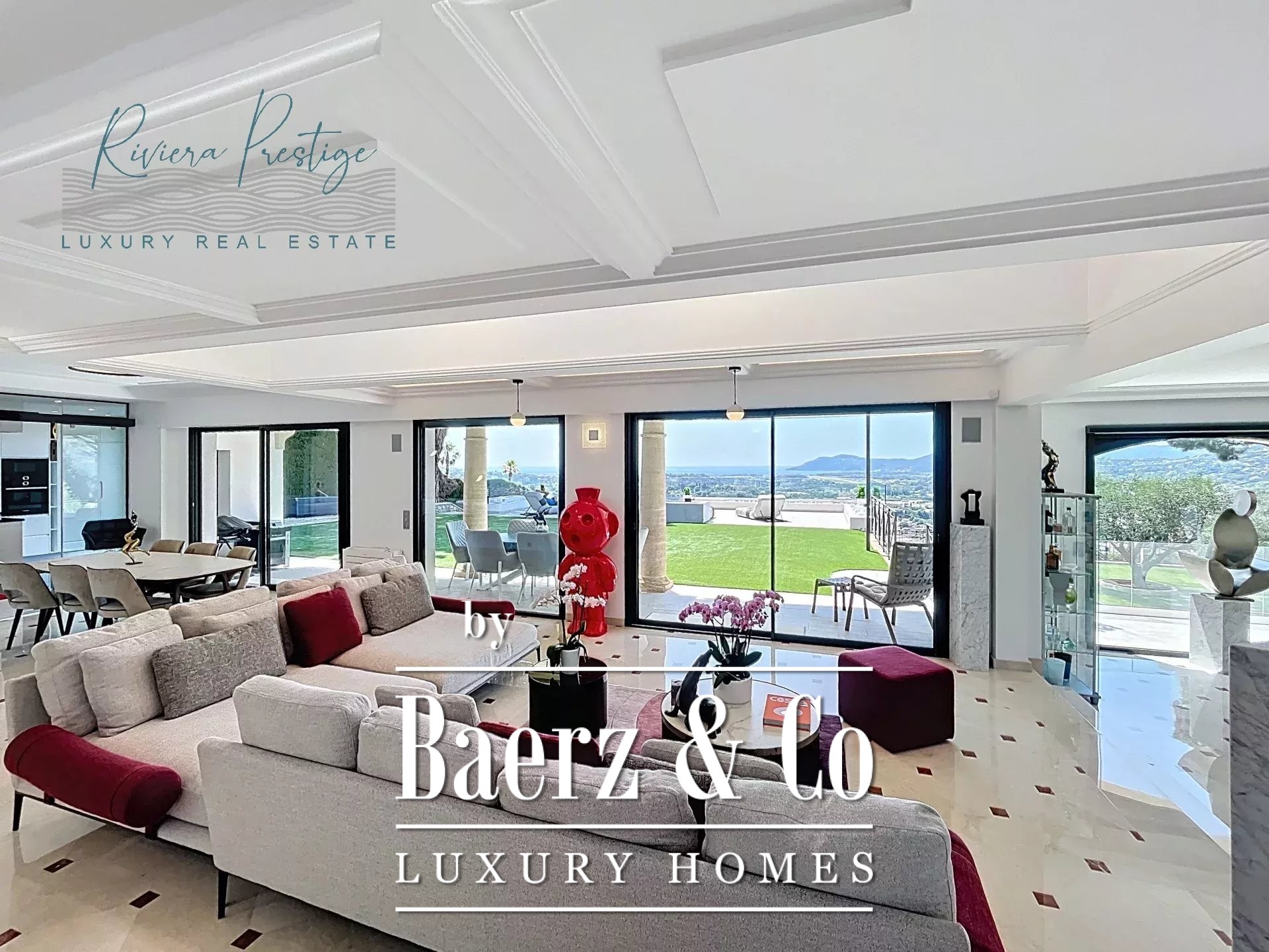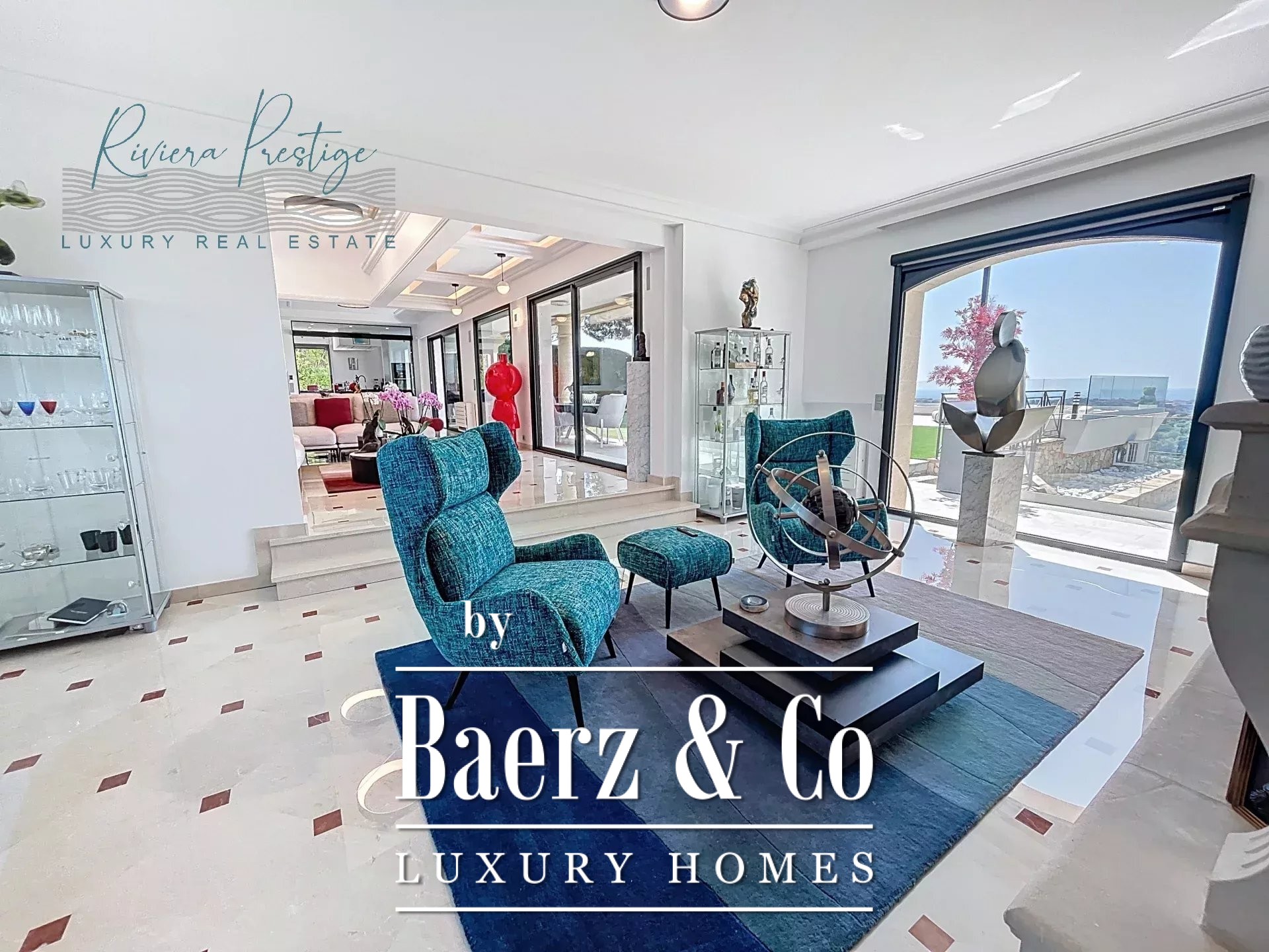 Villa Mougins presents a rare vantage point over the Mediterranean, offering uninterrupted sea views from its privileged setting near the Royal Golf Club. This seven-bedroom villa extends across 447 m² of living space, orchestrated for refined comfort and elegant daily living. The main living areas are spacious and purposeful, opening towards a landscaped garden that anchors the home in tranquility. Air conditioning ensures year-round comfort, while a whirlpool bath and fireplace enrich moments of retreat.