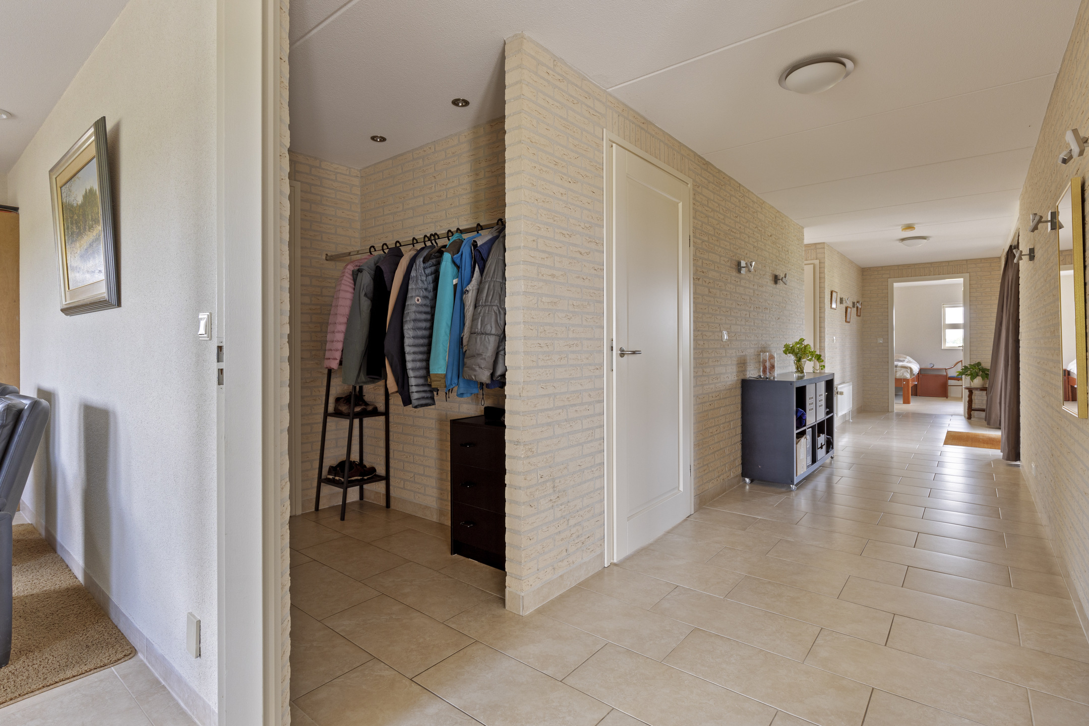 The villa is entirely single-story, barrier-free and with extra-wide doorways. In the genial east, we naturally like to enter from the back, but for form entrance at the front of the house, in the spacious and sunny hall. On the floor is a beautiful, light ceramic tile that works excellently with underfloor heating. The baseboards are integrated with the walls throughout the house, so dusty edges have no chance here. The architect's mission was to create an open, light and sunny home, and he succeeded excellently.