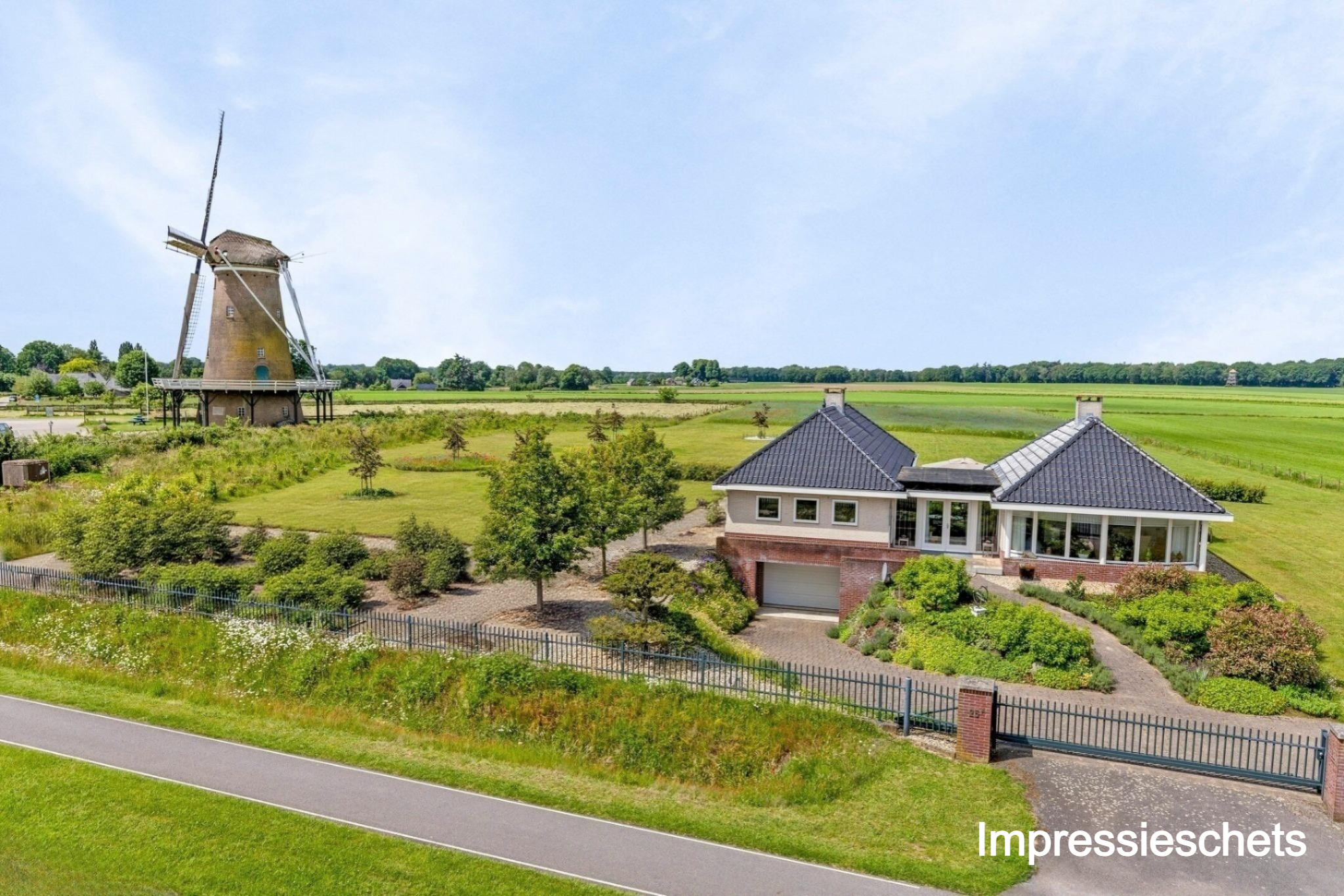 ... for there lies an impressive 1.2ha waiting for you. At the front, the plot is accessed by an electric gate, allowing you to drive straight into the garage. Surface parking is also possible, because the driveway has room for at least eight cars. There is also a charging station, so you always drive away with a full battery.