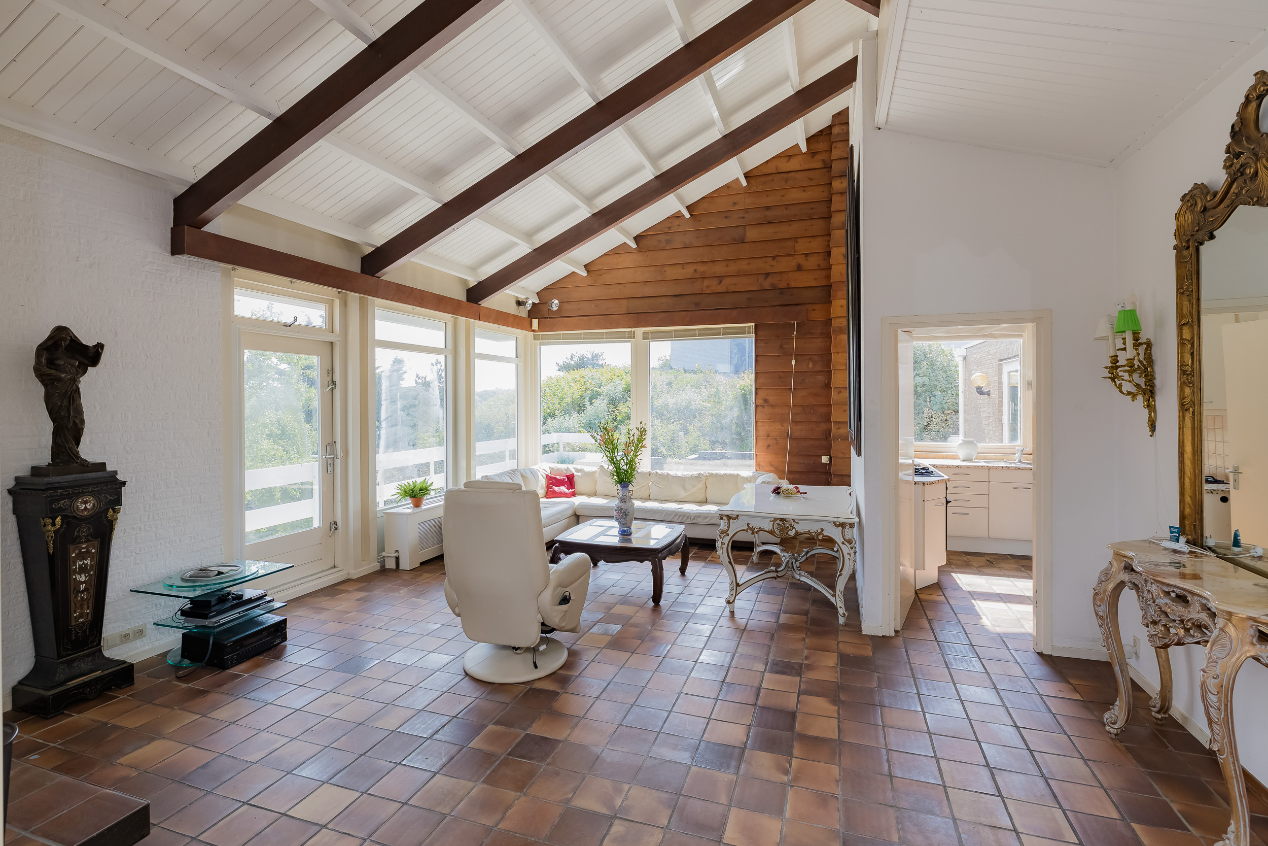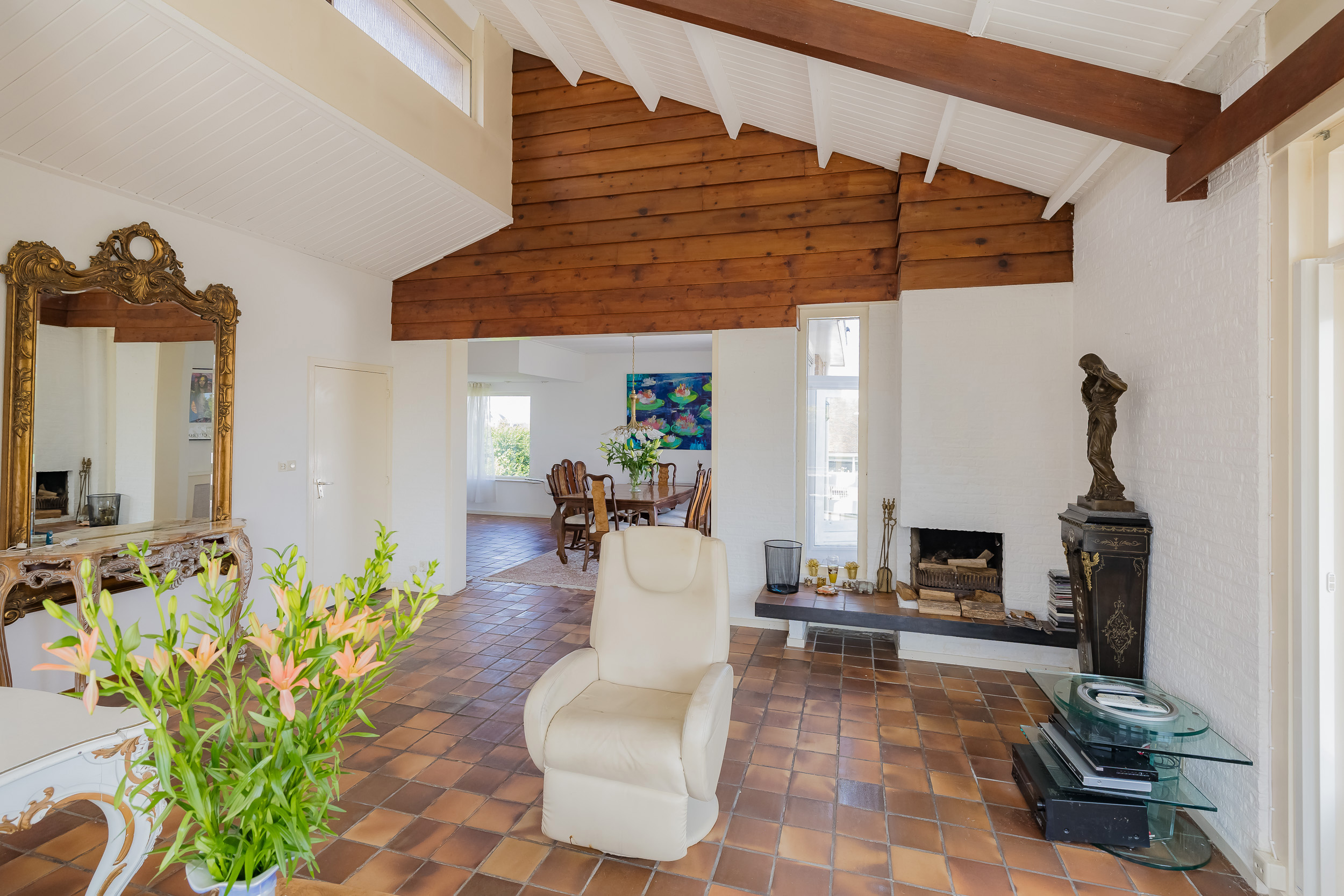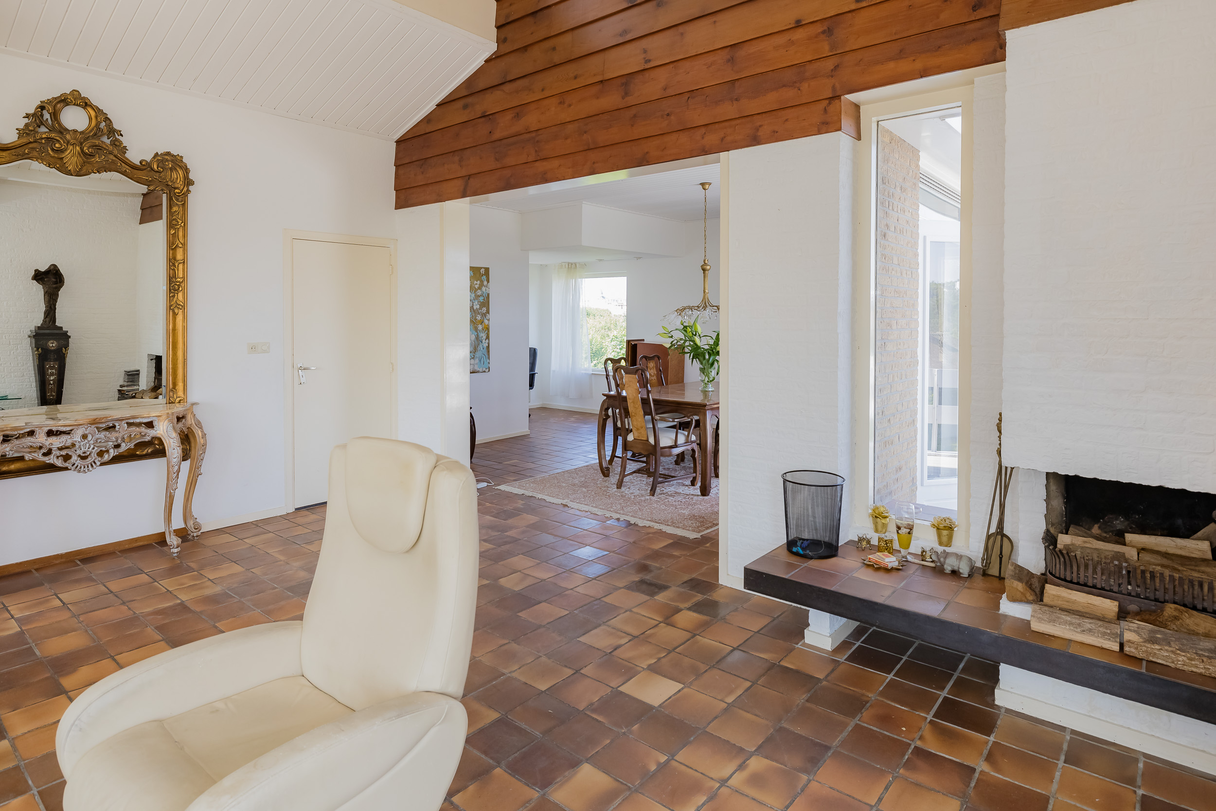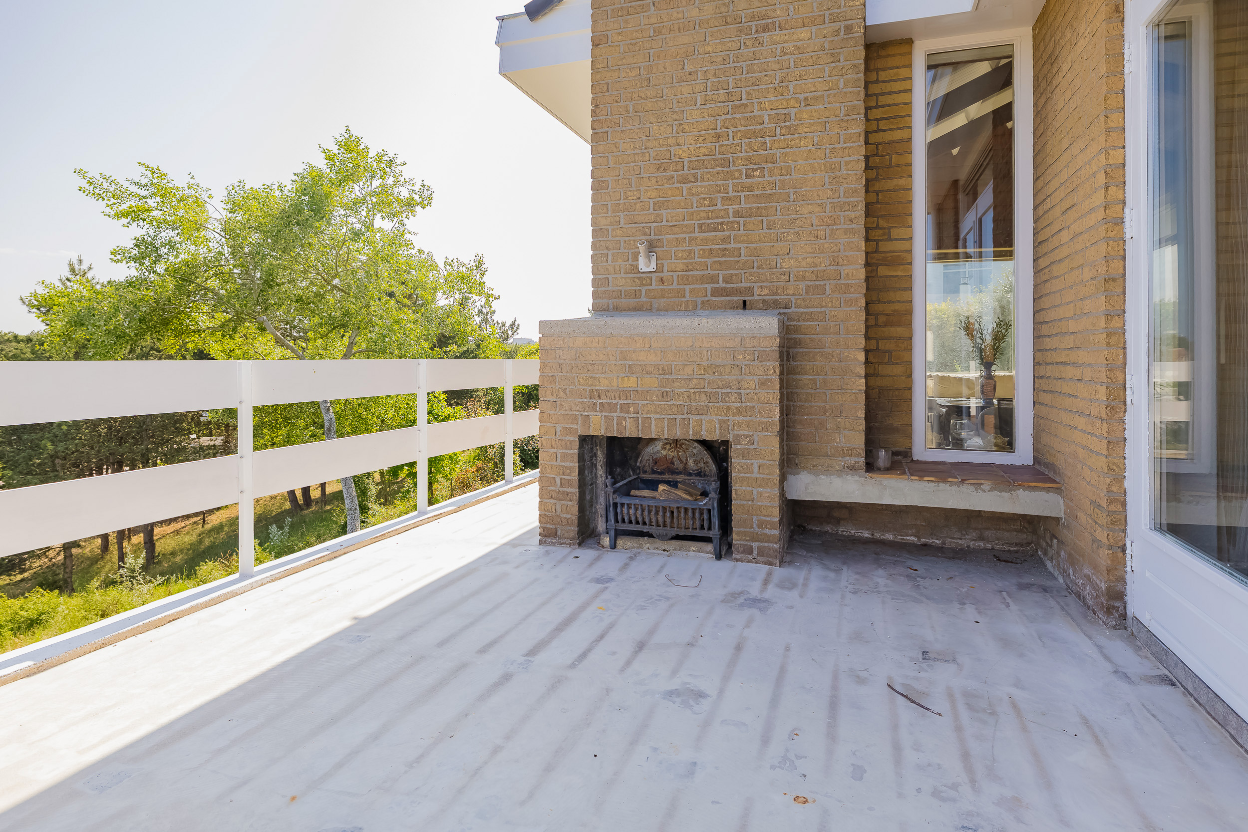 The villa offers a spacious living room with large windows, allowing natural light to flood in abundantly. From the living and dining room you have direct access to a large and sunny terrace, complete with an attractive outdoor fireplace - perfect for long summer evenings or cozy winter moments outside.