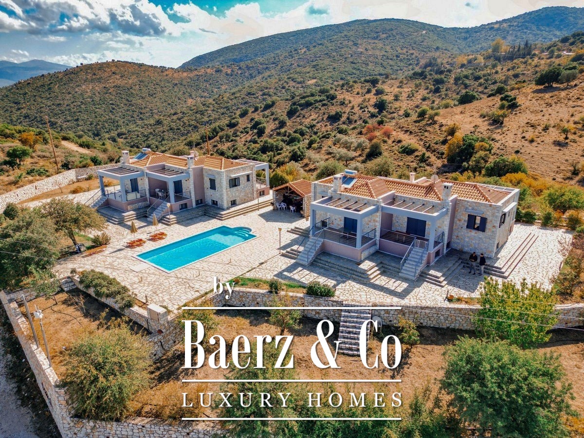 Bedroom suites vary: two villas contain two master bedrooms and a bathroom, while two others offer three bedrooms, including a master, and two bathrooms each. Across all, the total is six bedrooms and twelve bathrooms, quietly supporting comfort and privacy. Security alarm, autonomous heating, fan coil systems, air conditioning, and a solar water system are integrated discreetly for modern ease. The complex is 11 km from Astros, 15 km from the sea, and 44 km from Nafplio, situating it as a tranquil retreat with strategic access. For those seeking a luxury villa for sale in Oreini Meligou, this enclave stands as a testament to restrained elegance and investment potential.