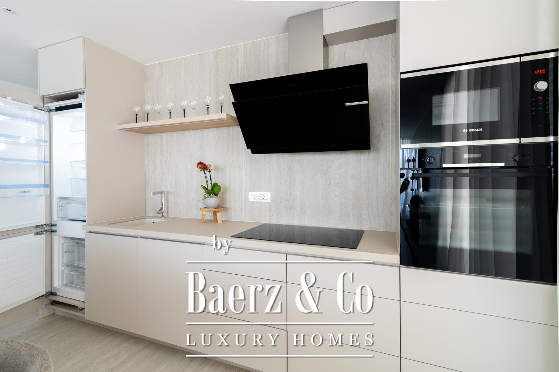 Light fills the open-plan living area where kitchen, dining, and lounge flow seamlessly onto a covered terrace with expansive sea views. The master bedroom enjoys its own private bathroom and balcony, while two further bedrooms share a well-appointed bathroom. Every element, from Bosch appliances to underfloor heating and air conditioning, prioritizes comfort and quality. The apartment extends its atmosphere of ease with two parking spaces, a private storage area, and access to a heated saltwater pool, sauna, and gym.
