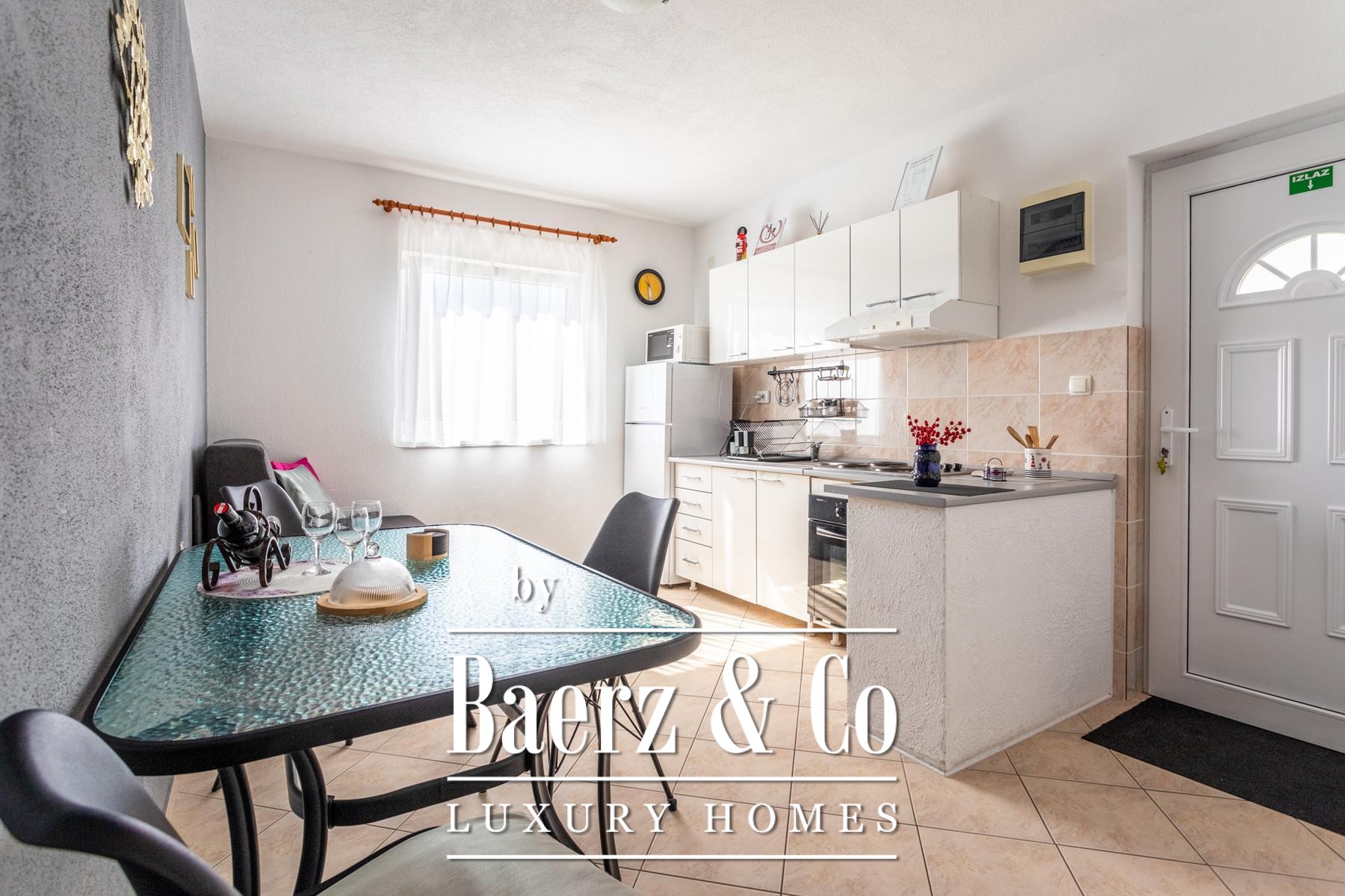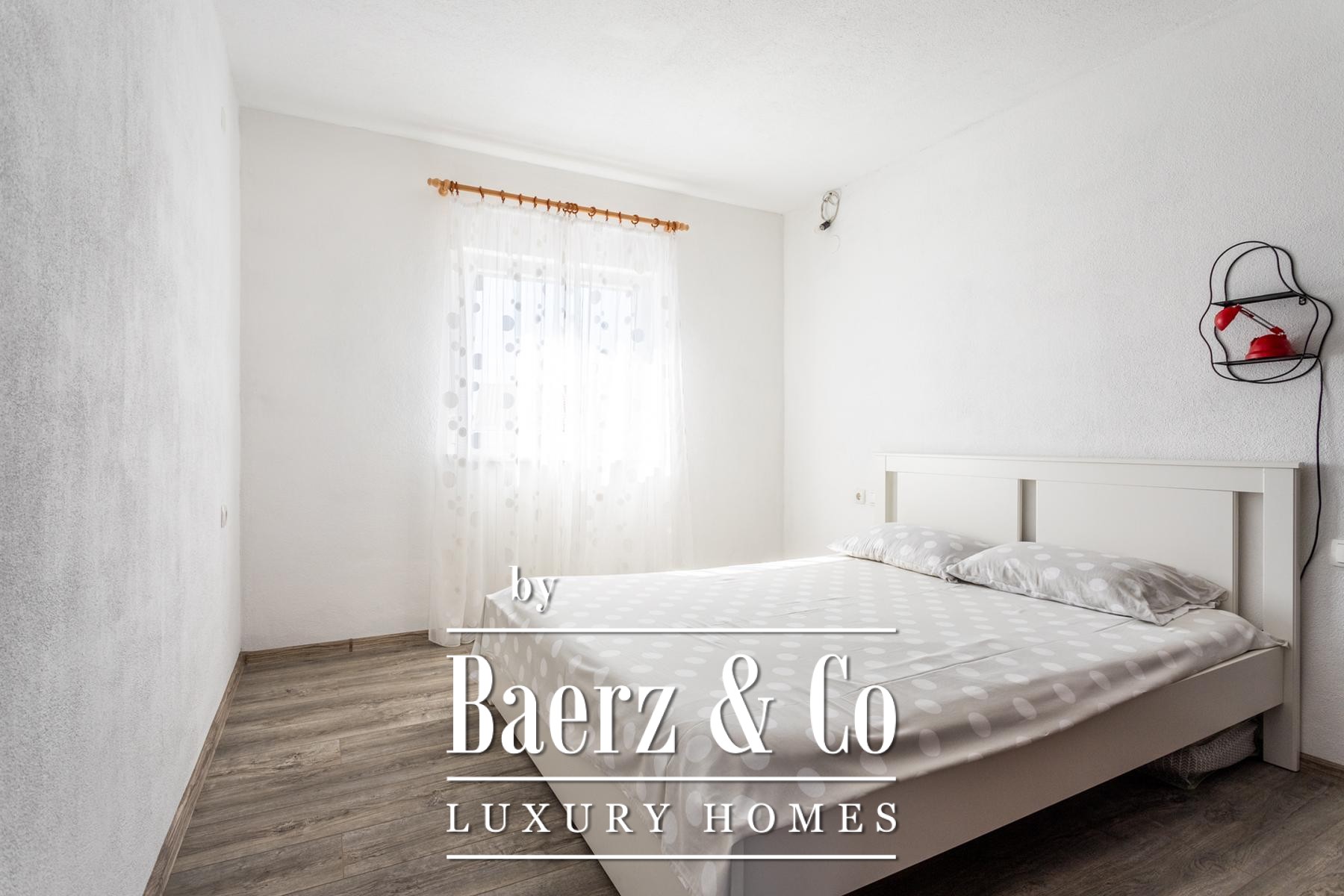 Ground floor: comprises a spacious one-bedroom apartment and a beautifully landscaped yard. The apartment includes a living room, kitchen with dining area, a large bedroom, bathroom, and a covered terrace with a dining table.Outdoor space features a well-maintained Mediterranean garden with olive trees, rosemary, grapevines, palms, and a variety of flowers, creating an ideal setting for relaxation. There is also an outdoor kitchen equipped with a fireplace, sink, and oven - perfect for gatherings in the shade of the grapevine.The apartments face east, south, and west, ensuring plenty of sunlight throughout the day, while the higher floors offer beautiful sea views.Five parking spaces are available directly next to the house.Further information available upon request.