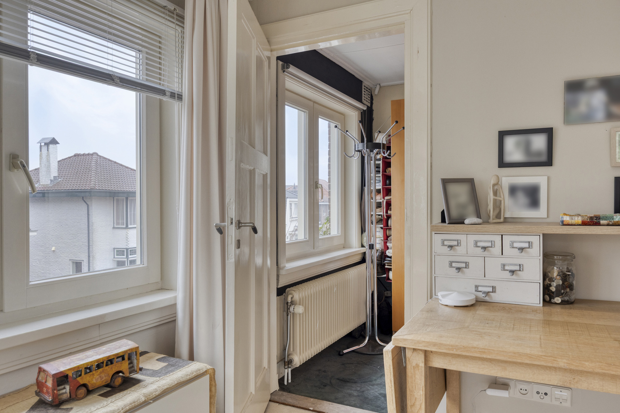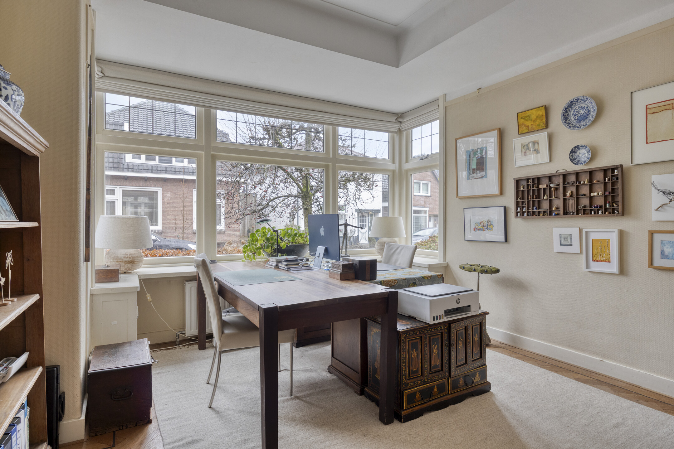 Begane grond: Na de overdekte entree kom je via de vestibule met garderobe binnen in een ruime hal. De hal geeft toegang tot alle ruimtes op de begane grond; de eerste kamer met een mooie erker momenteel ingericht als thuiskantoor; het toilet met fonteintje; de woonkamer; de woonkeuken en het achter portaaltje. Het mooie trappenhuis, met bordestrappen geeft toegang eerste etage