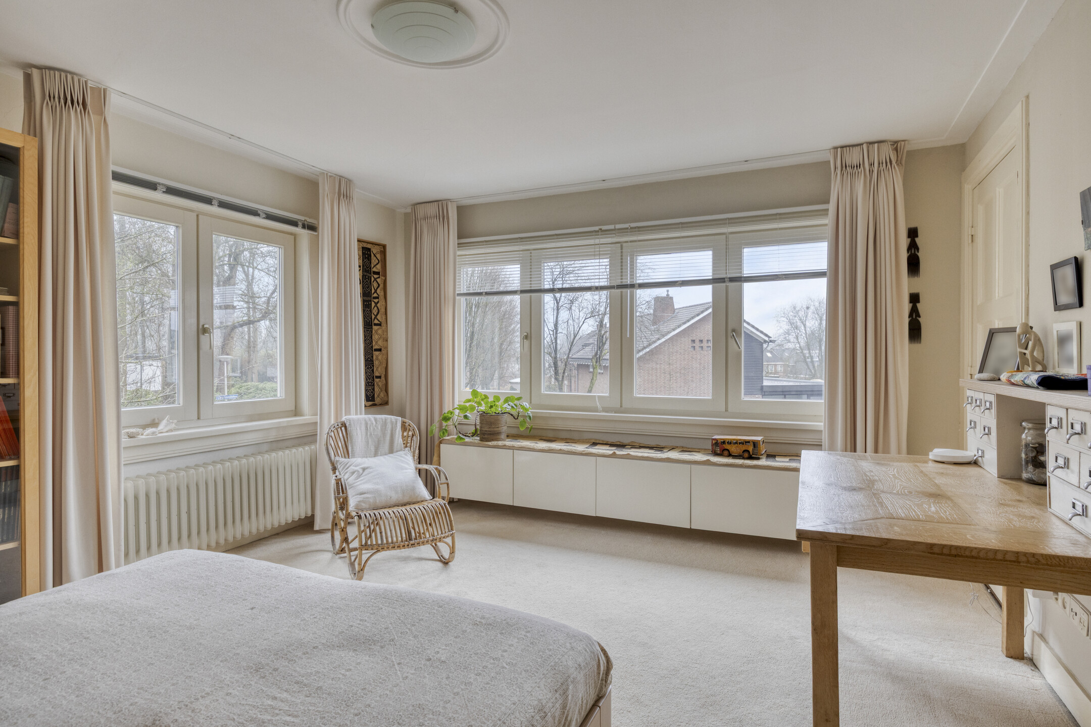 De ruime woonkamer heeft door de vele raampartijen en de karakteristieke erker een prachtige lichtinval. Vanuit de aangrenzende serre is er blijvend vrij uitzicht over het weiland. Zowel vanuit de woonkamer als vanuit de serre openen openslaande tuindeuren naar de royale tuin.