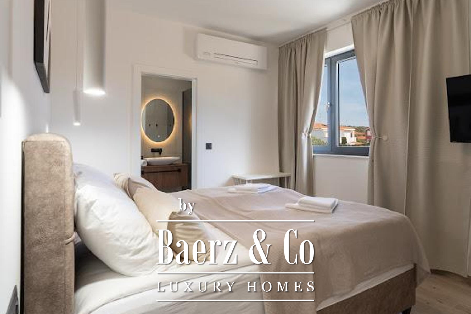 Pag Mandre, semi-detached house with swimming pool is located on a plot of 465 m2.The house consists of a ground floor and an upper floor, with a total area of 220 m2.On the ground floor there is an open-concept kitchen, dining room and living room, a bedroom with a bathroom, a guest toilet, a laundry room and a storage room.Internal stairs lead to the upper floor where there is an entrance area, three bedrooms with bathrooms and a spacious terrace.It is located 350 meters from the sea and the beach.Equipment:AB constructionflat roof